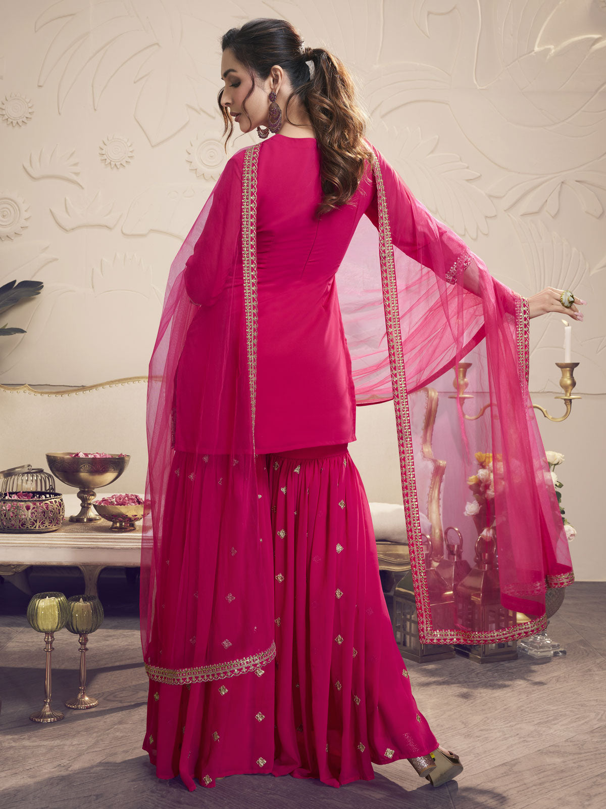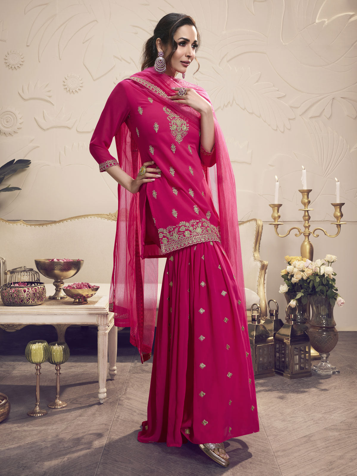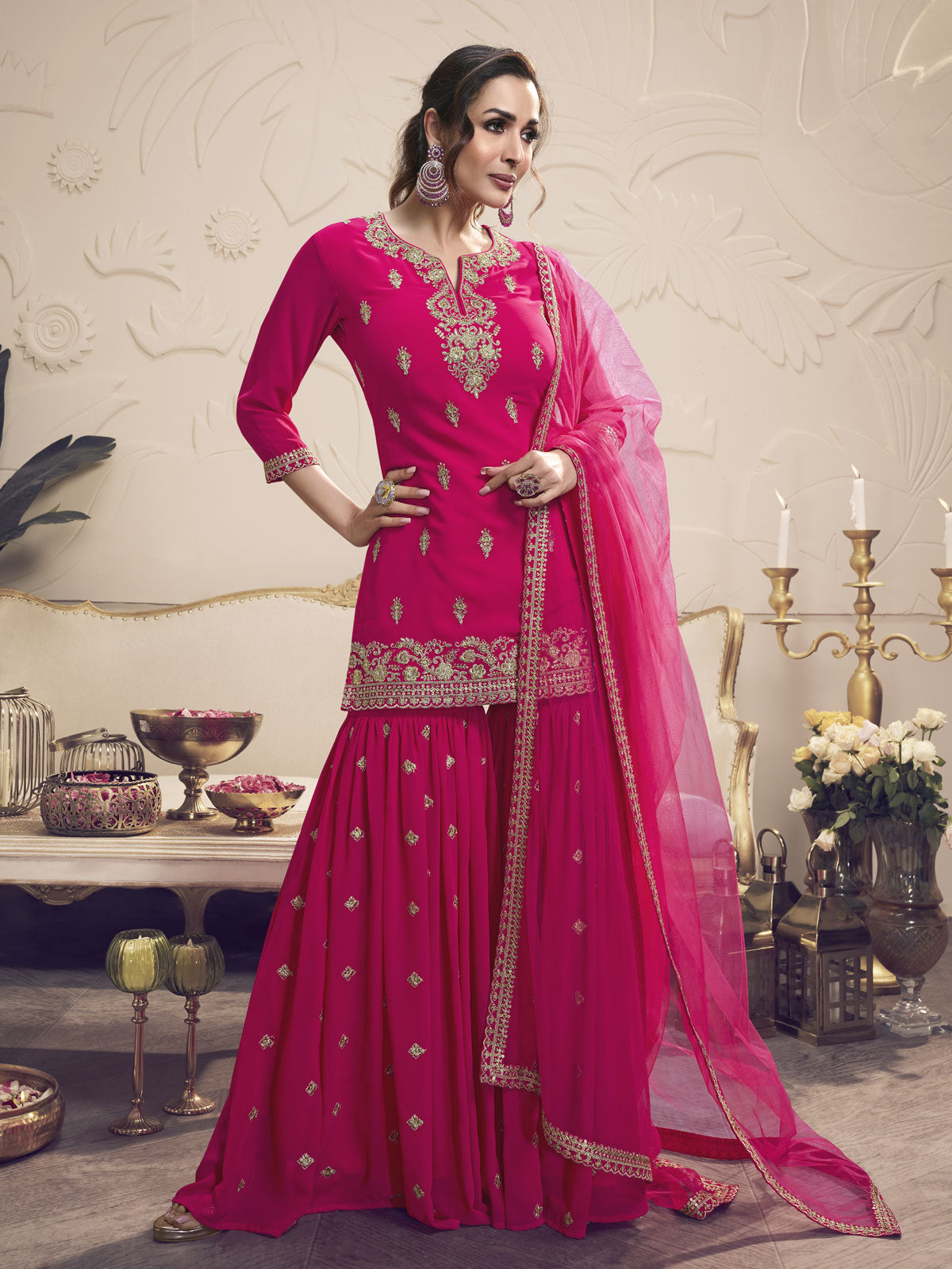 Elegance meets comfort with our Malaika Arora Floral Embroidered Regular Thread Work Kurti. The pink embroidered Sharara with a partially elasticated waistband provides a stylish and relaxed fit. Made with Georgette and Crepe, this set also includes a Net Dupatta. Perfect for any occasion, dry clean for best results.??
