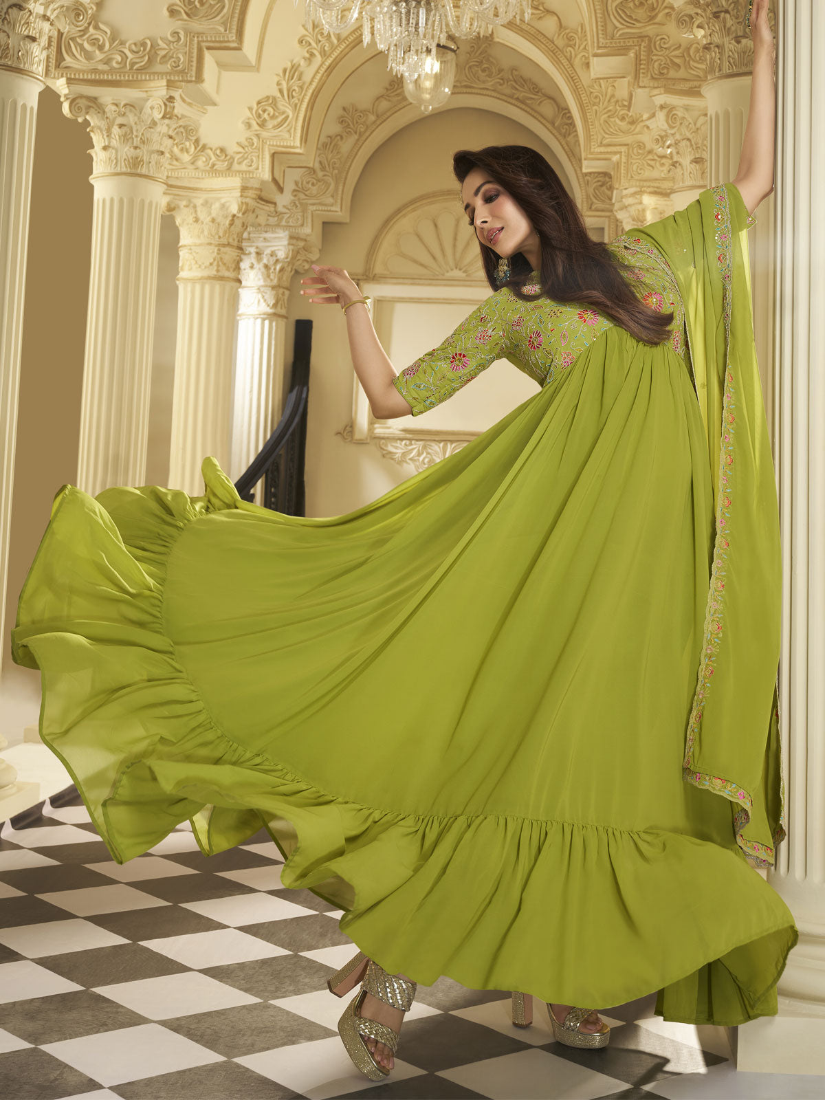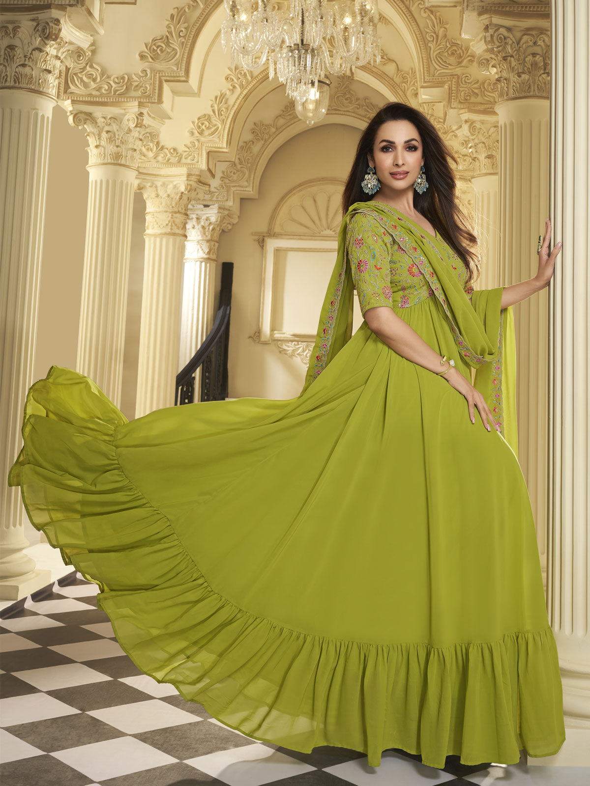 Discover elegance and style with our Malaika Arora Women Floral Georgette Anarkali Kurta. Featuring a beautiful green color and striped pattern, this kurta boasts a round neck and short, sleeveless design for a modern touch. The anarkali shape with high slit style and zari details add a touch of tradition, while the calf length and flared hem create a flattering silhouette. Made from machine-weave regular georgette and featuring a crepe inner lining, this kurta is both comfortable and easy to maintain with dry cleaning. Elevate your wardrobe with this stunning piece.