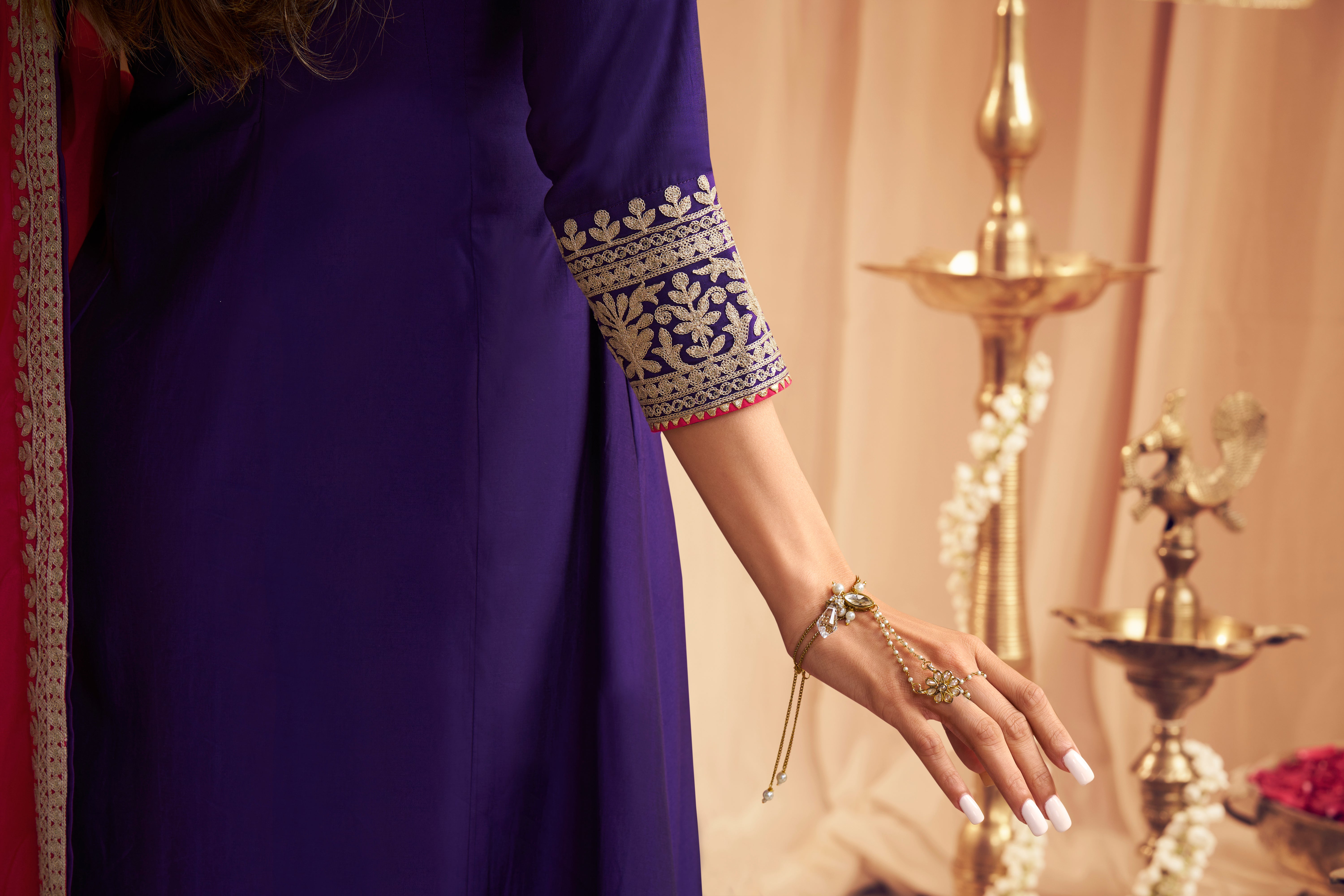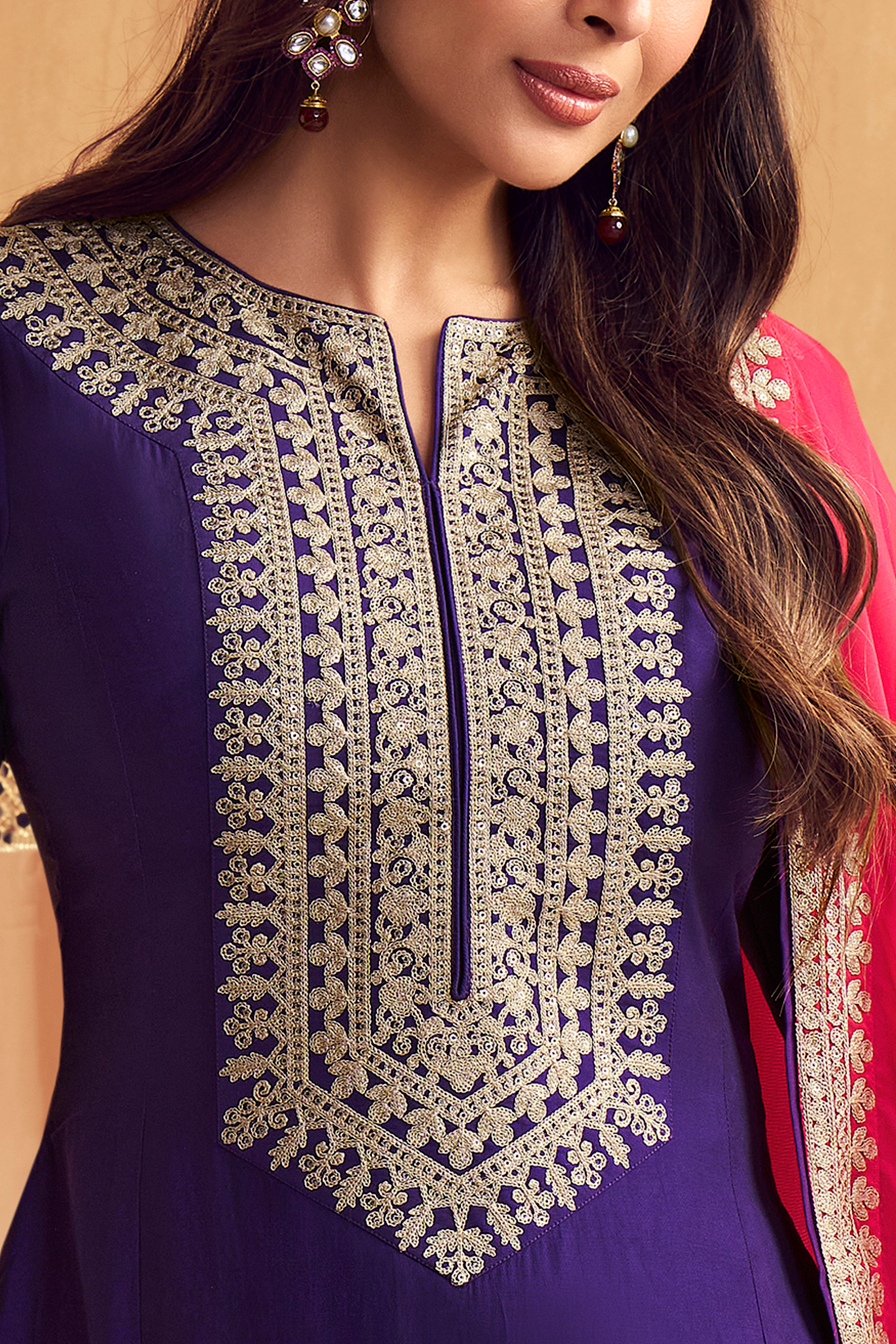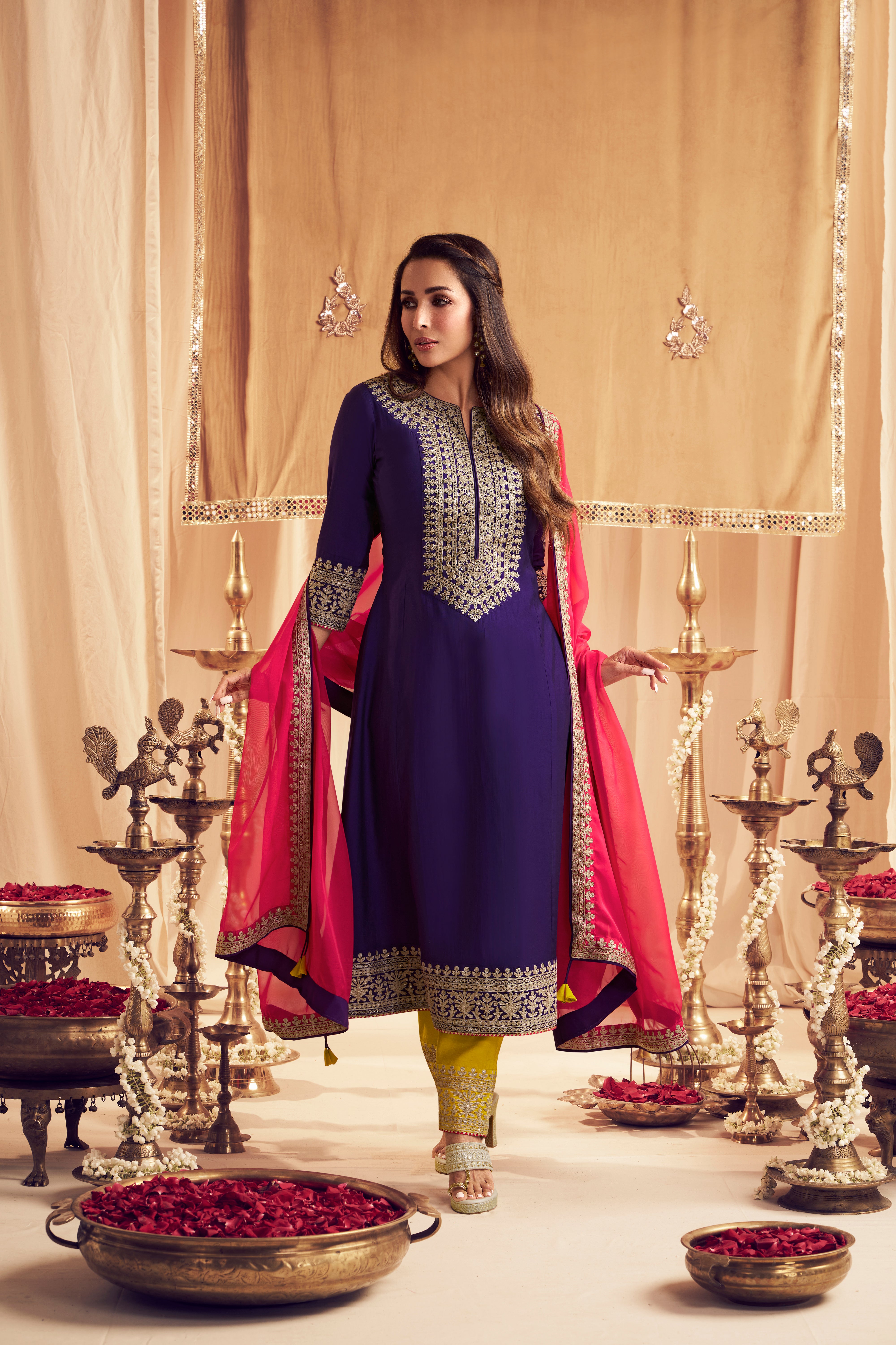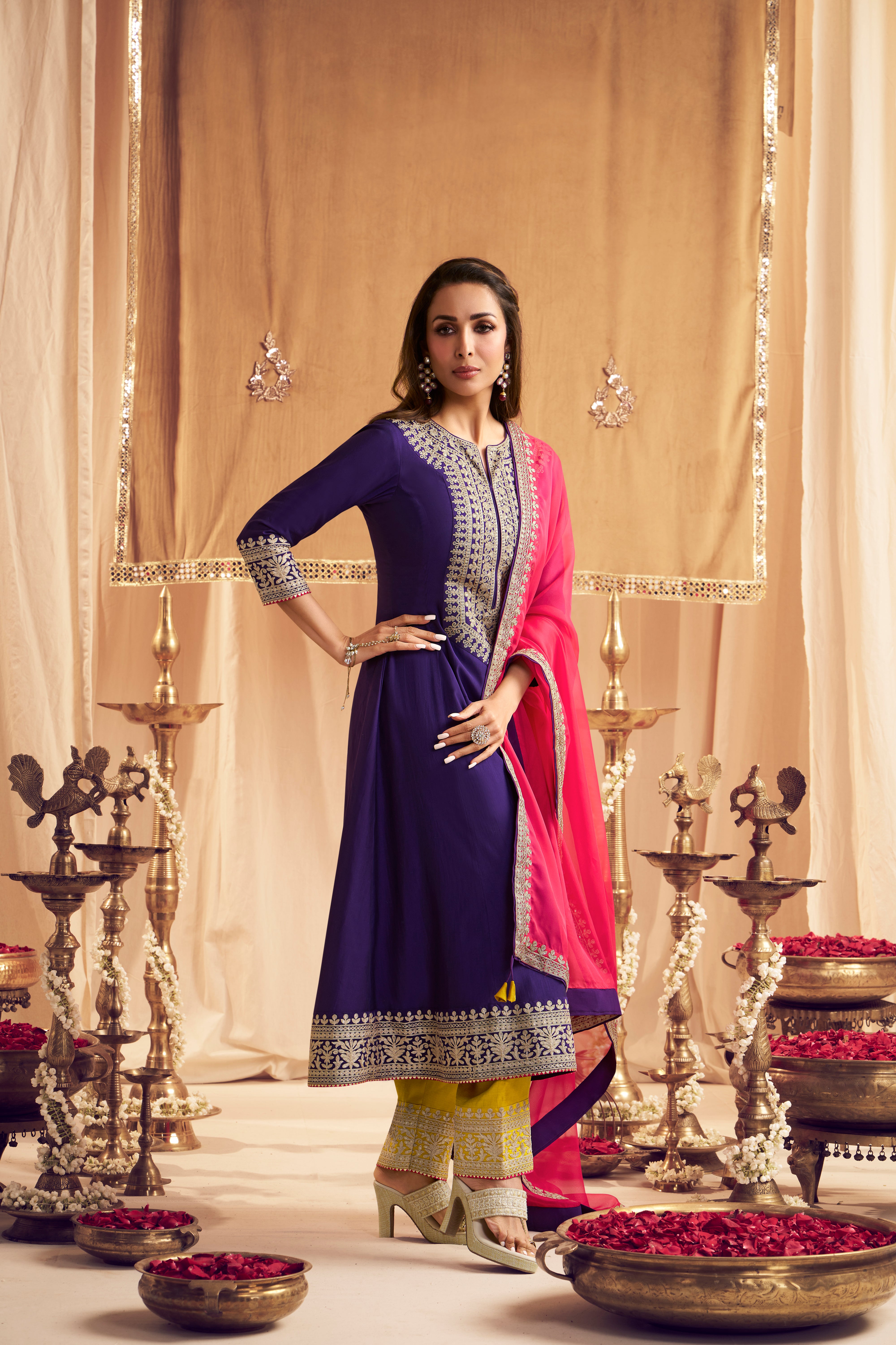 Elevate your style with Malaika Arora's Floral Yoke Design Kurta with Trousers & Dupatta. The purple yoke design adds a touch of elegance, while the A-line shape and regular fit ensure comfort. The silk blend fabric and embroidered details enhance the overall look. Perfect for any occasion.