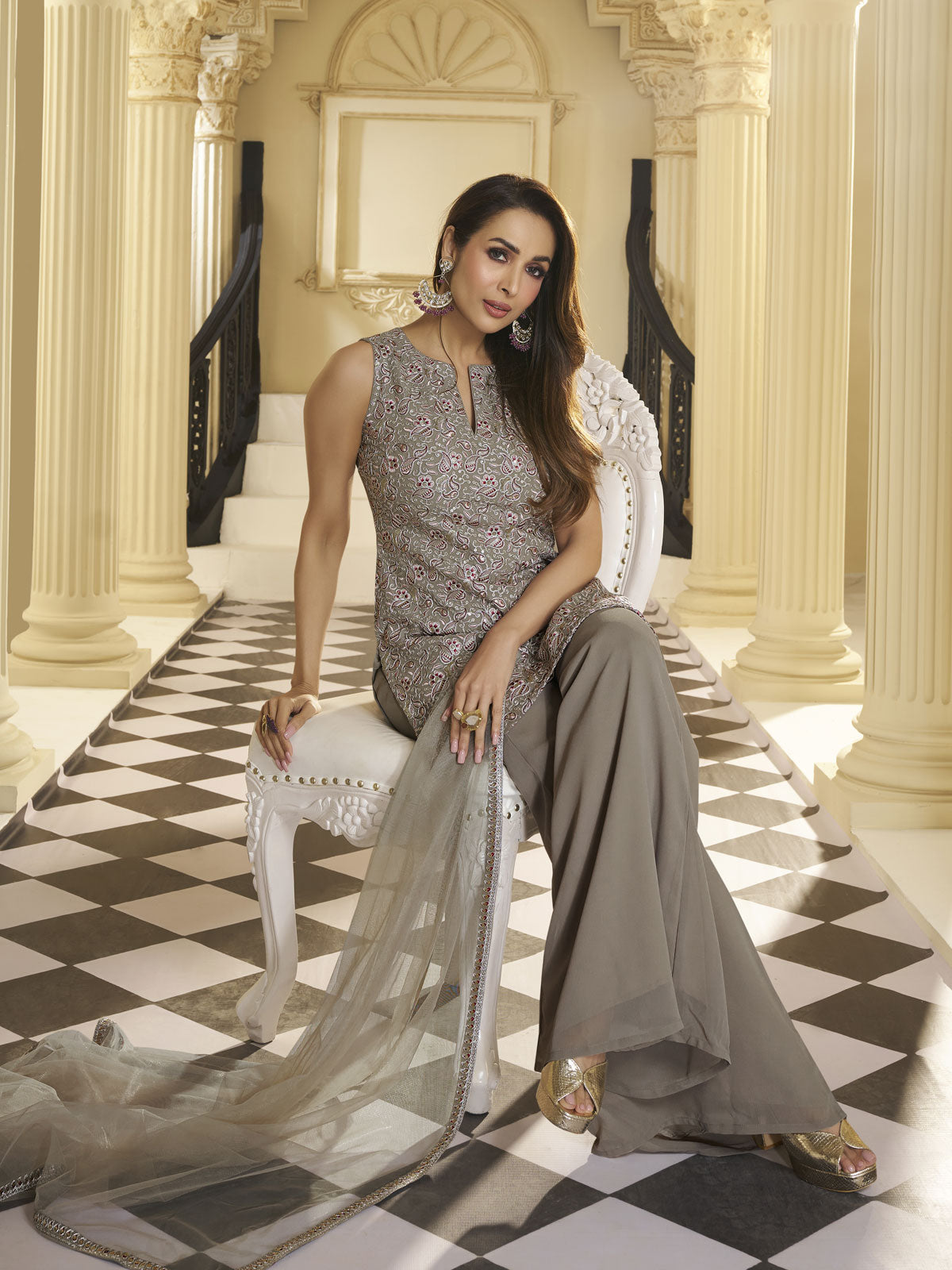 Elevate your wardrobe with the exquisite Malaika Arora Paisley Embroidered Kurti with Palazzos & Dupatta. The georgette machine weave fabric ensures a comfortable fit, while the embroidered paisley design exudes elegance. Slip into the straight, sleeveless kurti with no sleeves and a round neck for a sophisticated look. The solid palazzos feature a partially elasticated waistband for easy wear, and the net dupatta adds a touch of glamour.
