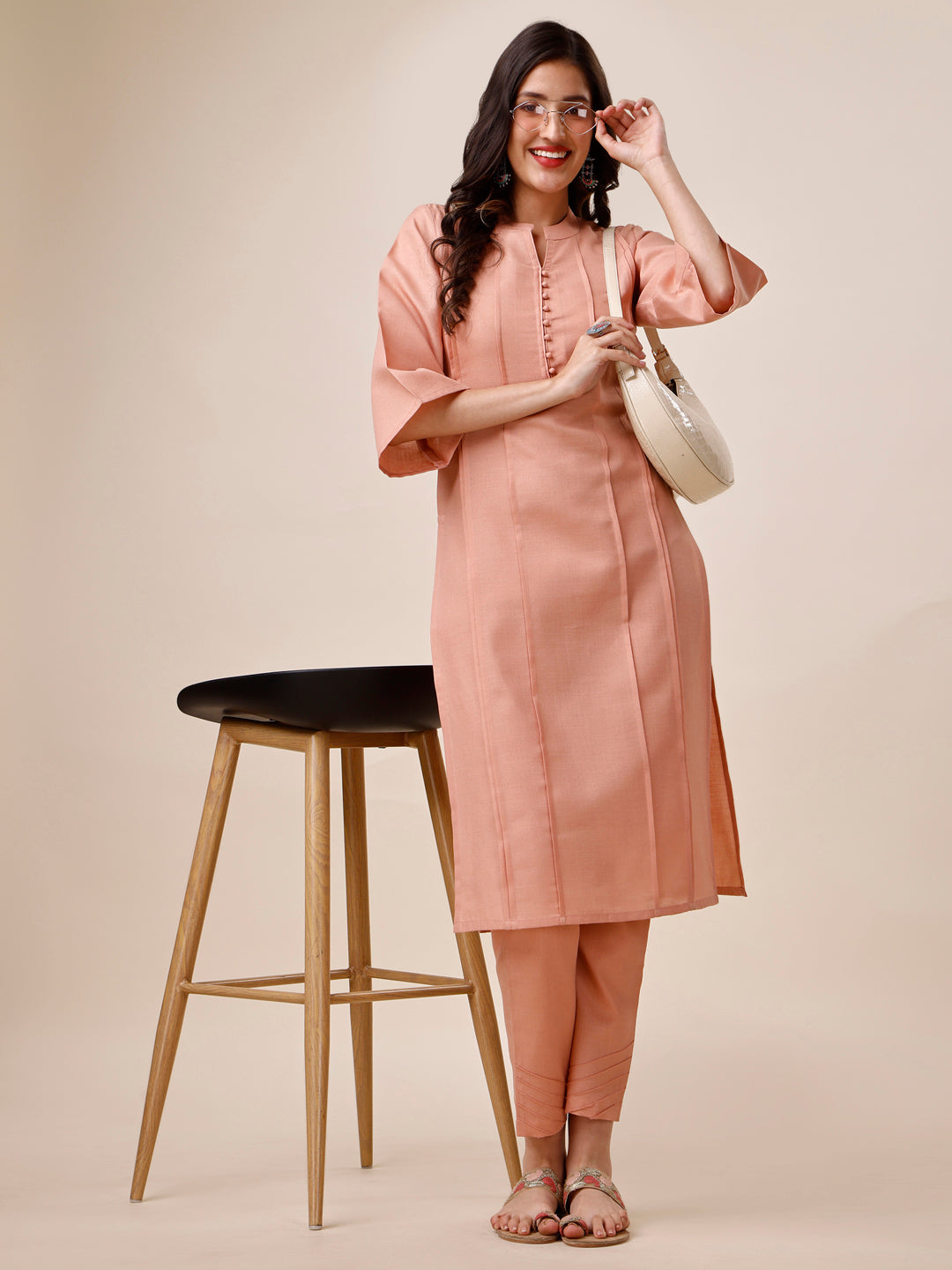 This peach-colored Kurta with trousers set features a solid design and straight shape for a flattering fit. The mandarin collar and flared sleeves add a touch of elegance, while the calf length and straight hem offer comfort and style. Made with a cotton blend fabric, this set is perfect for any occasion.