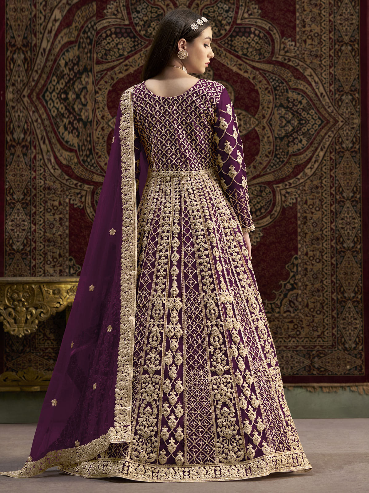 Step into the spotlight with our Purple All Over Embroidered Net Wedding Anarkali Gown by Empress. Made with high-quality net, this gown boasts intricate zari and sequin details that exude grace and sophistication. Pair with matching bottom and dupatta, and elevate your traditional look with this stunning ensemble.