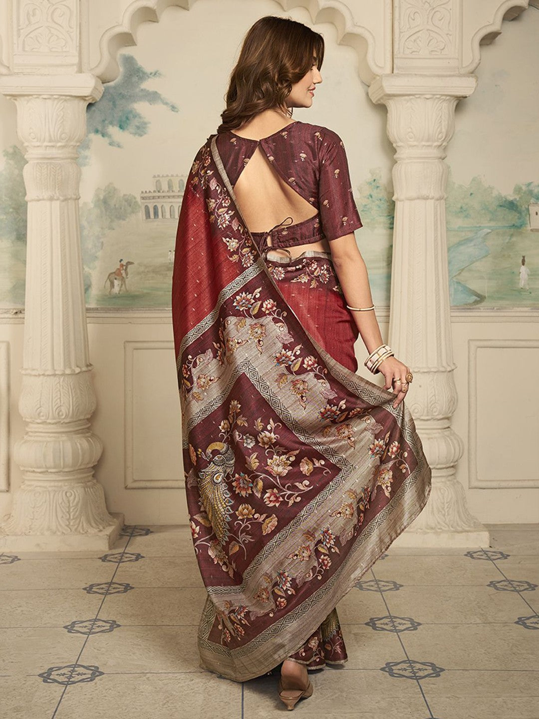 This Maroon and Beige Floral Woven Design Zari Saree showcases a beautiful floral print complemented by a woven design border with intricate zari detail. Made from high-quality fabric, it offers a graceful and luxurious drape. Complete with an unstitched blouse piece, this saree is perfect for any occasion.