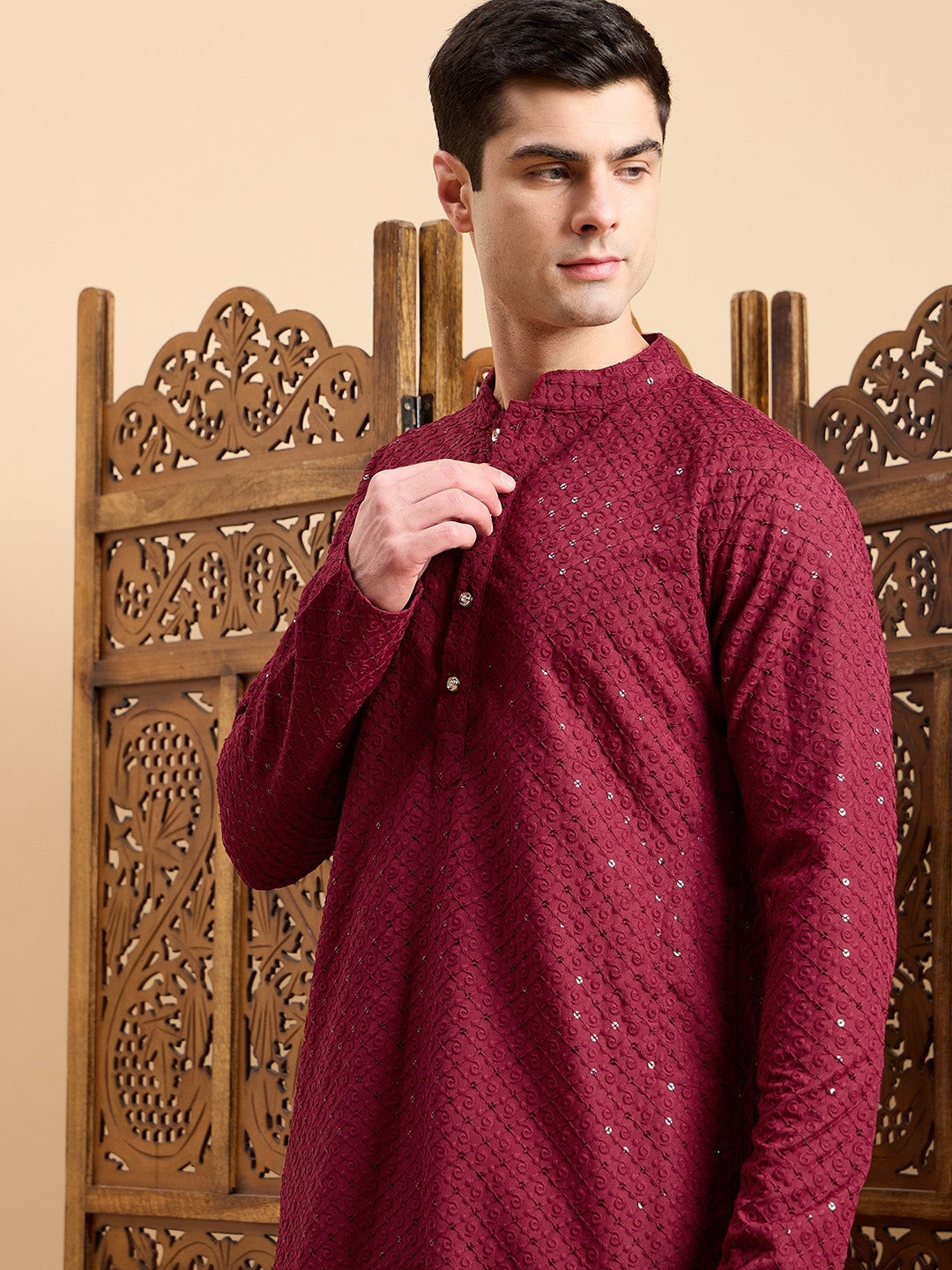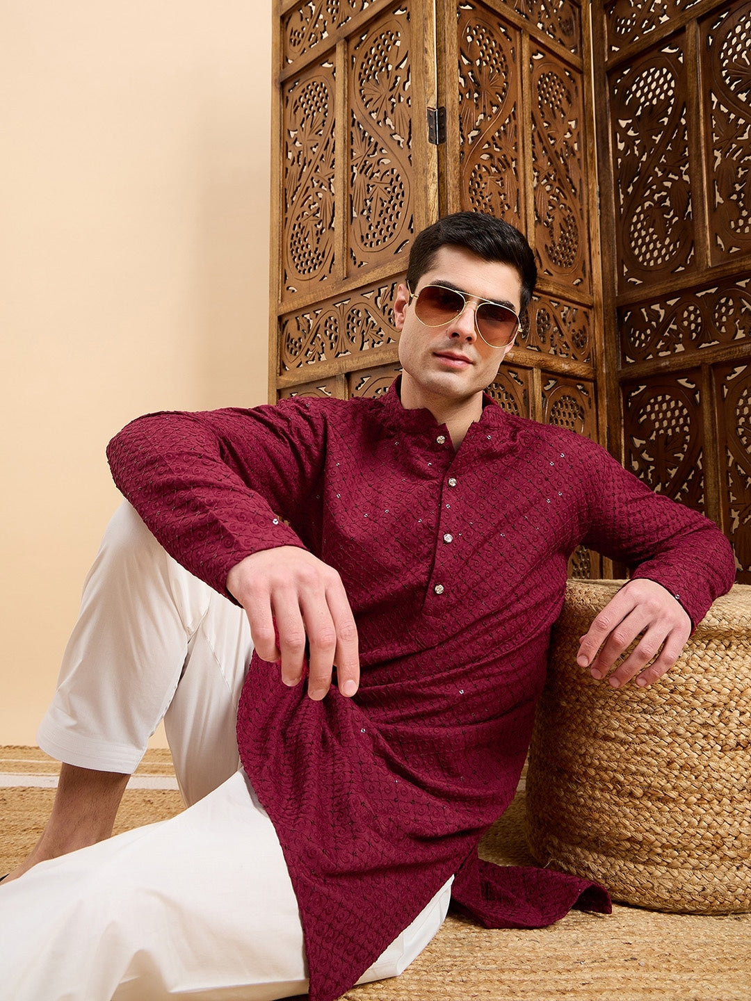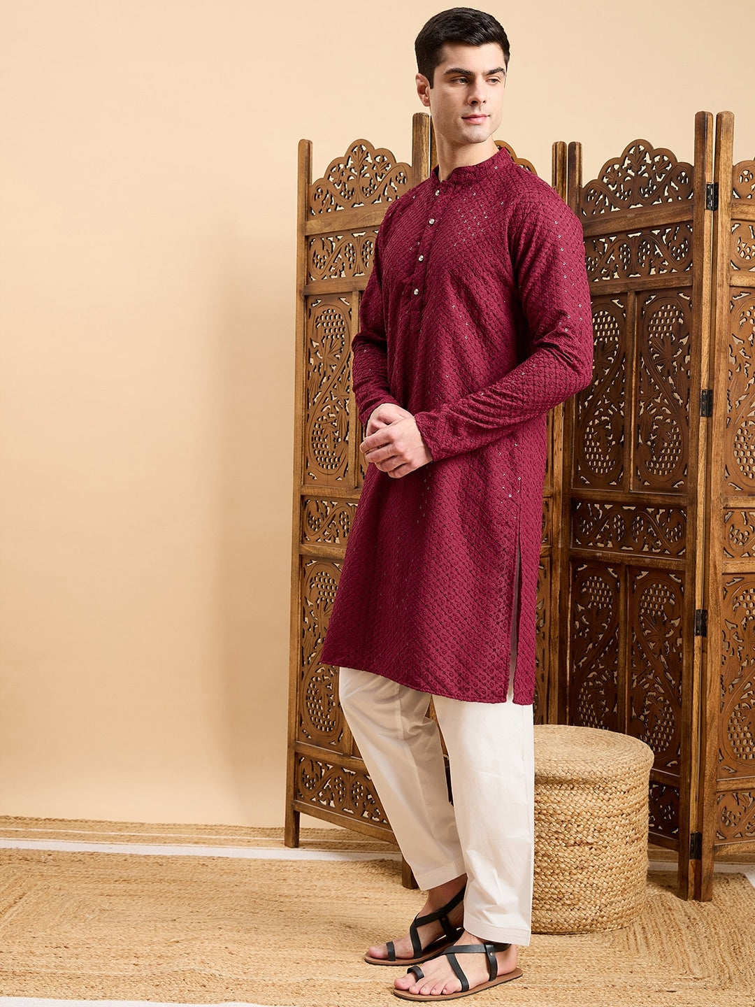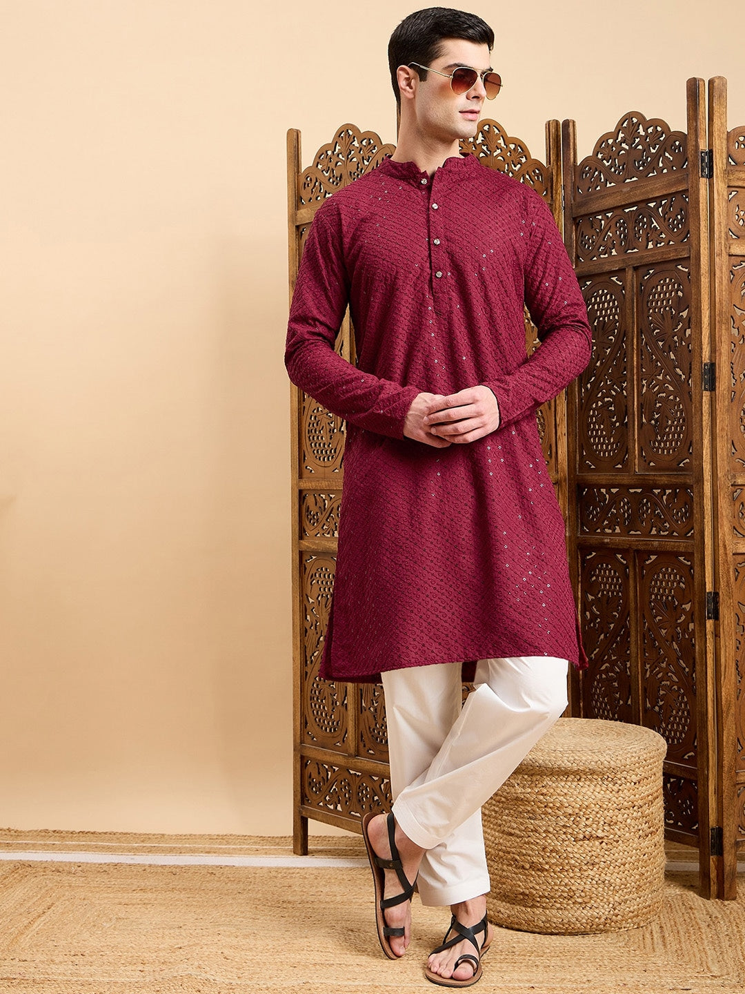 This maroon kurta boasts a mandarin collar and long, regular sleeves. Its intricate checked embroidery and sequined detail add elegance to its straight shape and knee-length hem. Made from machine-woven regular cotton, it offers a comfortable yet stylish option for any occasion.