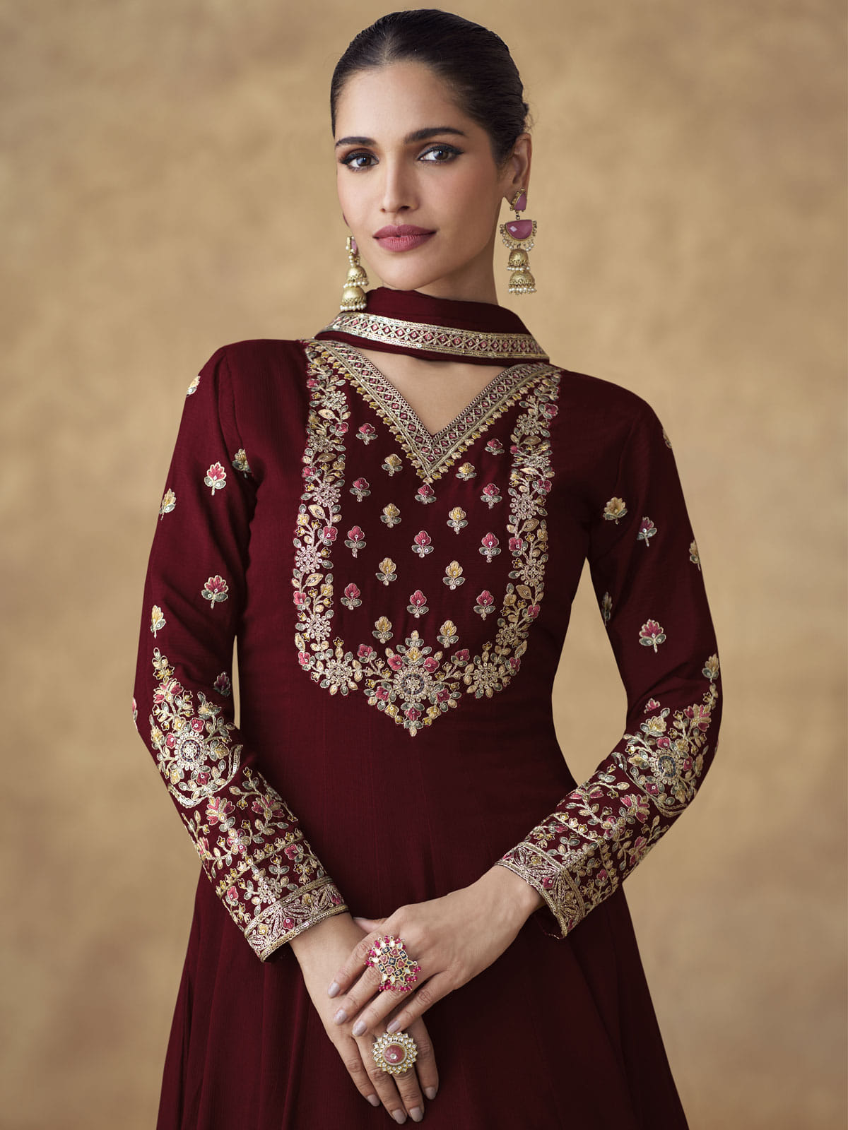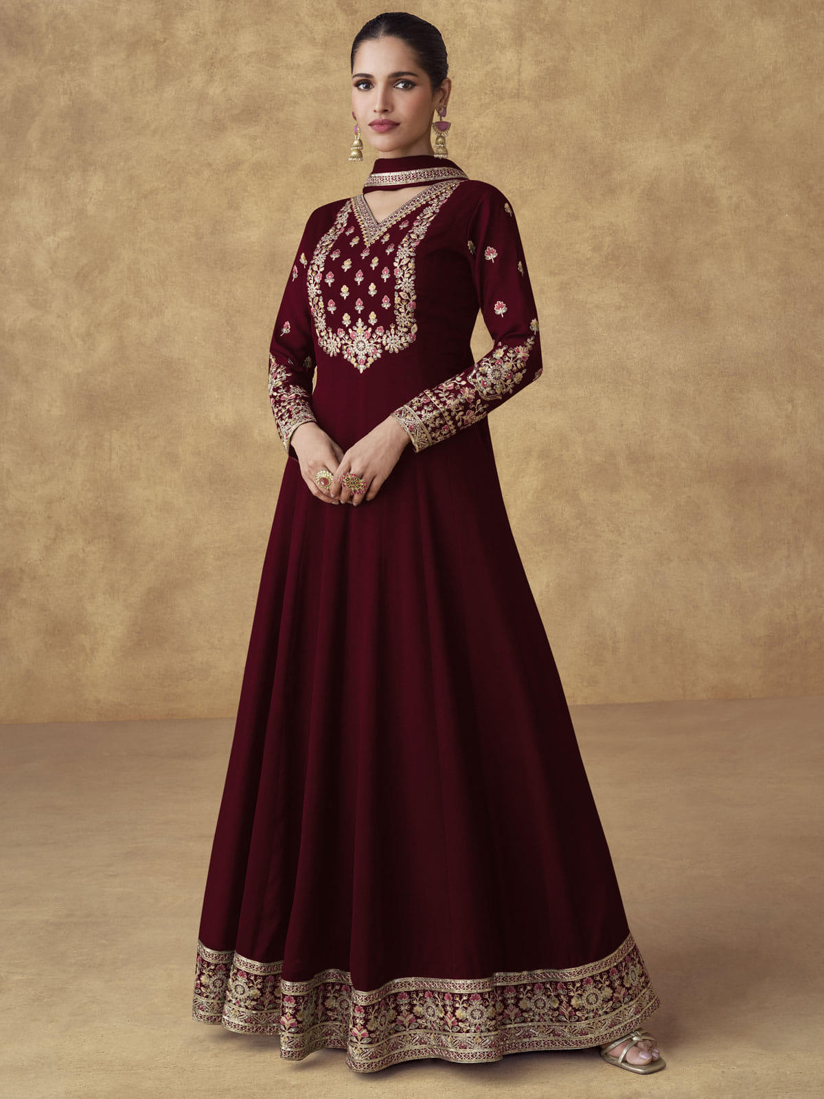 Elevate your look with our Embroidered Maroon Chinnon Silk Festive Anarkali Suit. Crafted with high-quality Premium Chinnon Silk, this suit exudes elegance with its stunning sequin and Zari threads work. Complete with a matching bottom and embroidered dupatta, perfect for weddings and festivals. Style it with traditional jewelry for a sophisticated look.