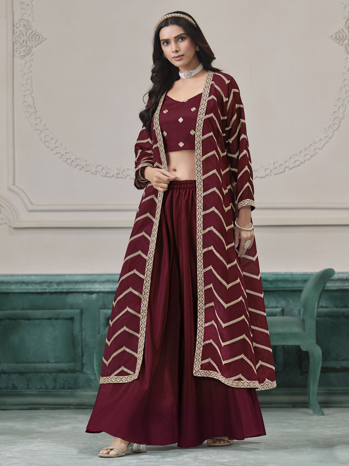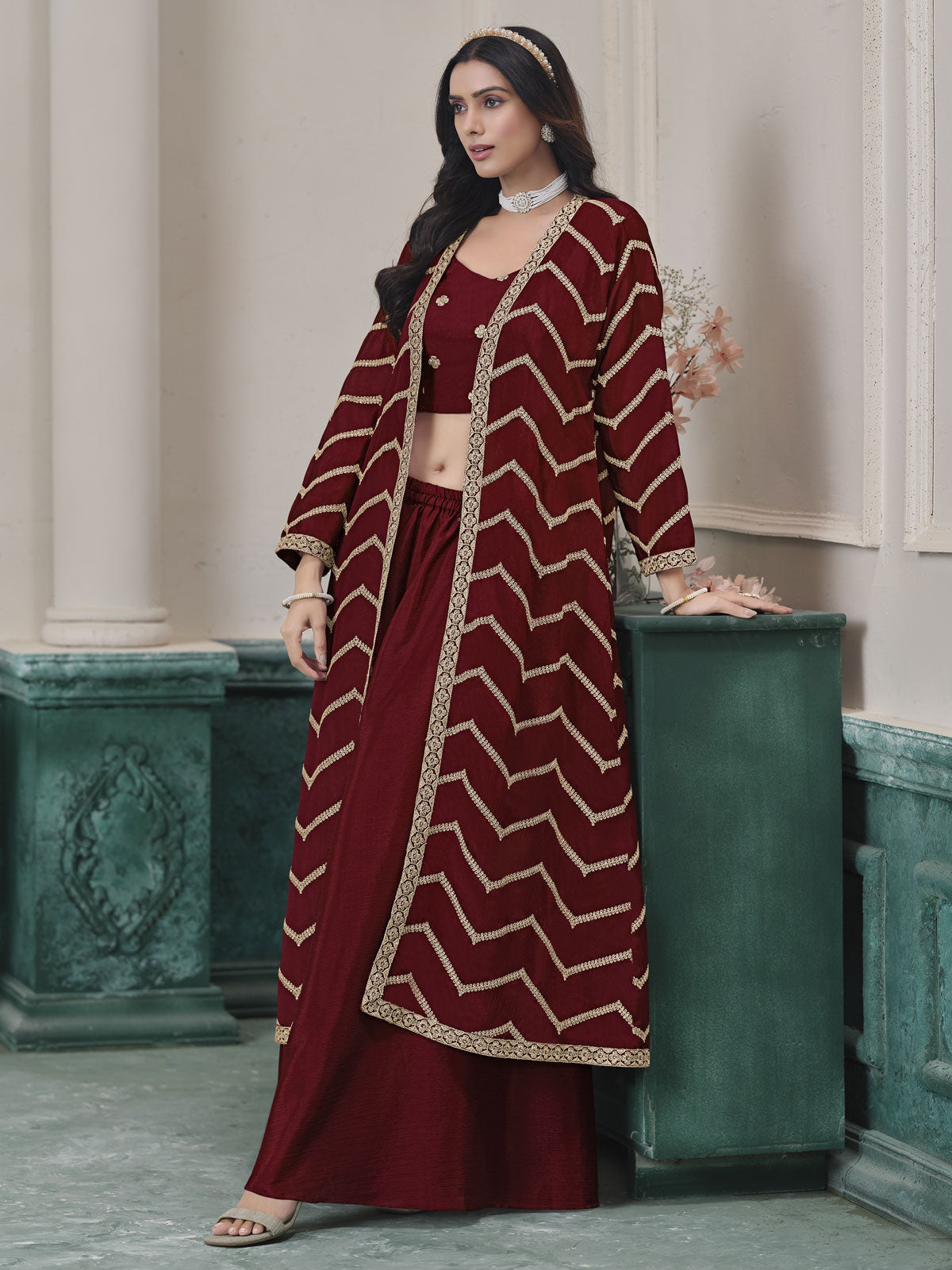 This maroon chinon indowestern ensemble features a coordinated sleeveless choli paired with an elegant layered jacket, both rendered in the same rich fabric for visual cohesion. The expertly tailored natural waist construction delivers a flattering silhouette while maintaining comfort throughout wear. Chinon's inherent lightness creates graceful movement without sacrificing the garment's polished aesthetic. The choli showcases a sharp V-neckline at the front, while the back features a softer rounded neckline—both cut to a measured depth that strikes an ideal balance for festive celebrations. This sophisticated layering approach makes the set versatile for multiple occasions while preserving the refined elegance expected of premium indowestern wear.