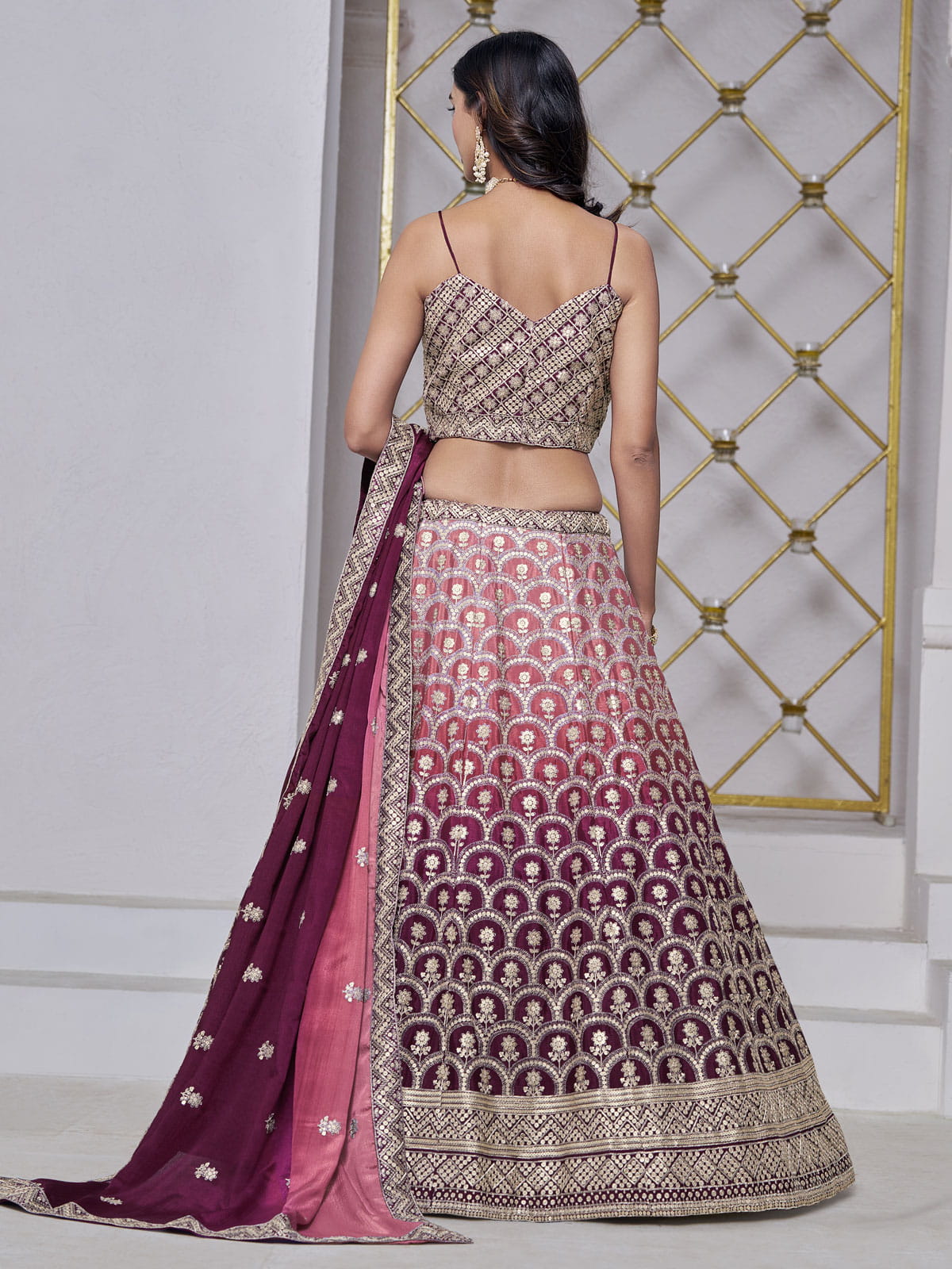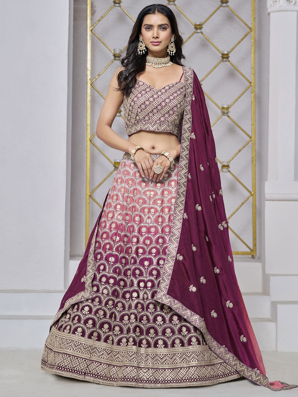 Embrace elegance and style with our Maroon Chinon Embroidered Lehenga Choli. Made with exquisite embroidered and sequins work, this attire exudes charm and grace. Perfect for special occasions, it comes with a matching choli and dupatta. Please note that there may be slight variations in color, fabric, and work. (Model images for reference only.)