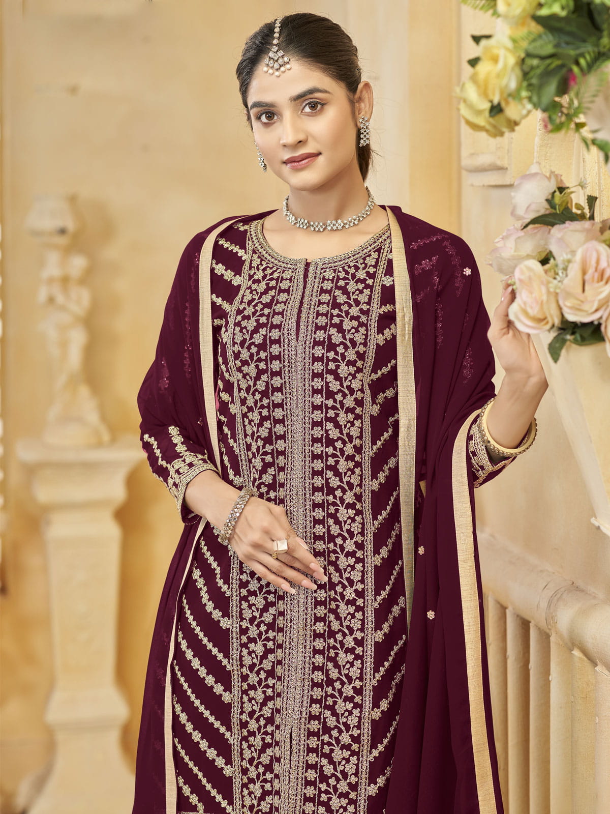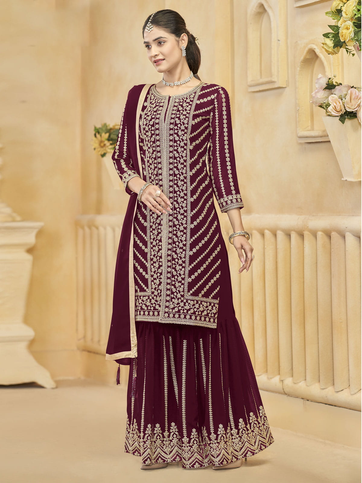 Elevate your style with Inddus' Maroon Embroidered Festive Sharara Suit, crafted from Faux Georgette for a chic and opulent look. Featuring intricate zari embroidery and shimmering sequins, this ensemble exudes grace and charm. The rich maroon hue adds to its regal appeal, making it a perfect choice for festive and party occasions. Complete your look with statement jewelry for a stunning presence.