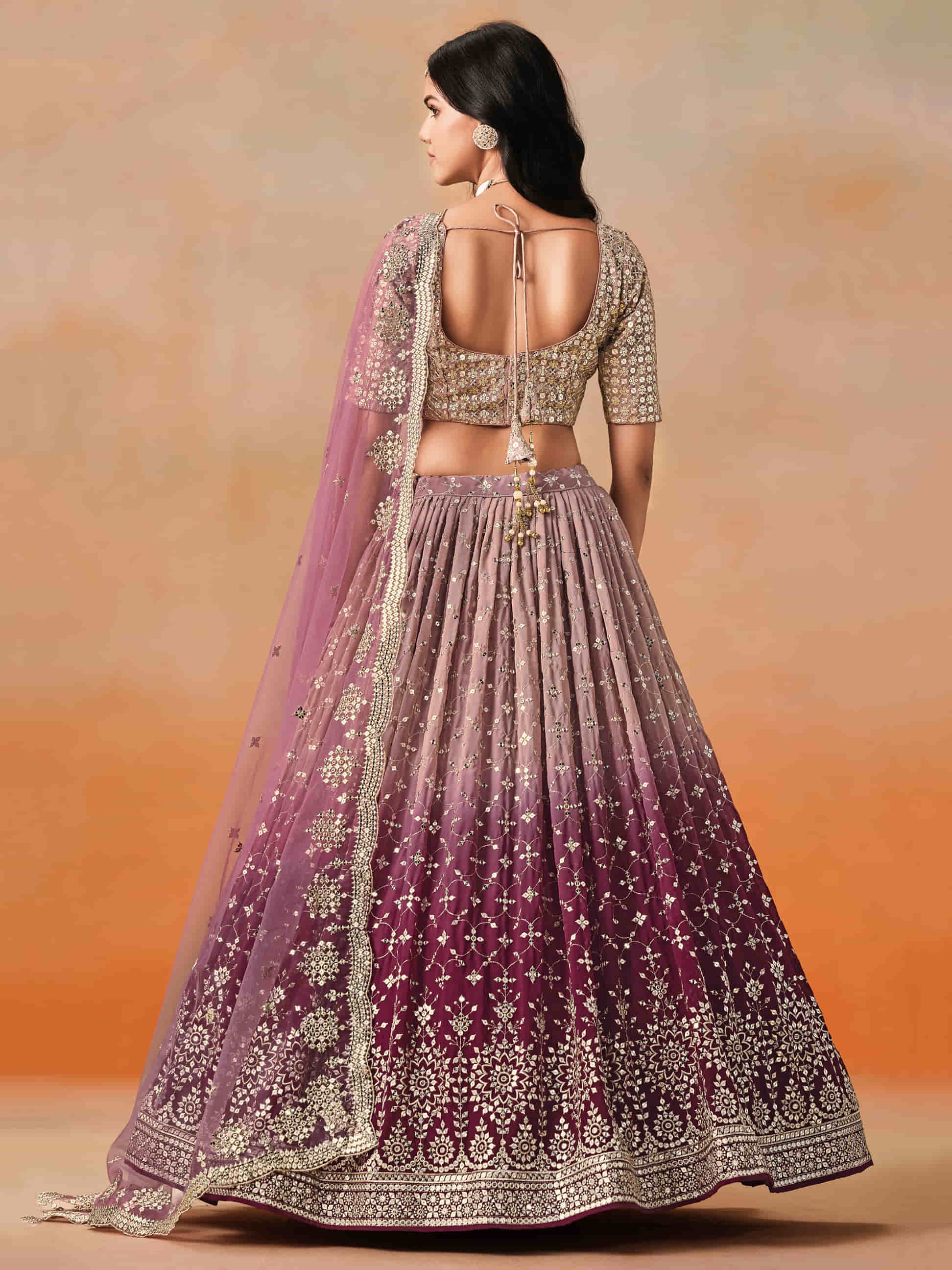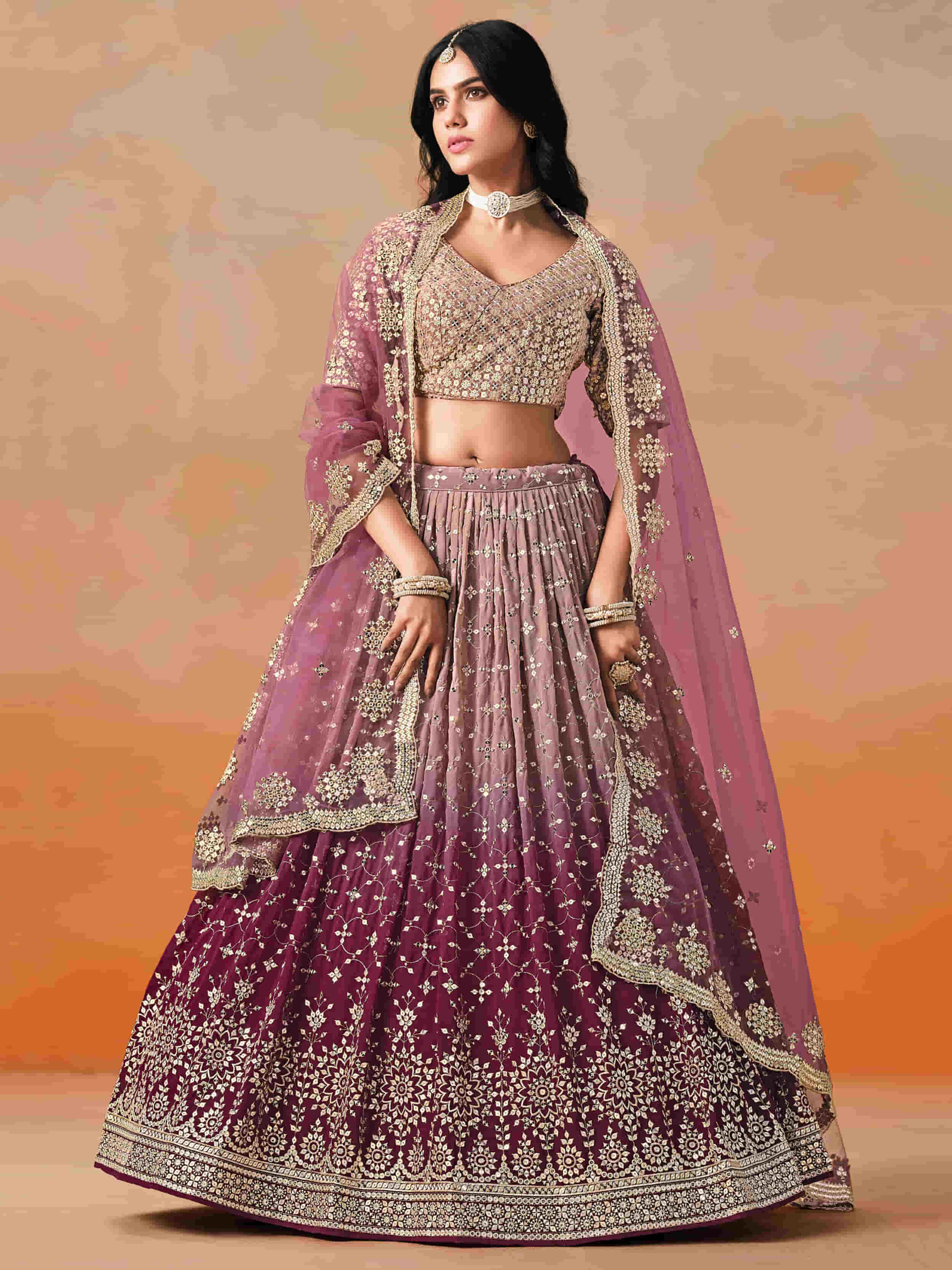 The maroon georgette lehenga features two-tone shading with zari embroidery and sequins work all over.