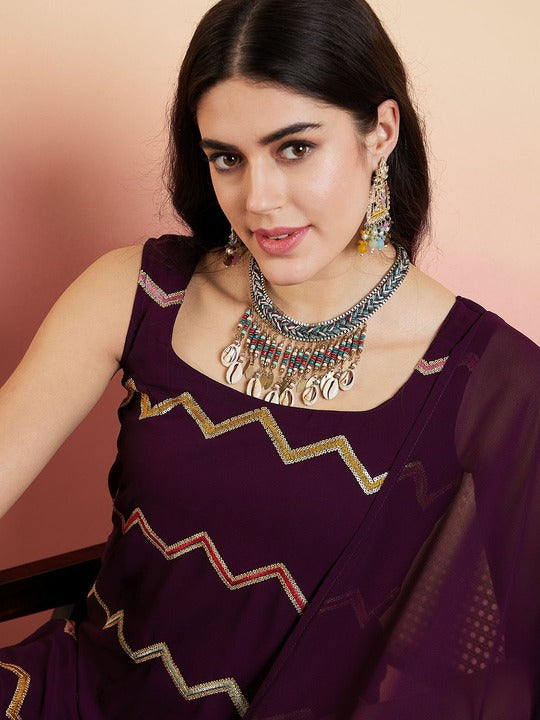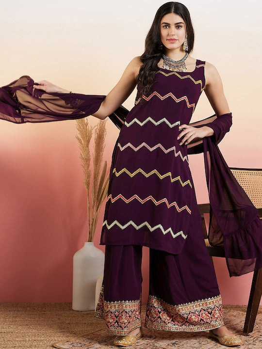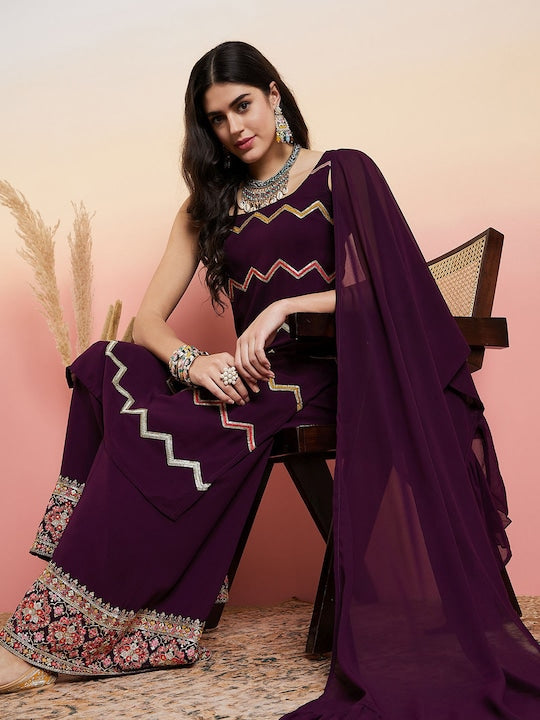 This maroon embroidered kurta set featuring ethnic motifs brings a touch of elegance to your wardrobe. Made with georgette fabric and detailed with thread work, it offers a comfortable fit with its regular style and straight shape. The set includes a dupatta and palazzos with an elasticated waistband for easy slip-on.