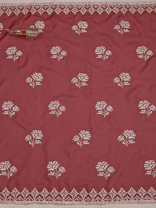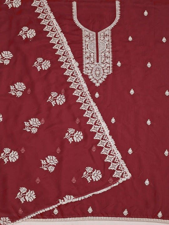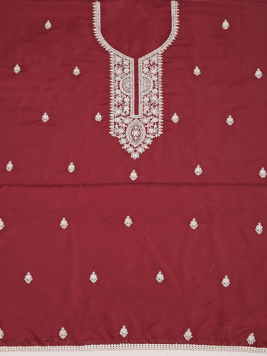 Get ready to stun in this Maroon Floral Embroidered Sequinned Unstitched Dress Material. The beautiful maroon and white embroidered kurta fabric features intricate details and stunning sequins, while the solid bottom fabric adds a touch of elegance. The matching dupatta with taping border completes the look. Please note, this product is unstitched for custom fitting.