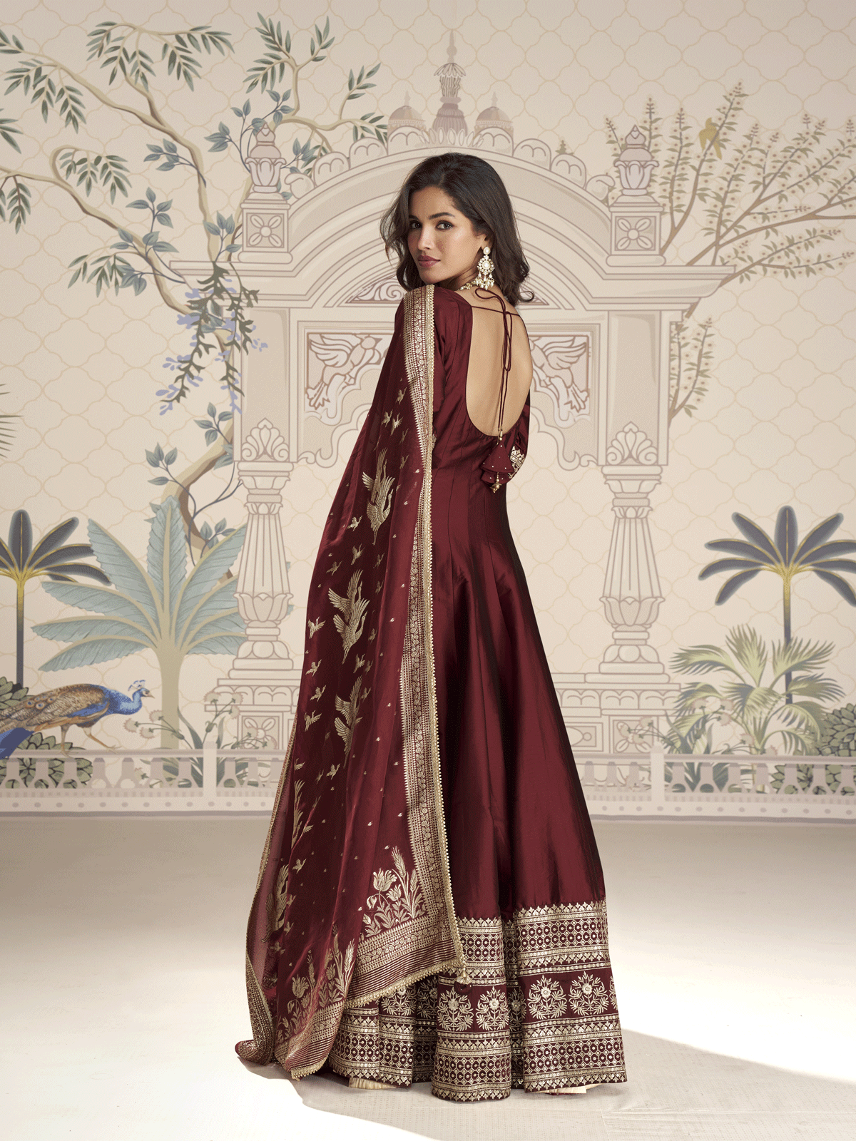 Maroon Silk Anarkali Gown with Embroidered Border and Jacquard Dupatta Command attention in this regal maroon Anarkali gown, meticulously tailored from premium Real Silk. The garment showcases ornate embroidered borders on both front and back, creating a statement making silhouette ideal for weddings, receptions, and formal evening occasions. Accompanied by a sumptuous Jacquard Silk Dupatta, this ensemble exudes timeless grandeur. Available in free size stitched construction (42 with margin up to 44), it delivers the perfect balance of opulent design and wearable comfort for your most significant celebrations.