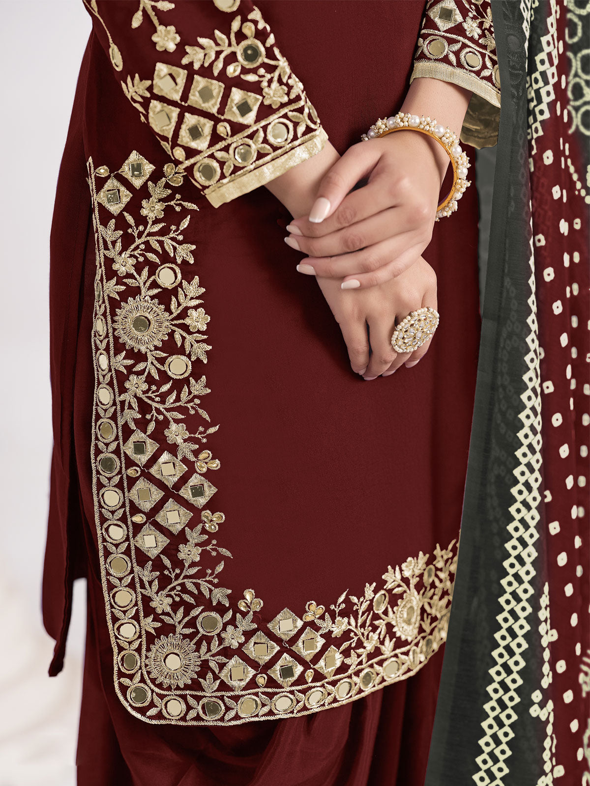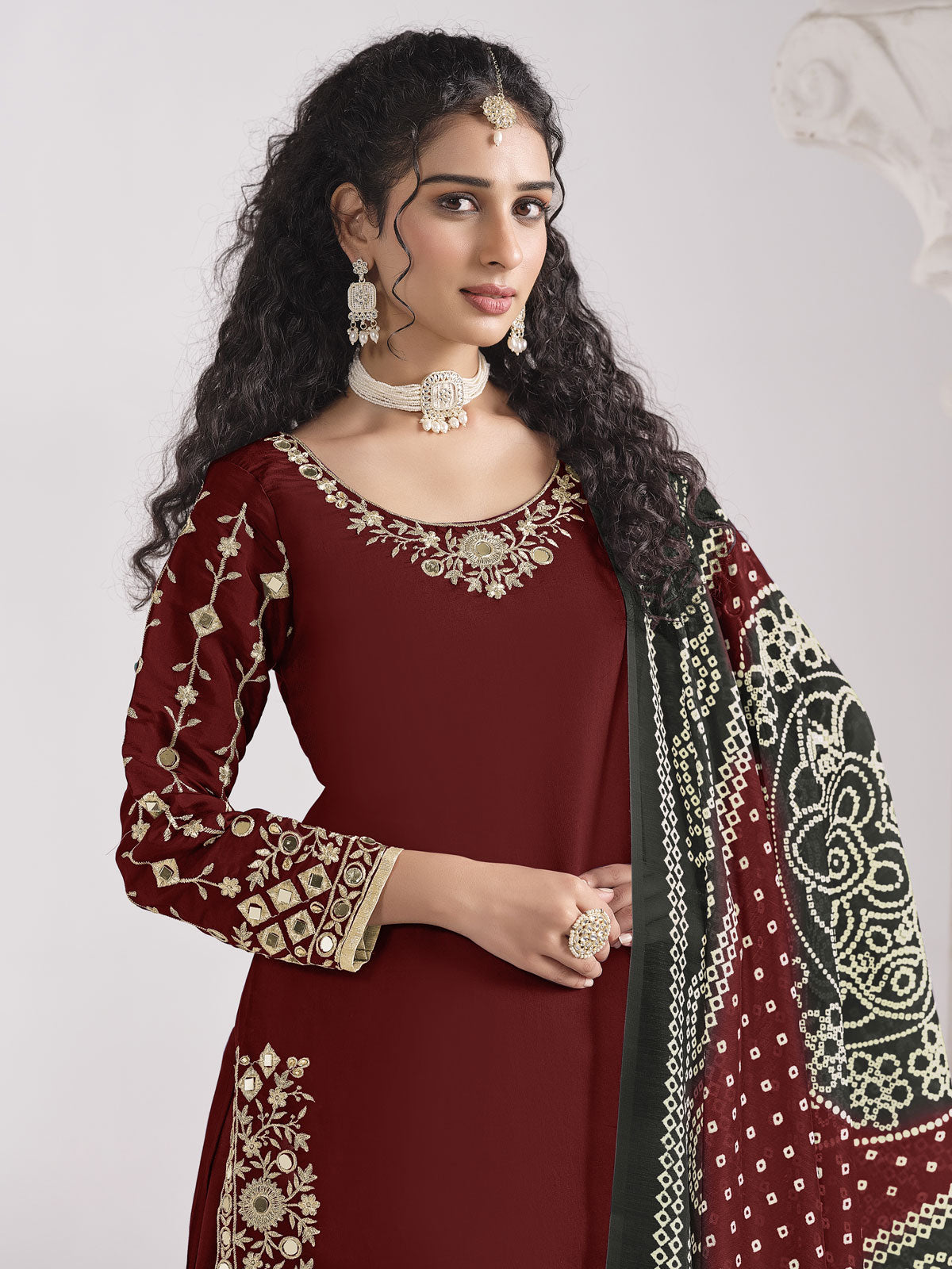 Elevate your festive wardrobe with this exquisite maroon dhoti suit crafted from luxurious art silk. The fabric's soft sheen beautifully showcases the richness of intricate embroidered detailing, complemented by refined mirror work and shimmering zari accents. The round neckline frames the design with understated elegance, while strategically placed embellishments create a subtle sparkle that catches light gracefully. The thigh-length silhouette pairs traditional aesthetics with contemporary comfort, while three-quarter sleeves provide structure and movement. This seamless fusion of embroidery and mirror work delivers a sophisticated festive piece that balances ornate craftsmanship with refined wearability.