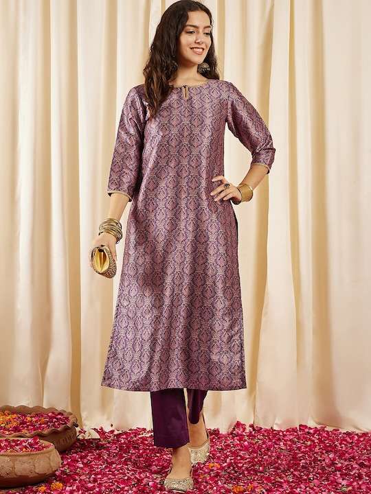 This stylish Mauve kurta set is perfect for any special occasion. The kurta features intricate ethnic motifs that are printed onto a silk blend machine weave fabric. It also has a keyhole neck, three-quarter regular sleeves, sequinned detail, and a calf length straight hem. The trousers include a partially elasticated waistband and a slip-on closure. Look effortlessly elegant with this sophisticated set.