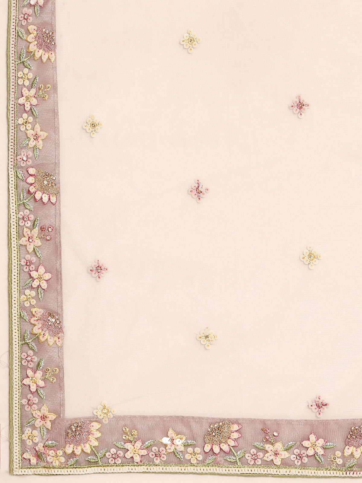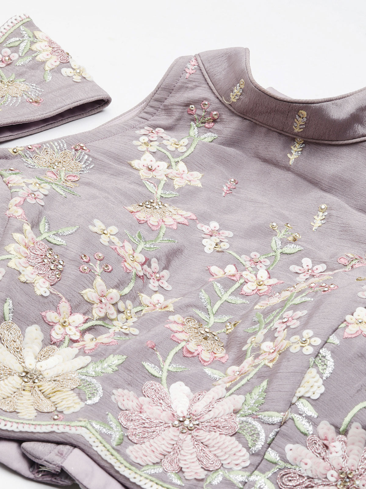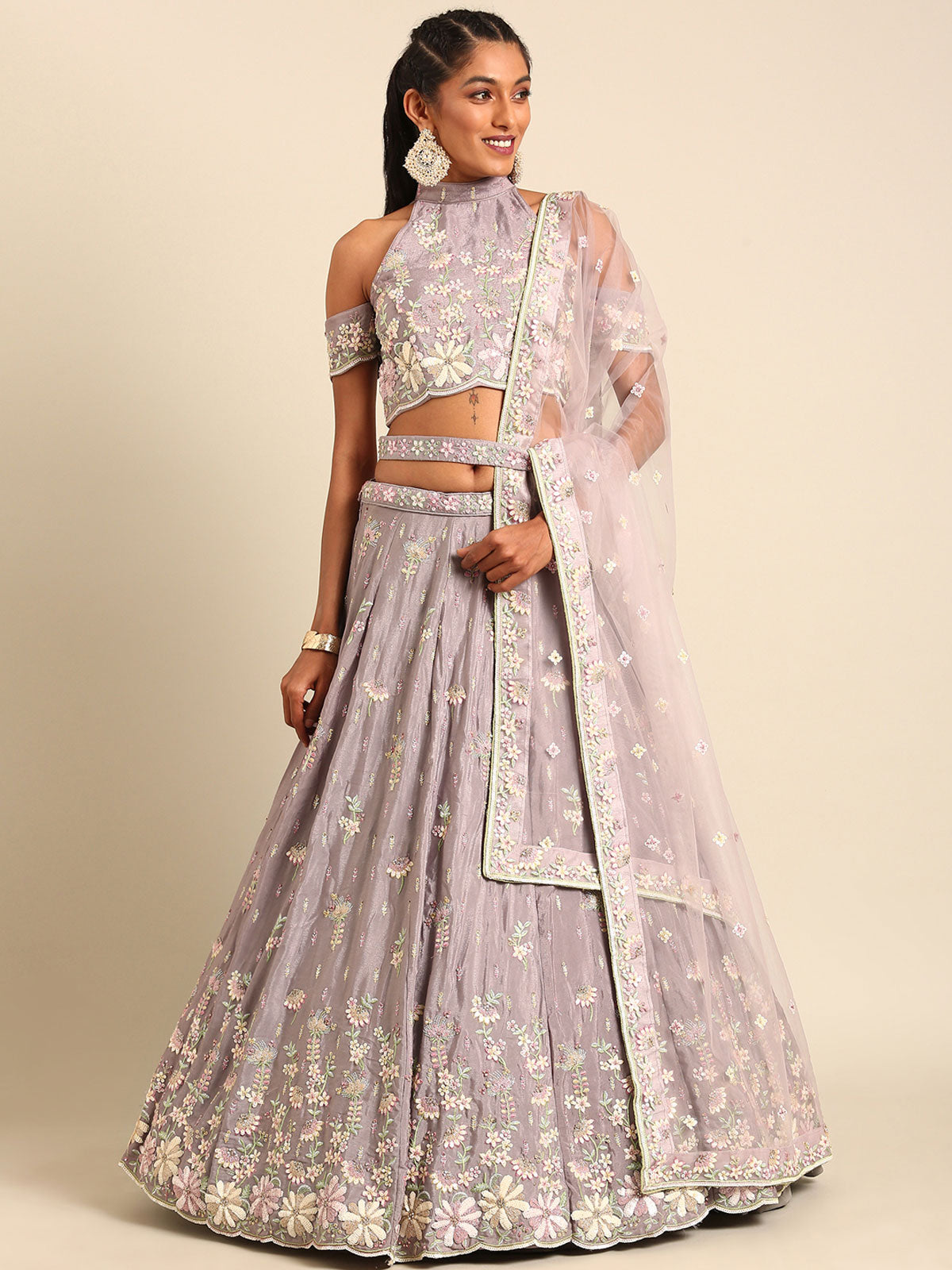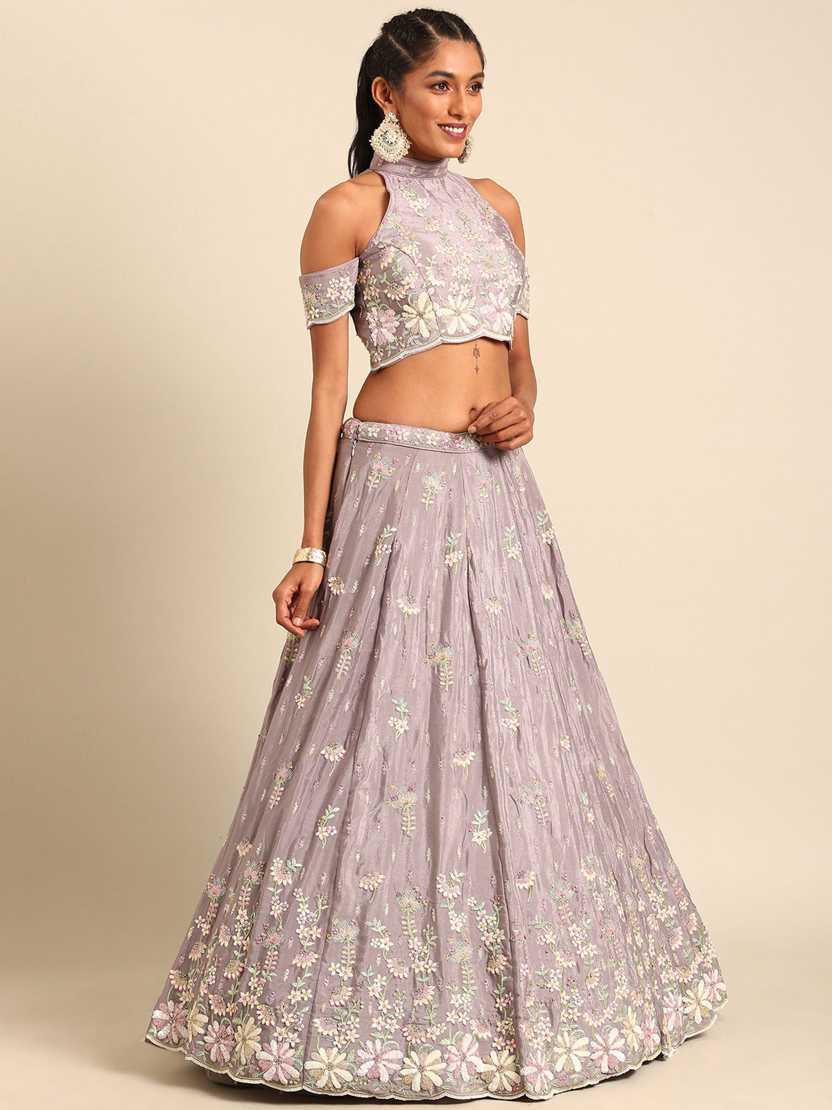 Expertly designed and crafted, the Mauve Pure Georgette Sequins Lehenga choli & Dupatta is a stunning addition to any wardrobe. Made of premium quality fabric, it features multi-colour Sequins work Zarkan and Coding thread Embroidery, with a cut work border on the hemline. The Dupatta and Blouse add intricate details of sequins work and lace border, showcasing artisanal quality.