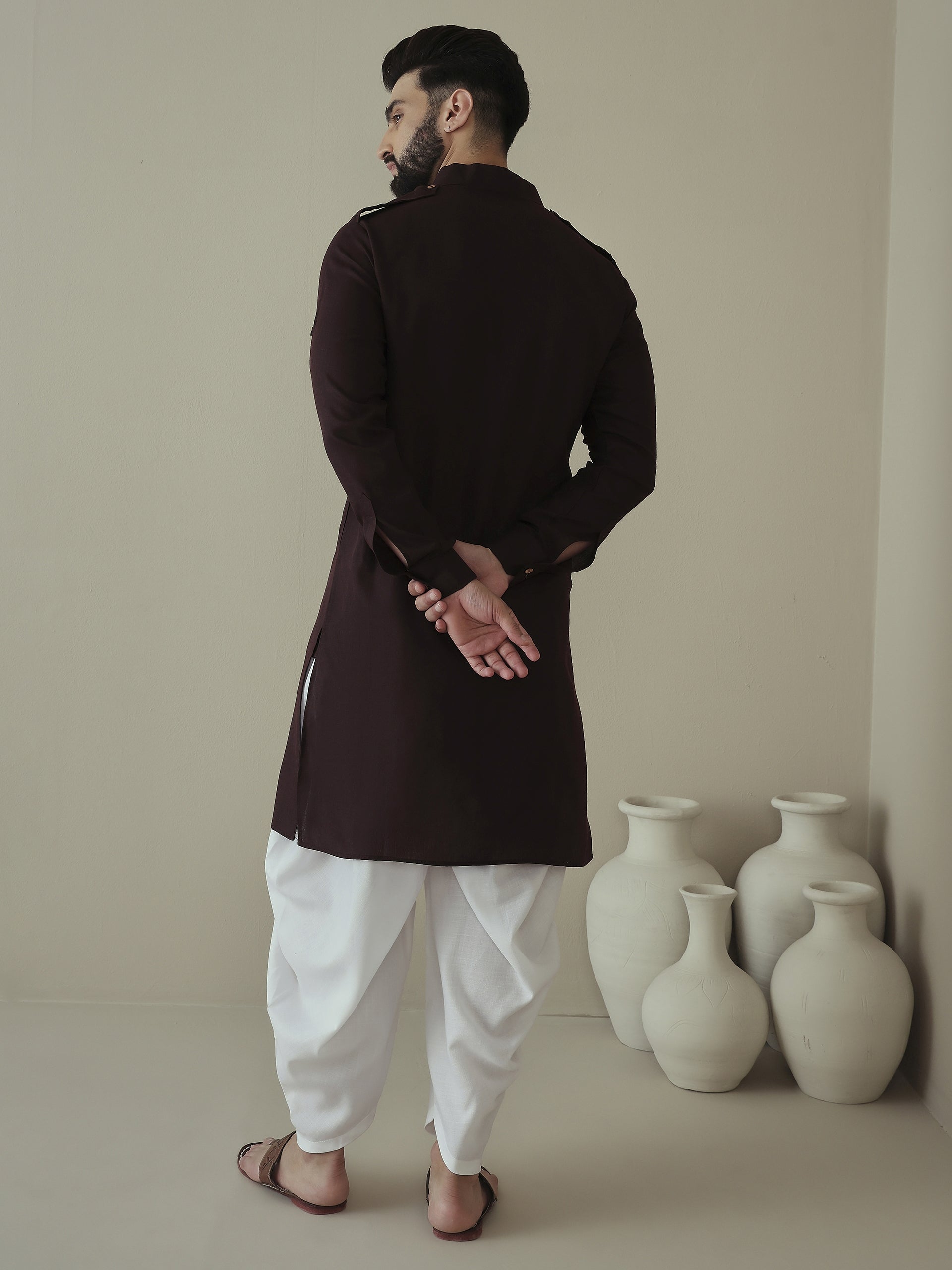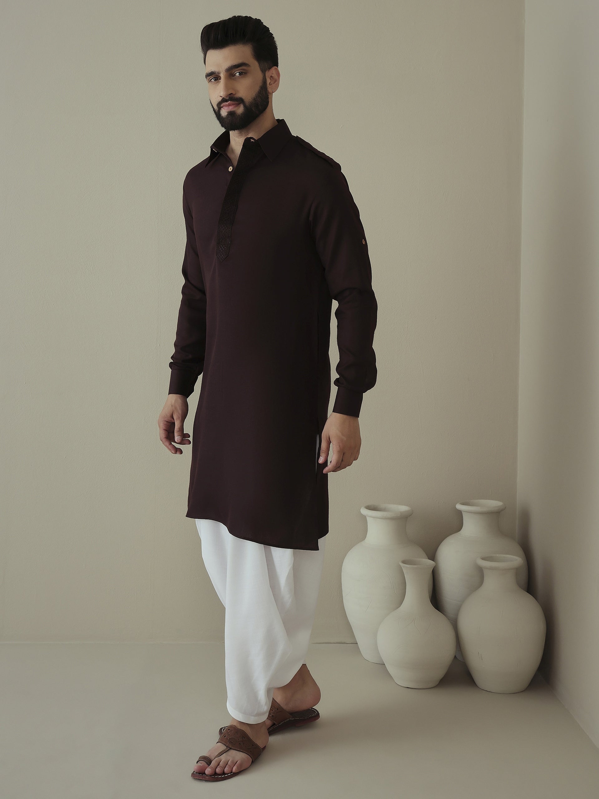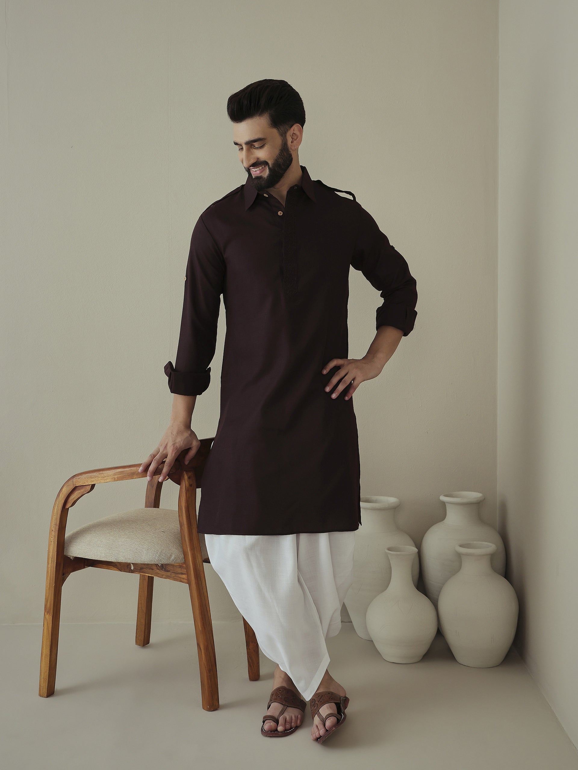 Elevate your ethnic game with our Men's Embroidered Kurta and Dhoti Pants set. The solid embroidered Kurta features a stylish Pathani shape with a shirt collar, long sleeves, and 2 pockets for convenience. Made from a comfortable cotton blend fabric, paired with solid Dhoti Pants for a unique touch. Perfect for any occasion.