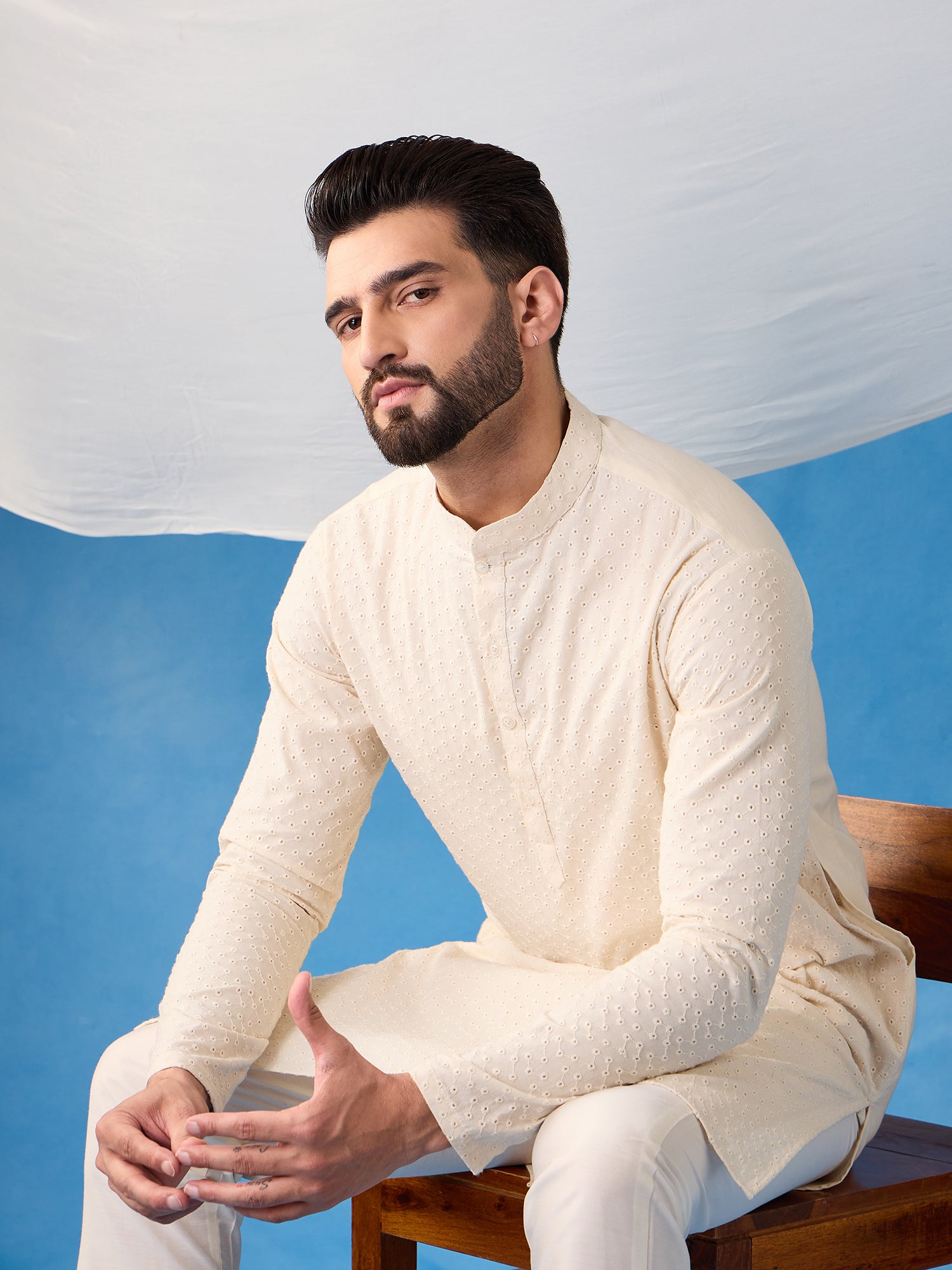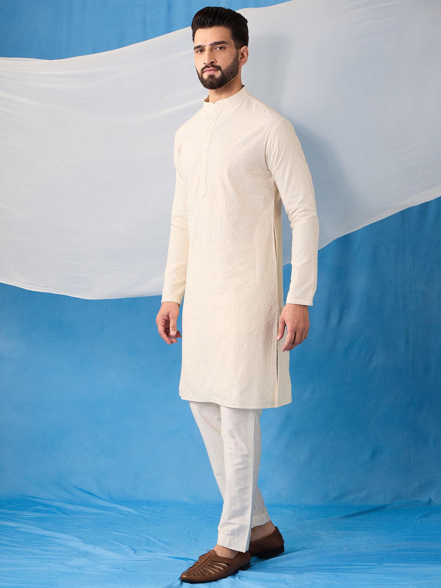 Expertly crafted for a distinguished touch, this off white Kurta with Trousers features ethnic motifs embroidery and intricate chikankari detailing. Made from a durable cotton blend fabric, the Kurta offers a regular fit with a mandarin collar and 2 pockets. Accompanied by solid Trousers with partial elastic waistband for optimal comfort.