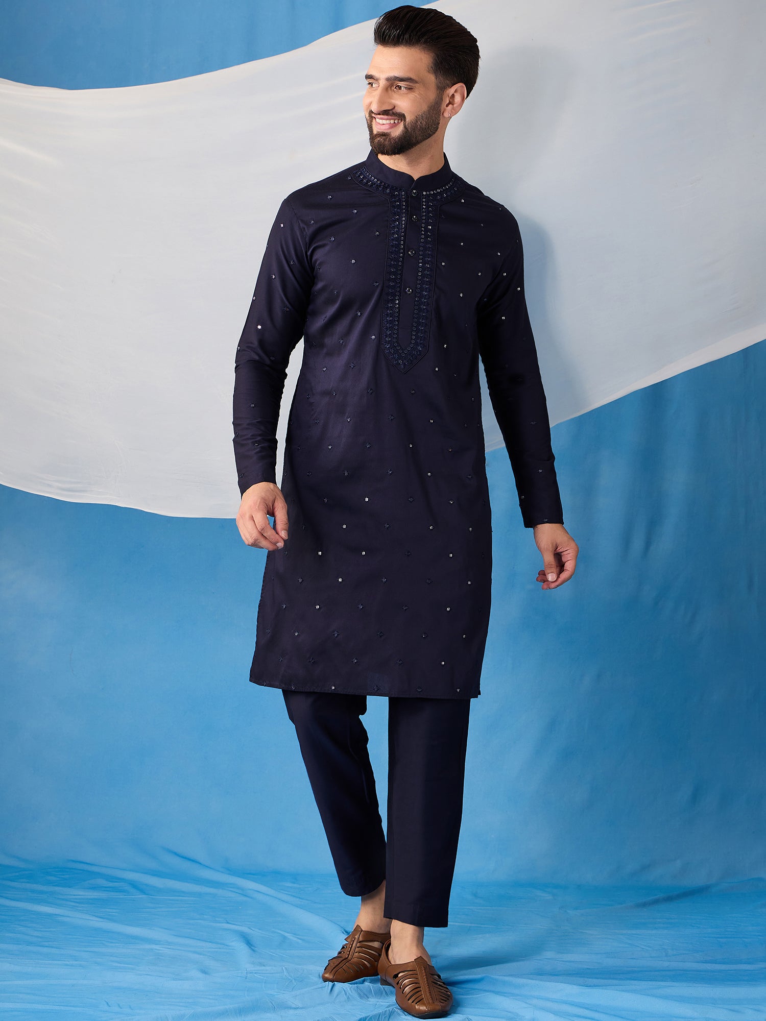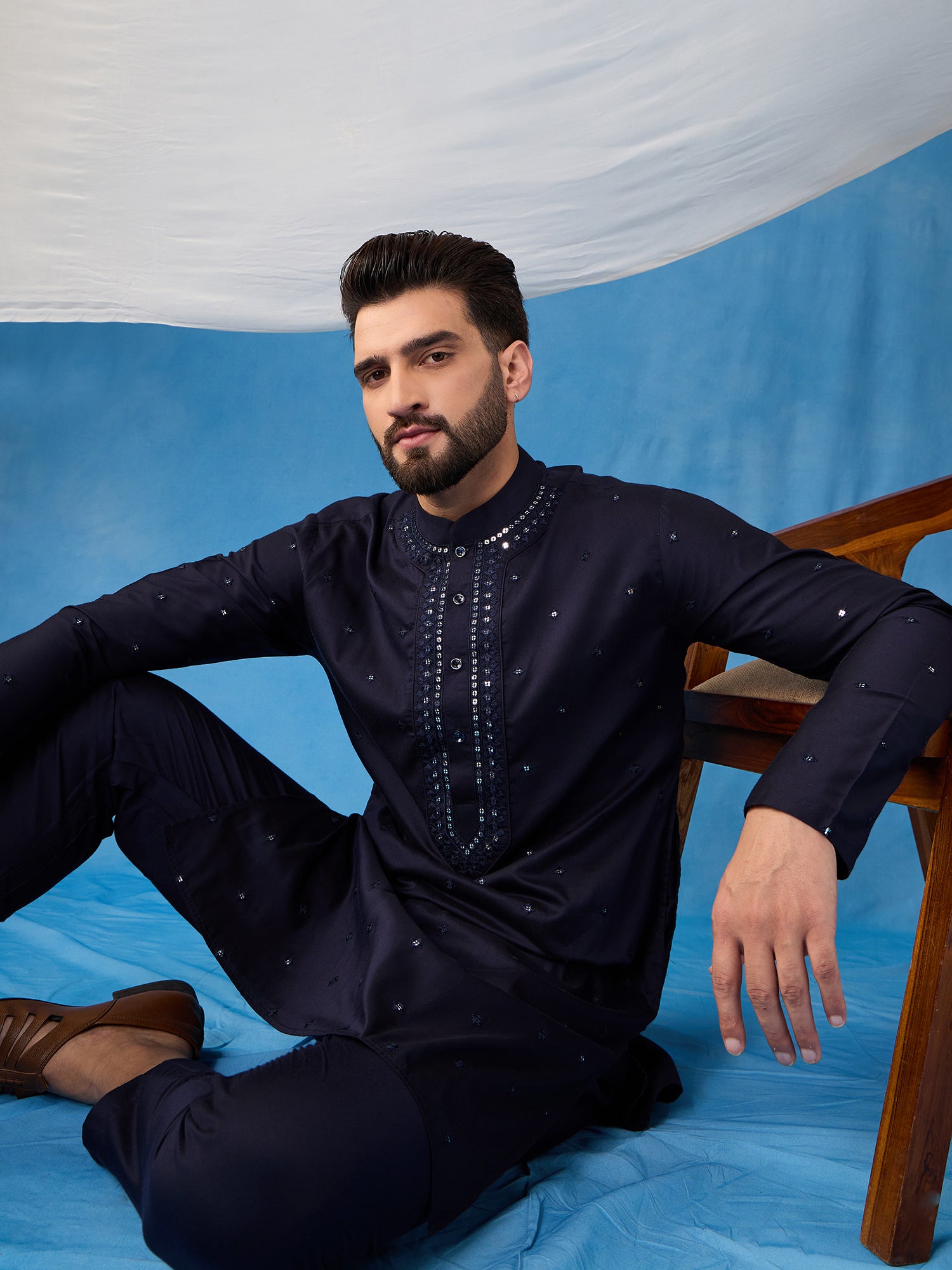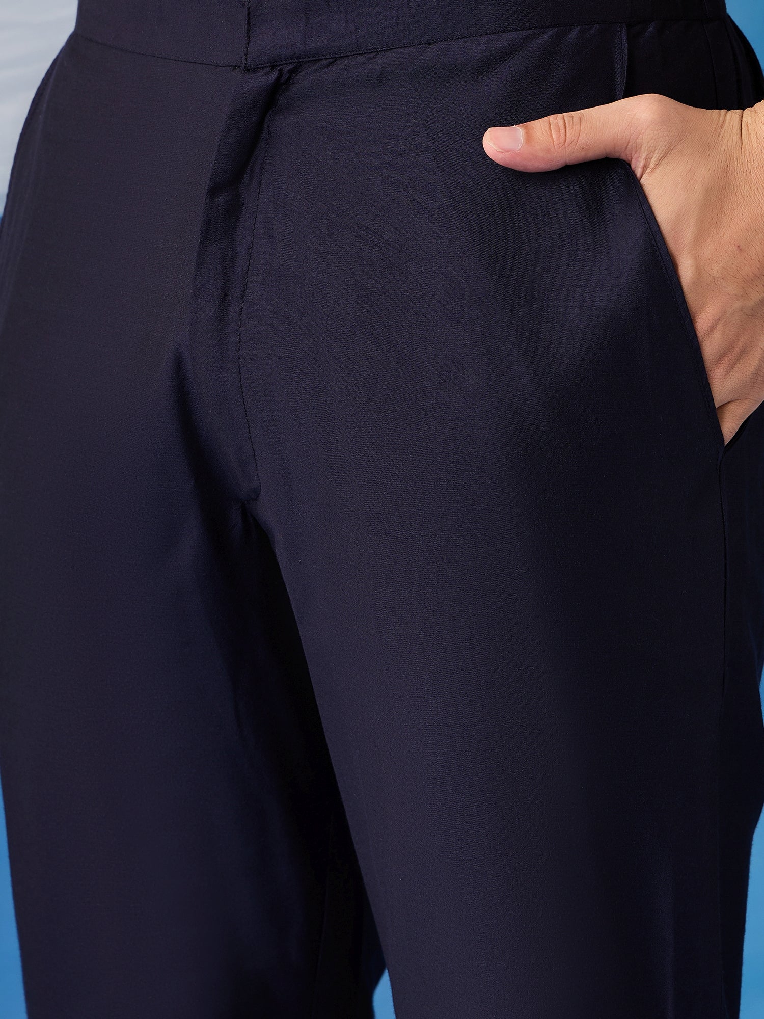 Elevate your ethnic style with our Navy Blue Embroidered Kurta and Trousers set. Crafted from a luxurious silk blend, the kurta features intricate ethnic motifs and sequinned details on a modern straight shape with a mandarin collar and long sleeves. Meanwhile, the solid trousers offer a comfortable, partially elasticated waistband and zip closure. Perfect for any occasion, this set will surely make a statement.