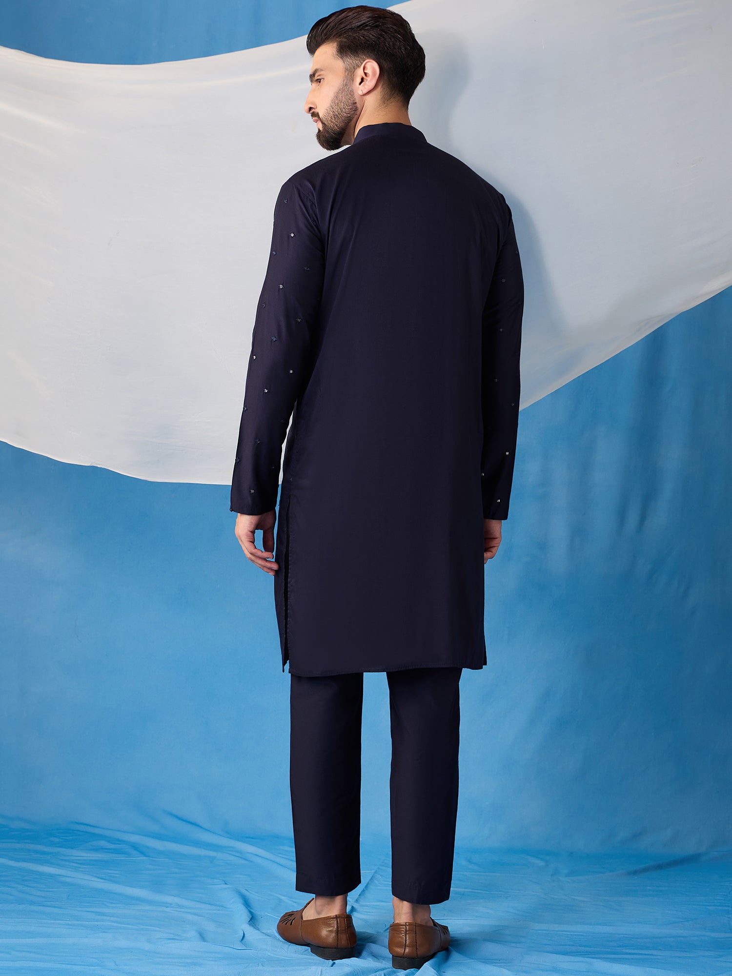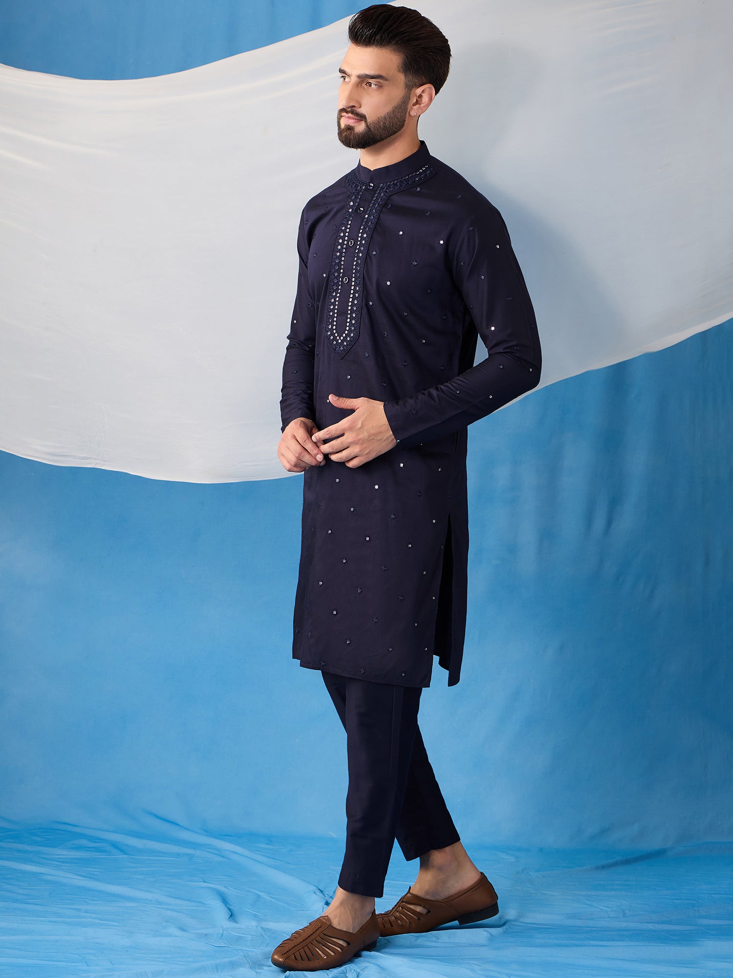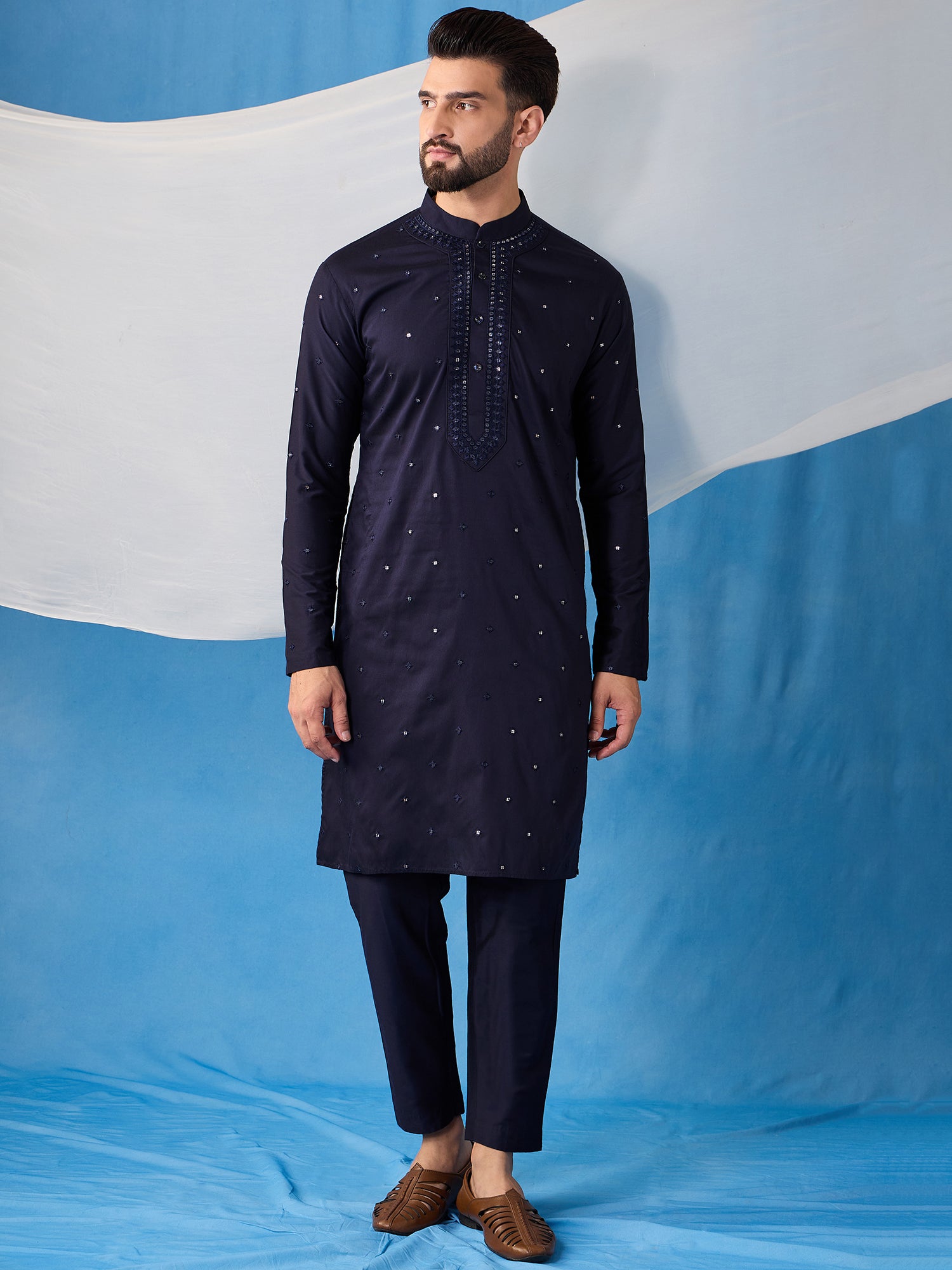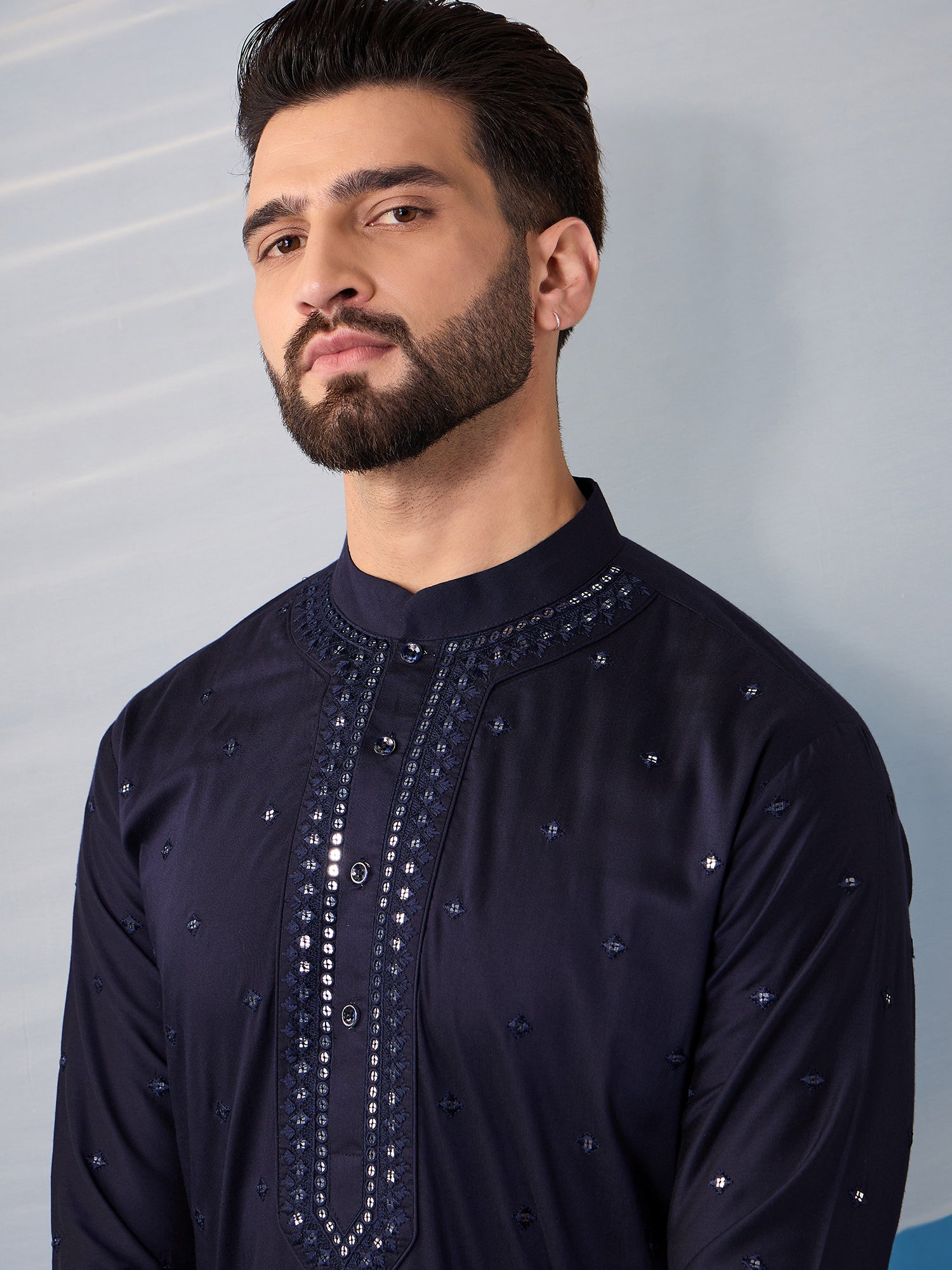 Elevate your ethnic style with our Navy Blue Embroidered Kurta and Trousers set. Crafted from a luxurious silk blend, the kurta features intricate ethnic motifs and sequinned details on a modern straight shape with a mandarin collar and long sleeves. Meanwhile, the solid trousers offer a comfortable, partially elasticated waistband and zip closure. Perfect for any occasion, this set will surely make a statement.