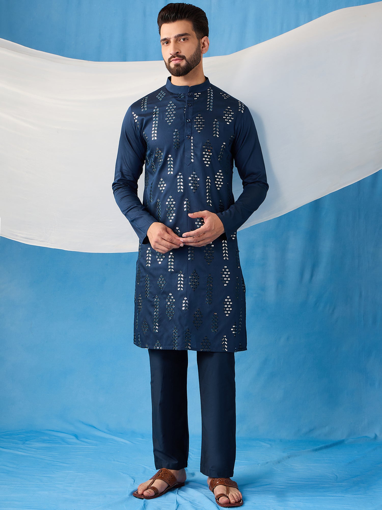 Expertly crafted, this teal embroidered Kurta with Trousers is a must-have for any formal occasion. Its ethnic motifs and sequinned details add a touch of elegance, while the silk blend fabric ensures comfort. The mandarin collar, long sleeves, and straight hem complete its regular style. The solid trousers, with an elastic waistband and zip closure, provide a perfect fit.
