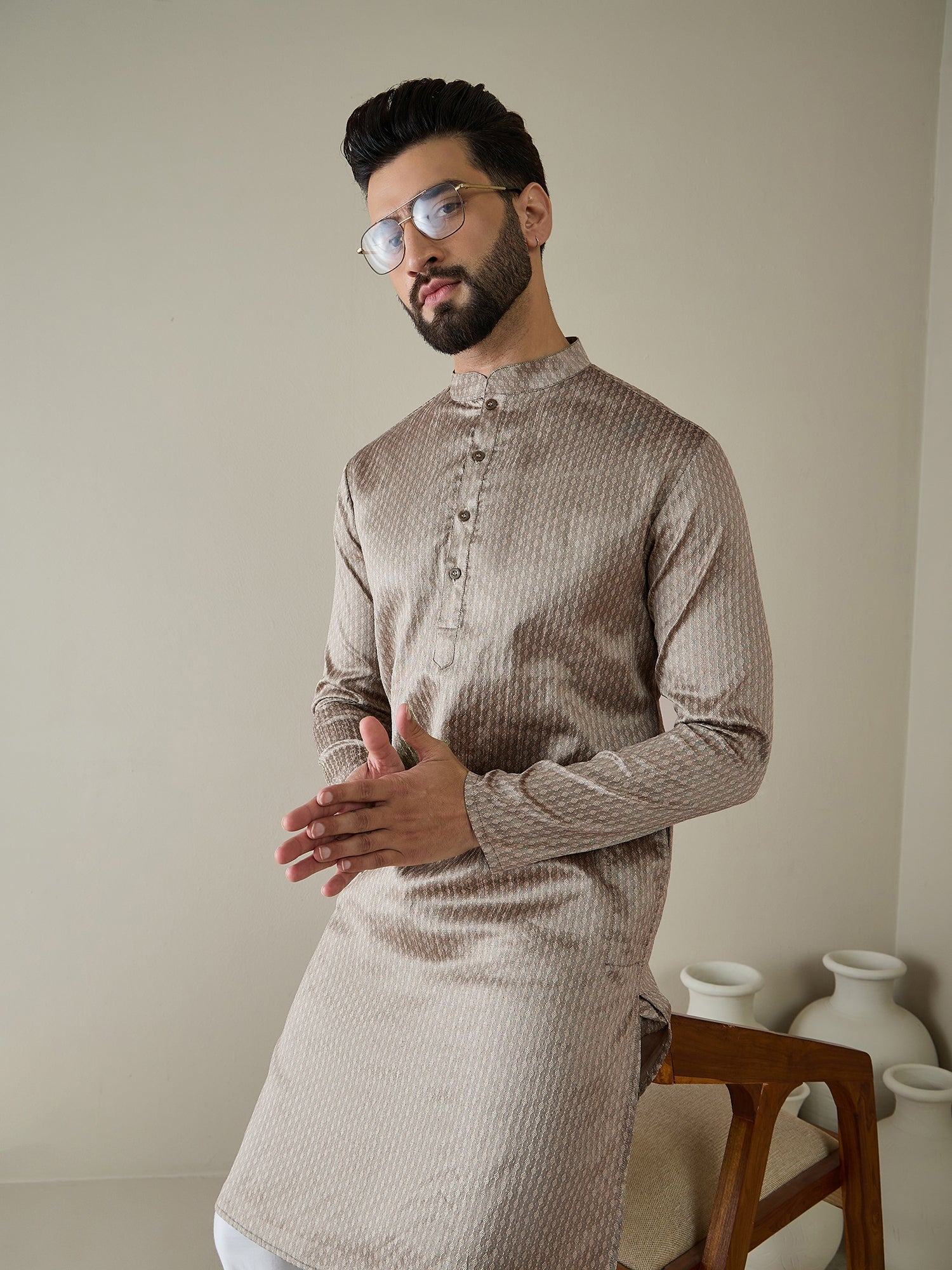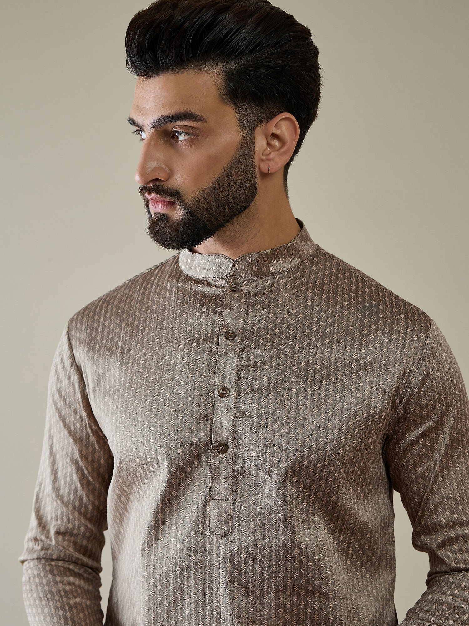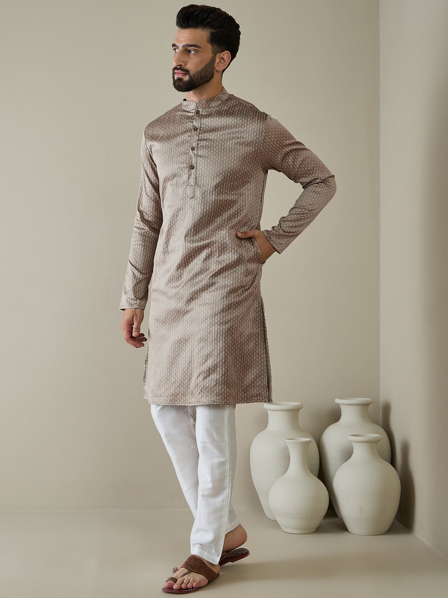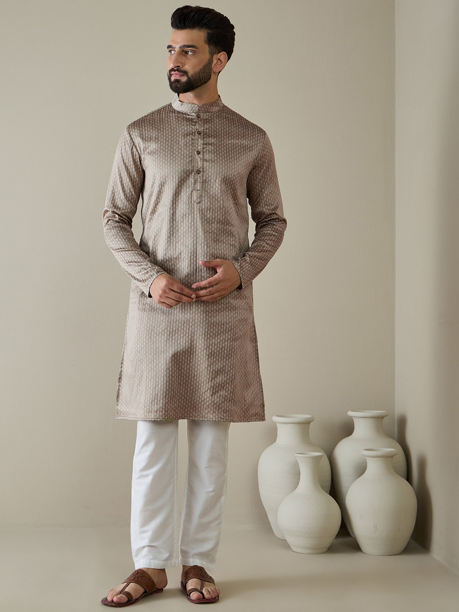 Elevate your style with our Men Ethnic Motifs Regular Kurta with Trousers. Crafted with a traditional woven design in beige, this kurta exudes elegance with its straight shape, mandarin collar, and zari details. The silk blend fabric adds a luxurious touch. Paired with solid trousers with an elastic waistband for comfortable wear, this set is perfect for any occasion.