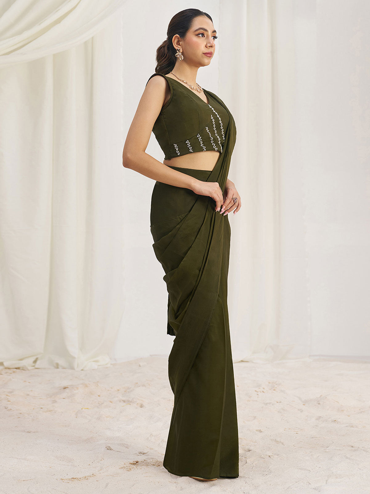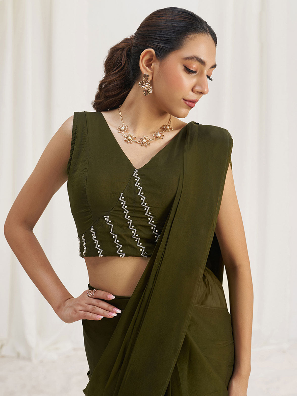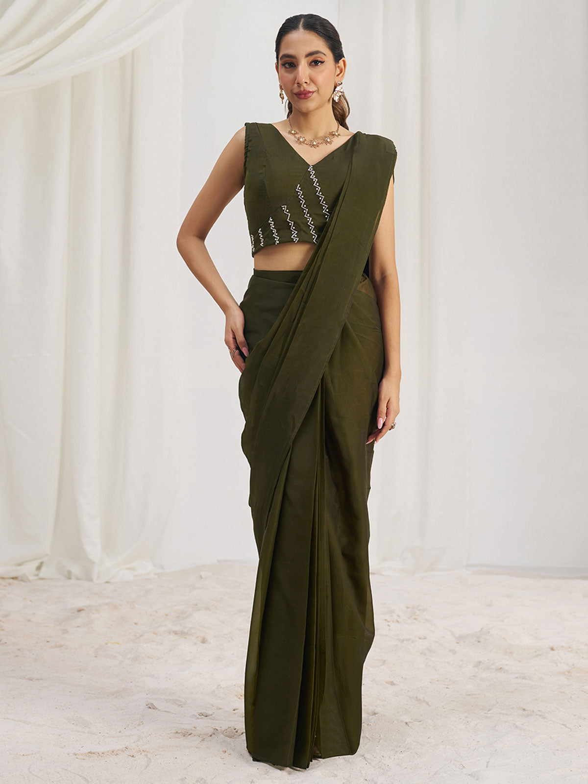 Experience elegance and grace with our Mesmerizing Olive Green Hand Work Organza Pre-Stitched Saree. Made from high-quality organza silk, it offers a comfortable fit in sizes XS to XXL. The intricate handwork embroidery on the matching blouse adds a sophisticated touch, perfect for any special occasion, cocktail wear, party, or festive celebration.