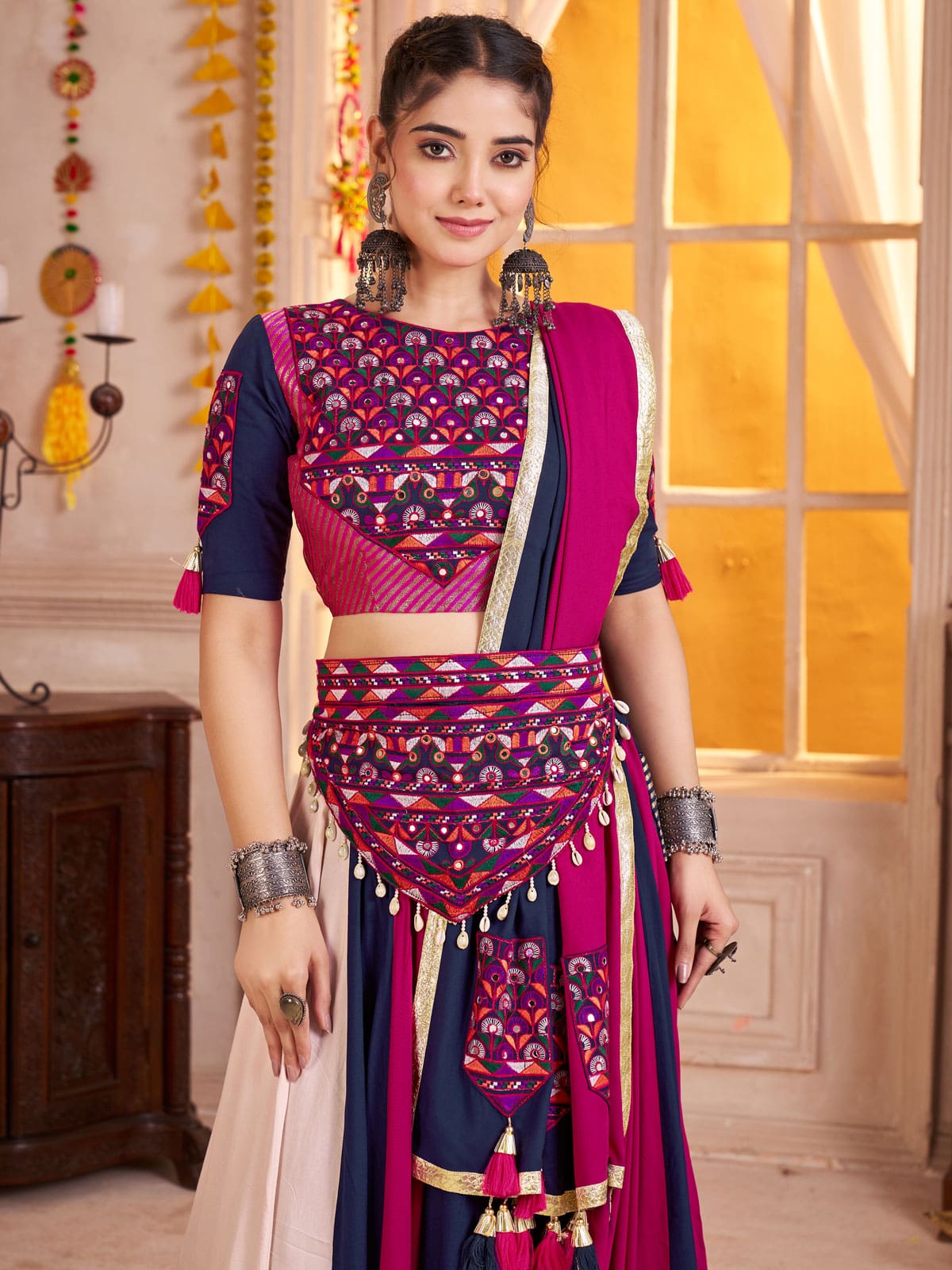 The Multi Color Viscose Cotton Navratri Chaniya Choli combines tradition and comfort with premium fabric and expert craftsmanship. Designed for Navratri and festive occasions, its vibrant multi-colored lehenga features a distinctive Lampi border that highlights its celebratory appeal. The garment fits a waist size up to 42 inches and measures 40 inches in length, ensuring ease throughout long events. A beautifully detailed waist belt adorned with thread work, mirror accents, and natural Kodi elements adds an authentic touch, making this ensemble a refined choice for cultural celebrations.