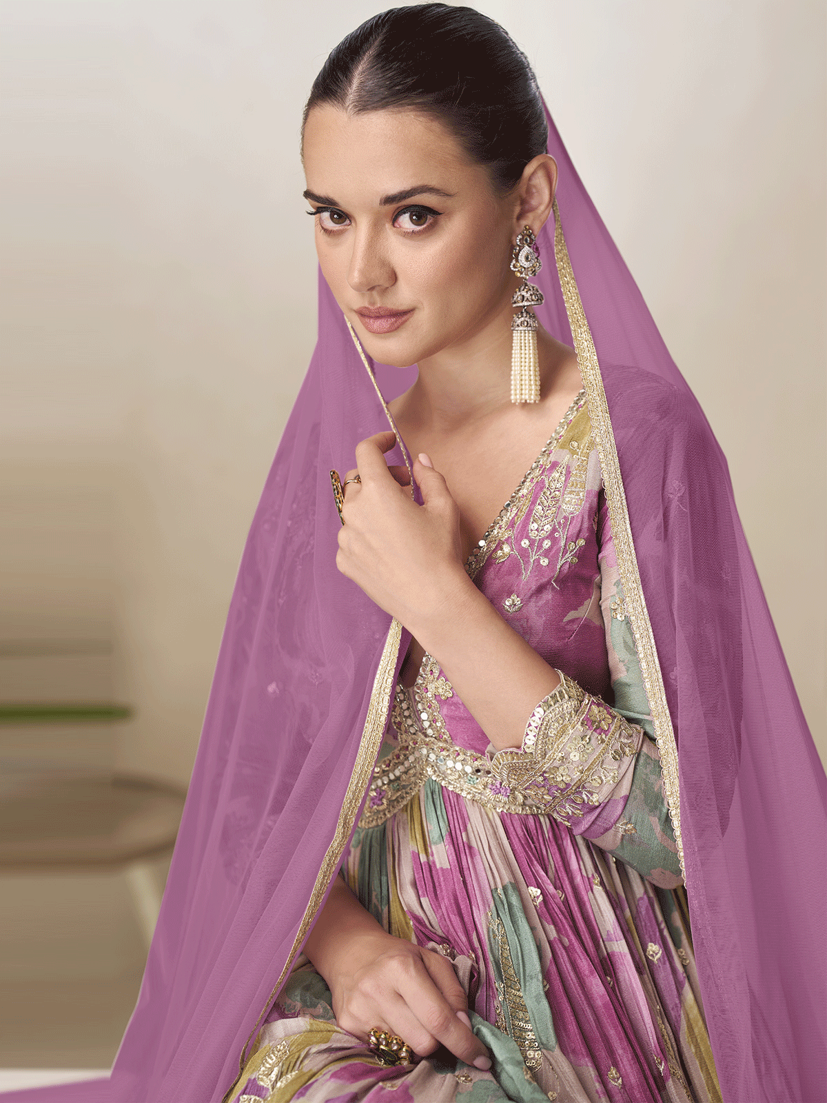 Elevate your festive ensemble with this exquisite Multicolor Chinnon Silk Anarkali Gown from Inddus. Crafted from premium chinnon silk, this gown showcases stunning floral digital prints that capture traditional artistry with contemporary flair. The intricate embellishment of delicate threadwork and shimmering sequins adds dimensional depth and luminous appeal, perfect for celebrations and special occasions. The flowing Anarkali silhouette flatters all body types while maintaining the grace and sophistication expected of festive wear. Ideal for weddings, festivals, and formal gatherings, this piece seamlessly blends heritage craftsmanship with modern design sensibilities.