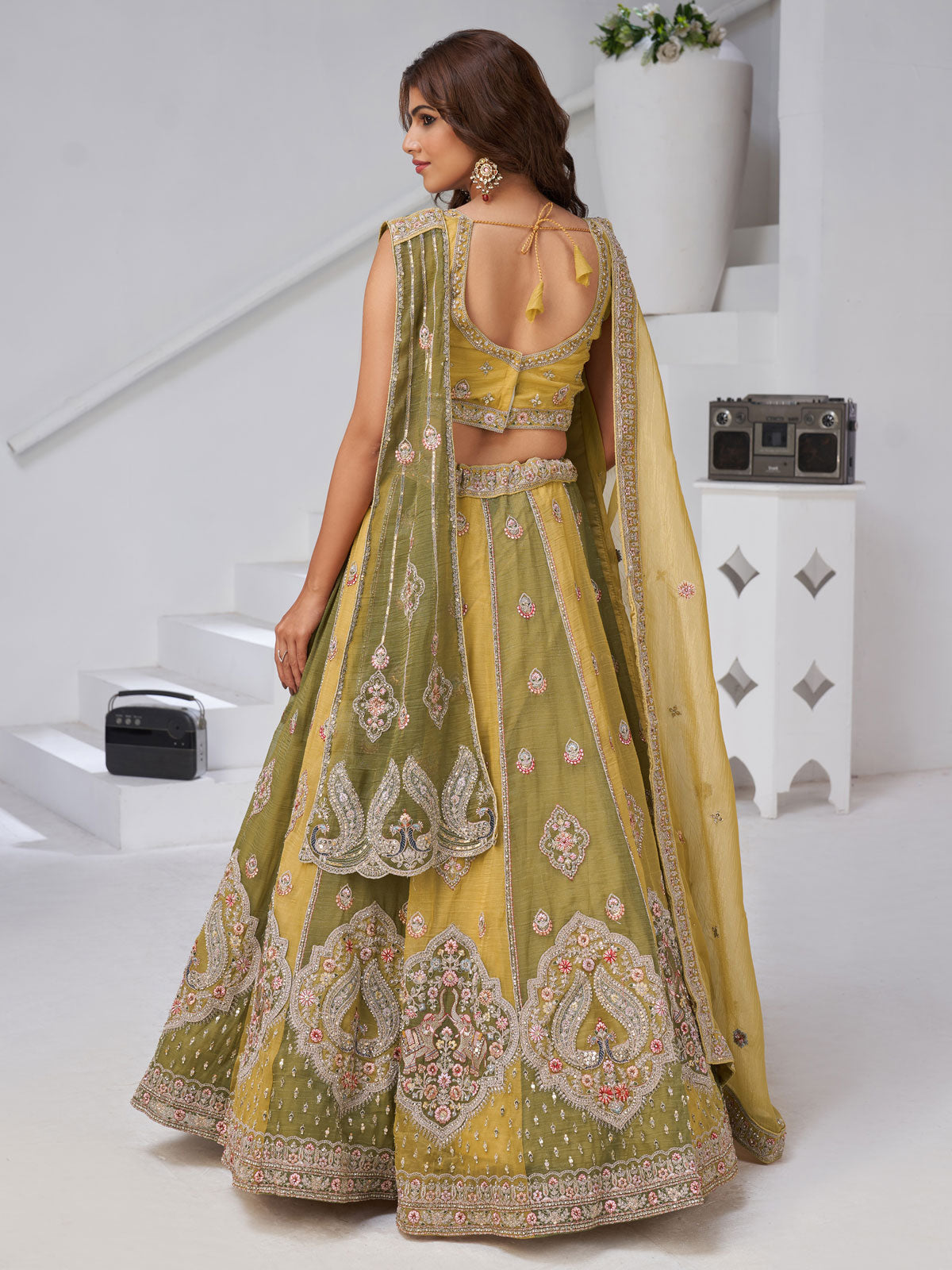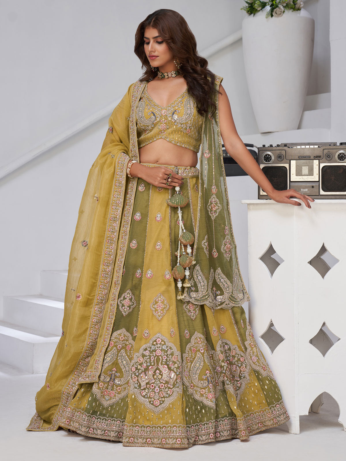 Make a striking impression in this mustard and green double dupatta lehenga, a masterpiece of traditional Indian craftsmanship. The vibrant mustard skirt is beautifully complemented by layered green dupattas, creating an elegant contrast that commands attention. Intricate zari and resham embroidery adorns the ensemble, showcasing meticulous handiwork and heritage artistry. The double dupatta design adds dimensional sophistication and graceful movement. Ideal for weddings, sangeet, haldi, and festive celebrations, this lehenga delivers a regal silhouette with authentic Indian elegance that honors timeless tradition.