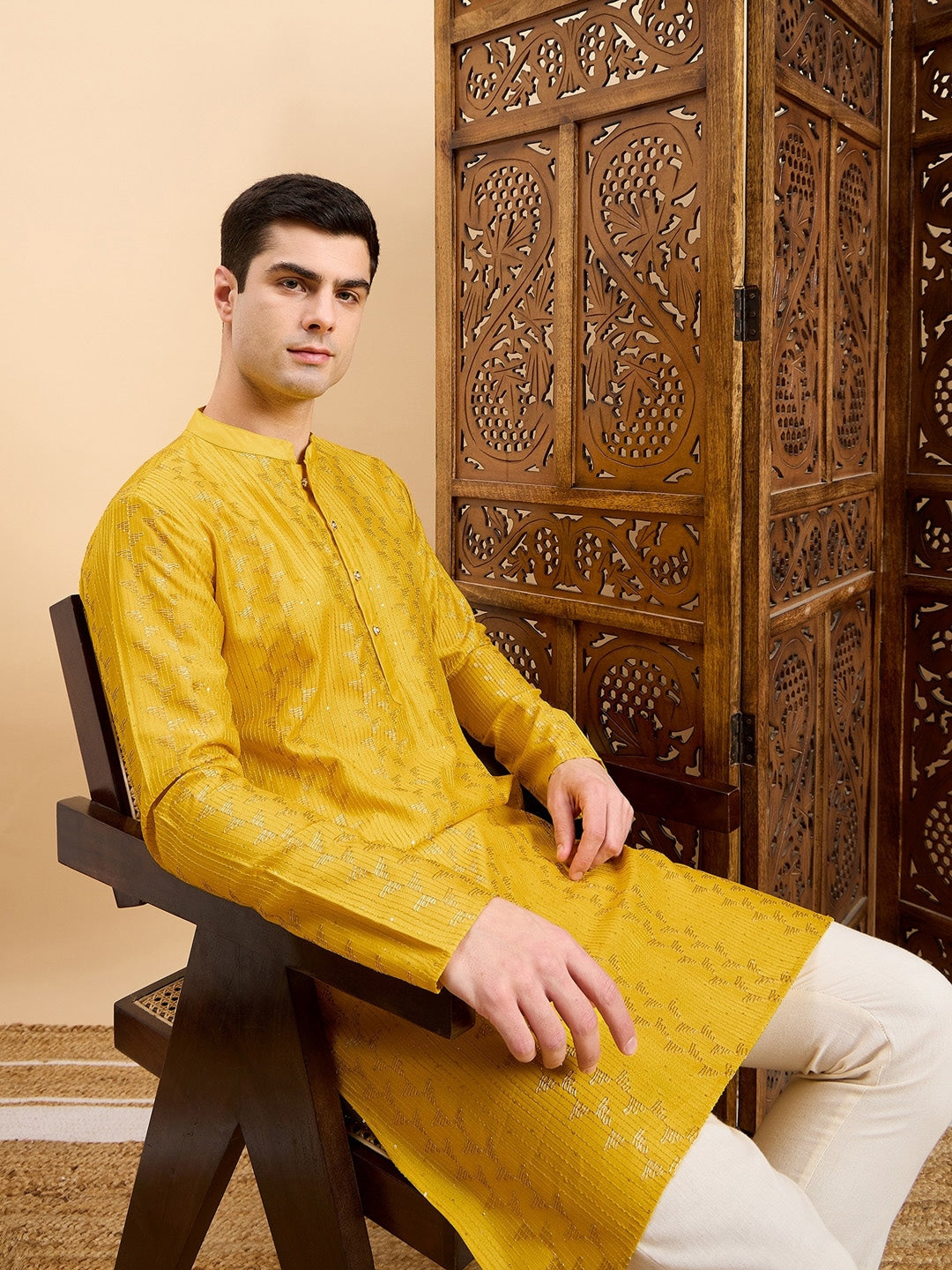 This mustard striped embroidered kurta features a mandarin collar and long, regular sleeves. With intricate bead and stone details, this knee length kurta offers a straight shape for a stylish yet comfortable fit. Made with machine-woven, regular cotton, it adds a touch of elegance to your wardrobe.