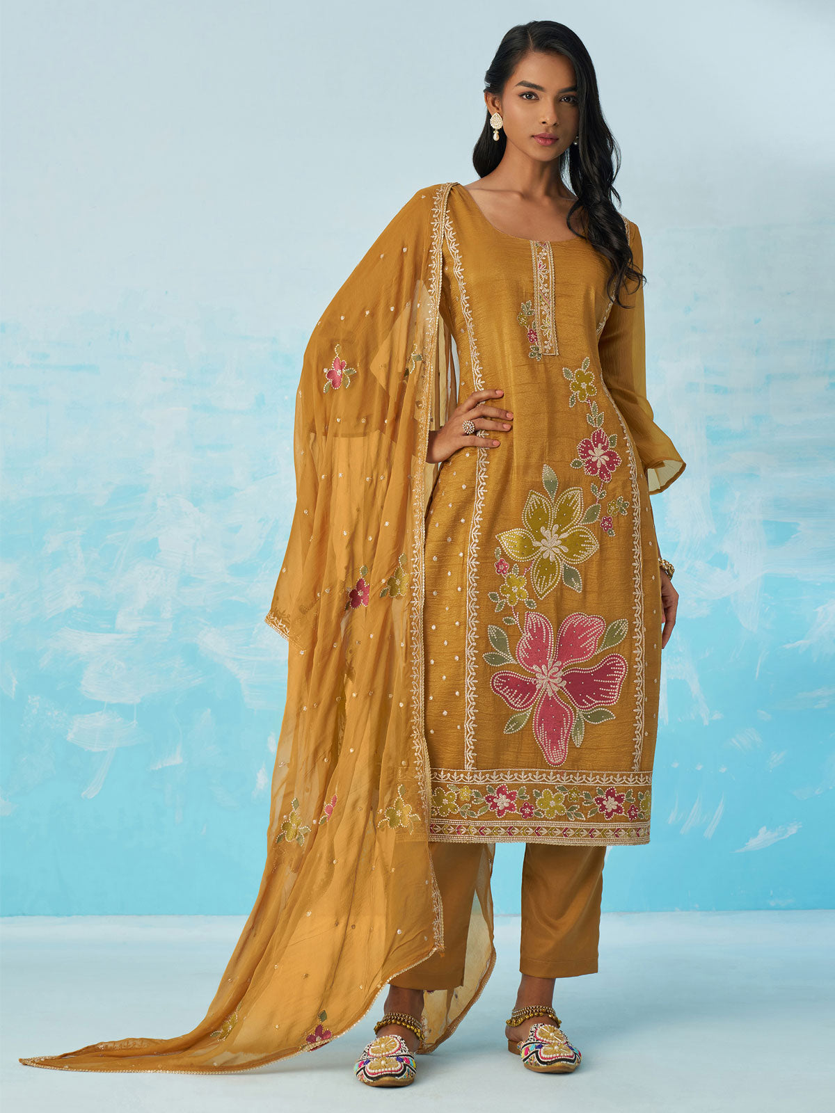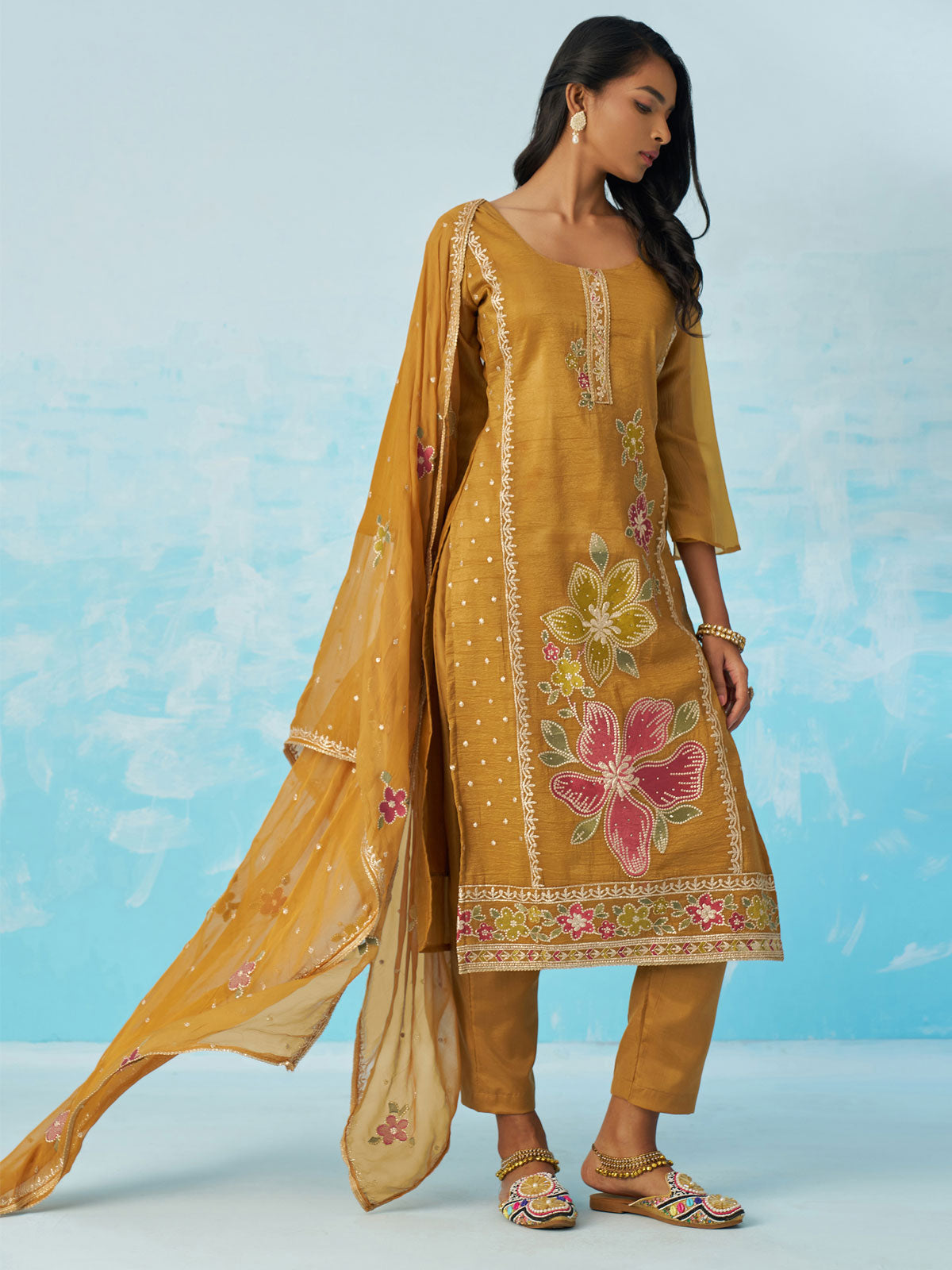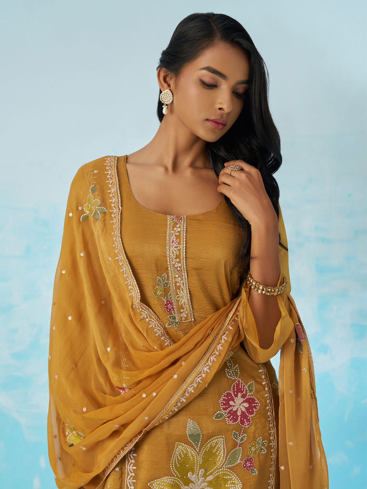 Elevate your ethnic wardrobe with this striking Mustard Yellow Pant Suit, expertly designed to balance contemporary style with traditional elegance. The rich mustard kurta serves as a versatile canvas, while the teal green dupatta introduces a sophisticated color contrast that enhances the overall aesthetic. This thoughtfully curated ensemble transitions seamlessly from festive celebrations to refined everyday wear, offering the wearer both visual impact and sartorial confidence. The warm-cool tonal interplay creates depth and dimension, ensuring you stand out with understated sophistication at any gathering.