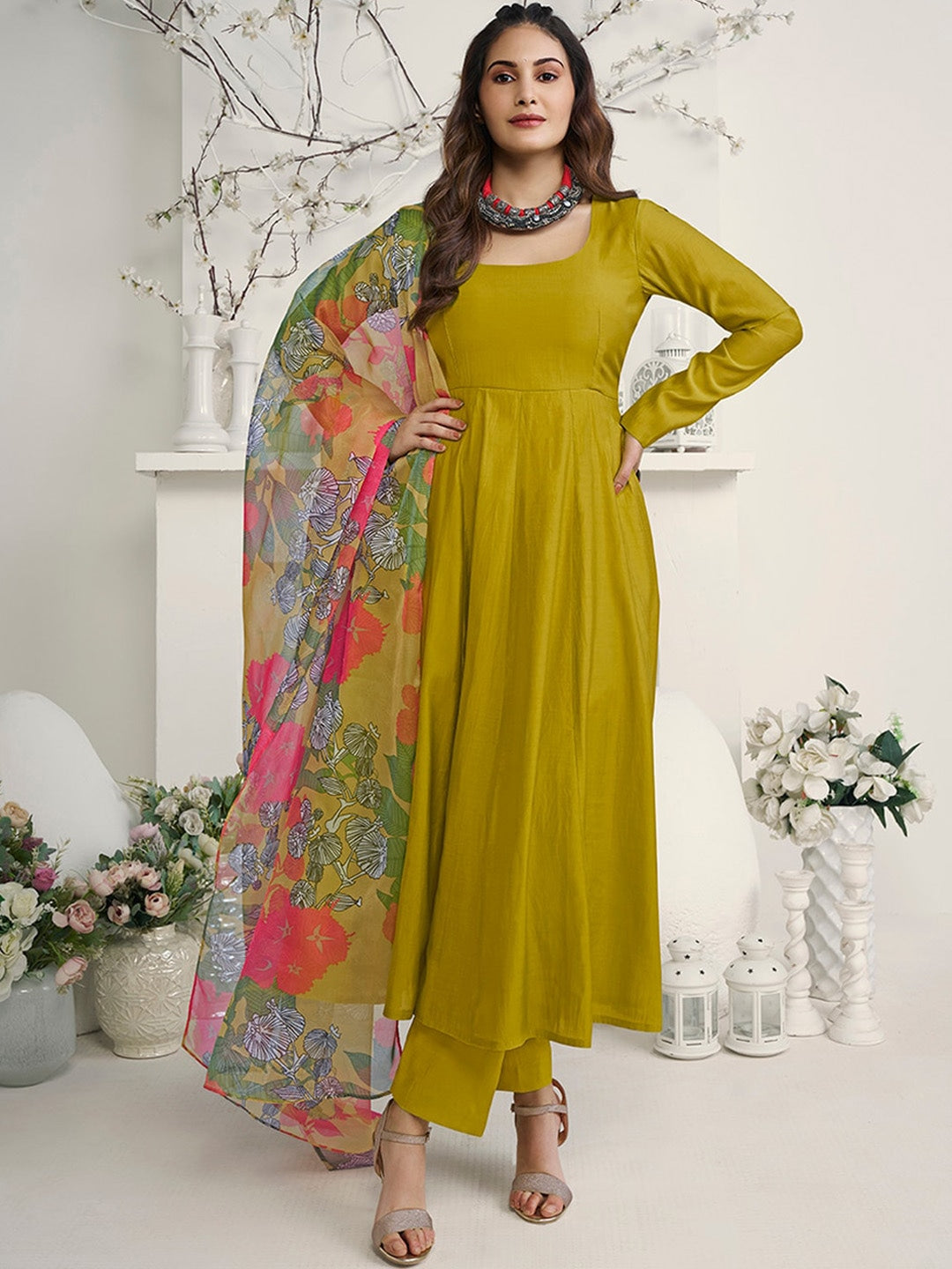 Introducing the Amyra Dastur Mustard Yellow Square Neck Empire Pure Silk Anarkali Kurta with Trousers & Dupatta. Crafted from luxurious pure silk, the mustard yellow kurta features a flattering square neck and a flared hem for a stunning silhouette. The accompanying trousers have an elasticated waistband for comfort and a slip-on closure. Elevate your style for any occasion with this elegant anarkali kurta set.
