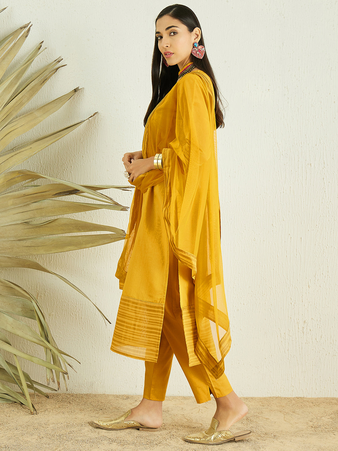 This mustard yellow kurta with trousers and dupatta features a beautiful floral yoke design, intricate thread work, and a round neck with three-quarter sleeves. Made from Chanderi cotton fabric, it offers comfort and style. The straight shape, regular style, and calf length with straight hem create a flattering silhouette. The trousers have a partially elasticated waistband for a comfortable fit. Perfect for any occasion.
