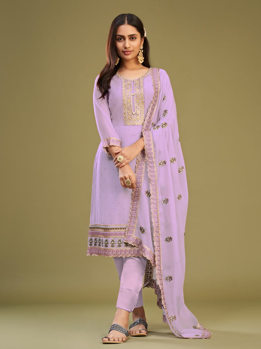 Buy mystical lilac embroidered festive-wear straight-cut-suit online at best shopping price. This subtle straight cut salwar suit comes with a georgette straight kurta with shantoon bottom and georgette dupatta.