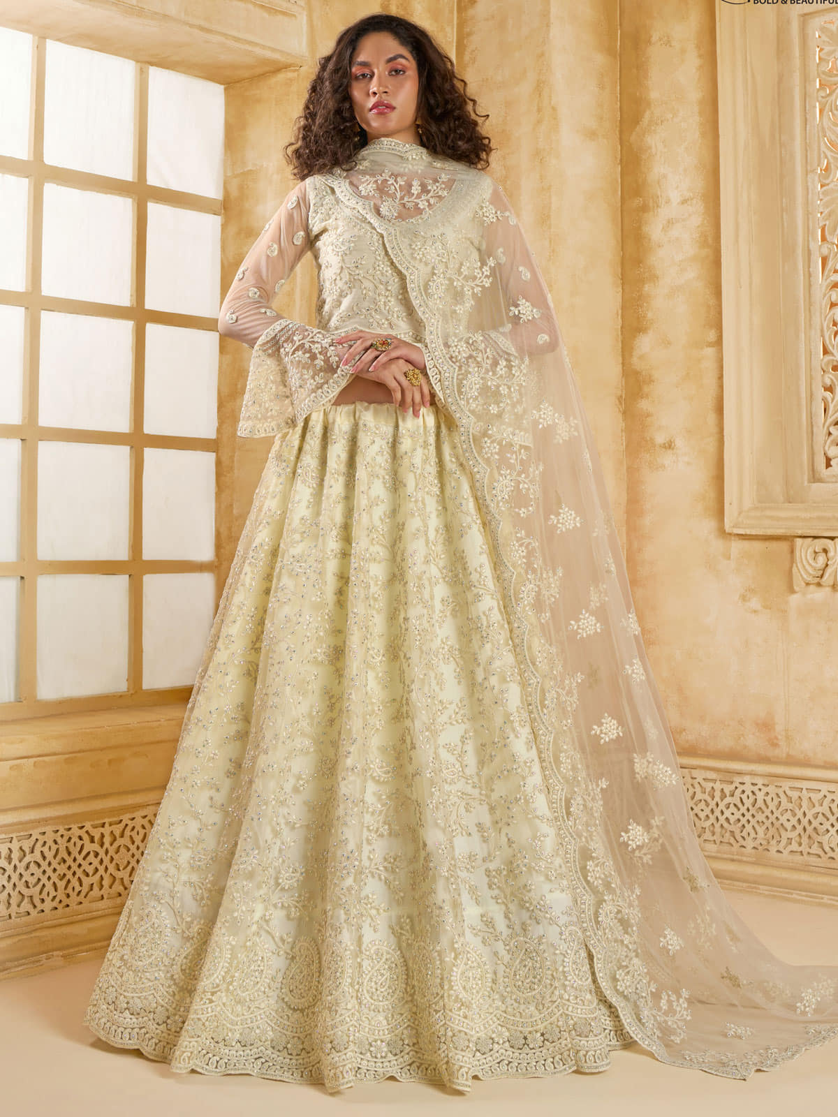 Experience timeless elegance with the Mystical Ivory Net Lehenga Choli set, crafted from premium net fabric layered over luxurious Banglori silk. The voluminous flare, enhanced by cancan and canvas, creates a graceful silhouette. Intricate cording, thread work, and delicate hand embellishments adorn the lehenga, blouse, and dupatta, showcasing exceptional craftsmanship. Ideal for weddings and grand celebrations, this ensemble combines comfort with regal charm, ensuring you stand out with sophistication and poise.