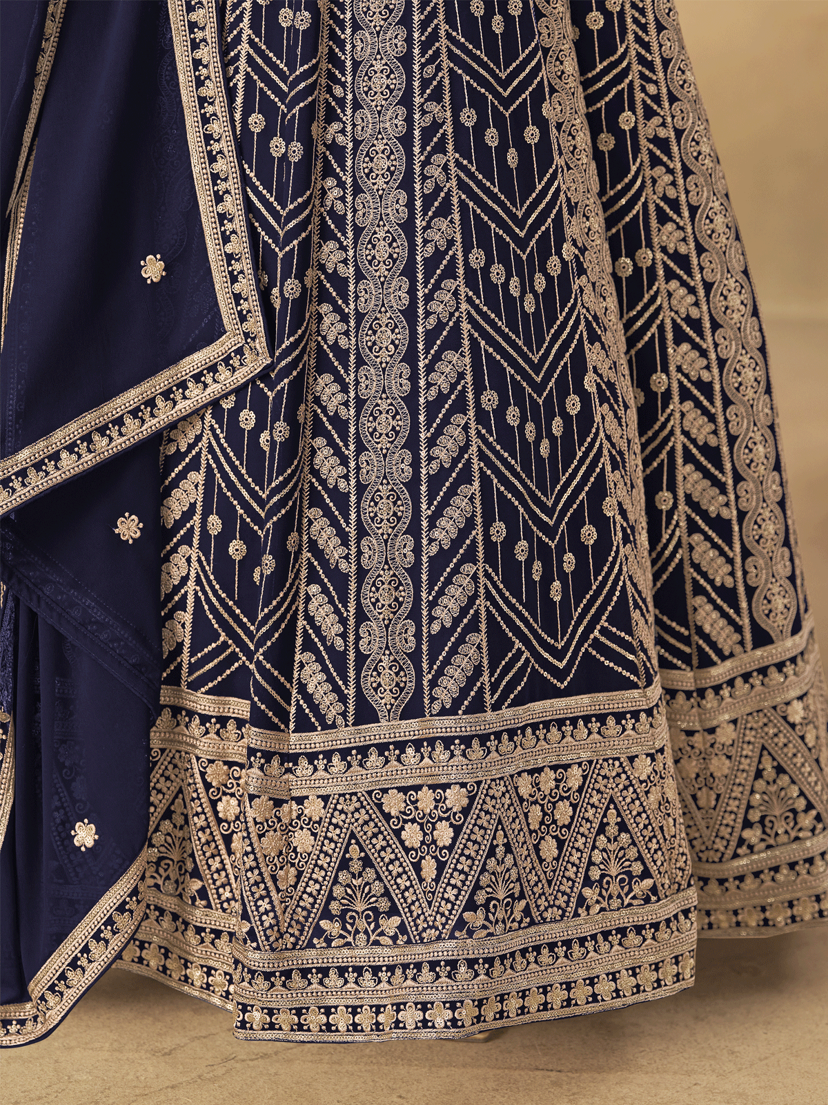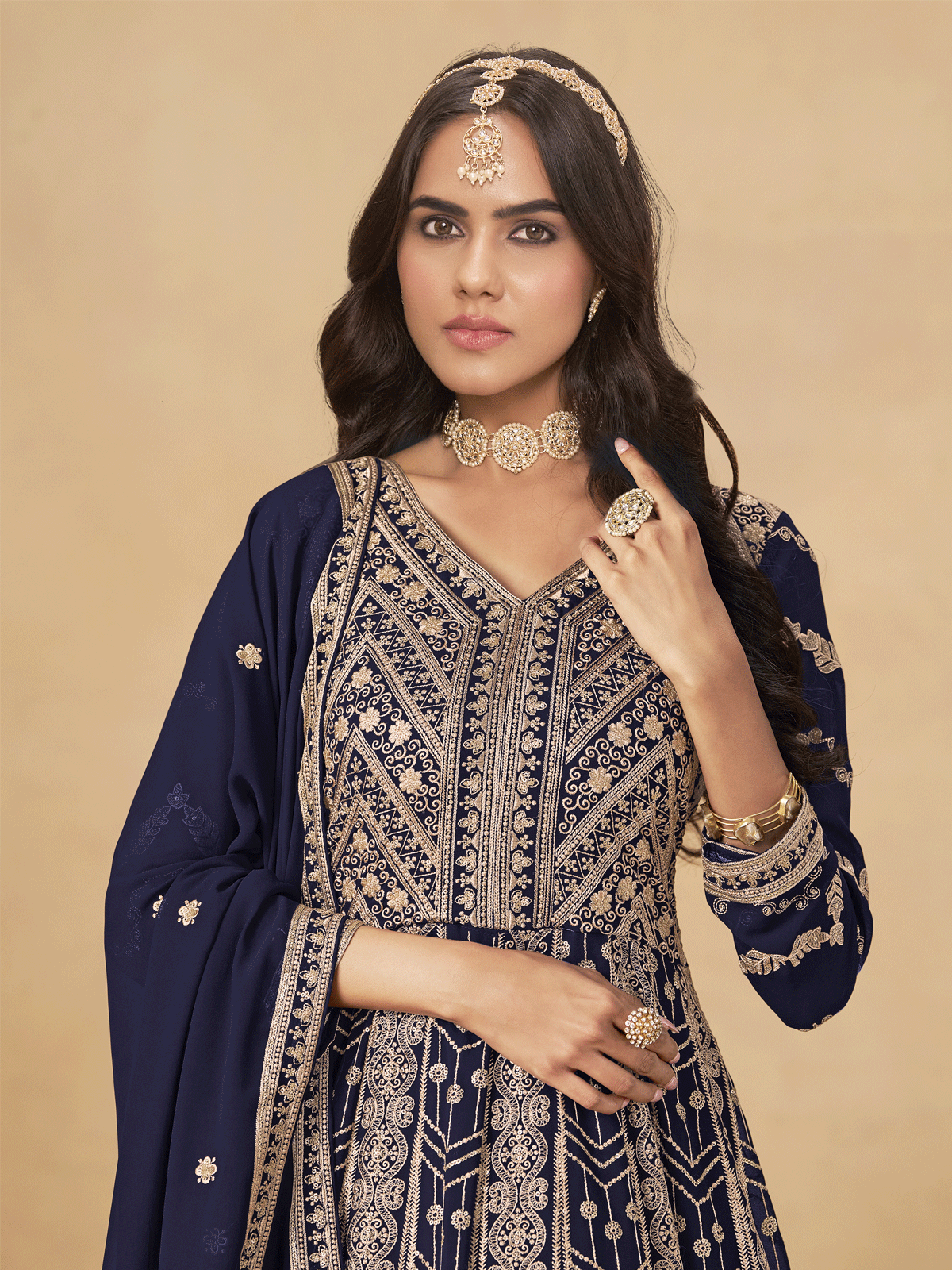 Navy blue Faux Georgette Anarkali Suit that embodies festive sophistication through its gracefully flowing A-line silhouette. Adorned with intricate zari sequin and thread embroidery, the kameez features meticulously crafted geometric and floral motifs that create a regal visual narrative. The fabric's natural drape combines elegance with structural integrity, making it an exceptional choice for Diwali, Eid, engagement celebrations, Raksha Bandhan, wedding receptions, and Sangeet functions. A versatile investment piece that transitions seamlessly across your festive occasions.