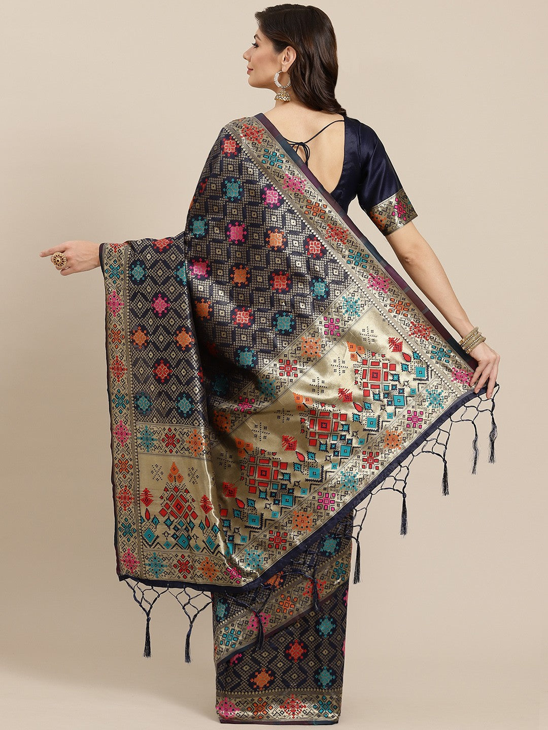 This silky blend saree features an elegant navy blue and golden color combination, with a stunning woven design and zari detailing. The woven design borders add a touch of sophistication to this traditional Indian garment. Comes with an unstitched blouse piece for a custom fit.