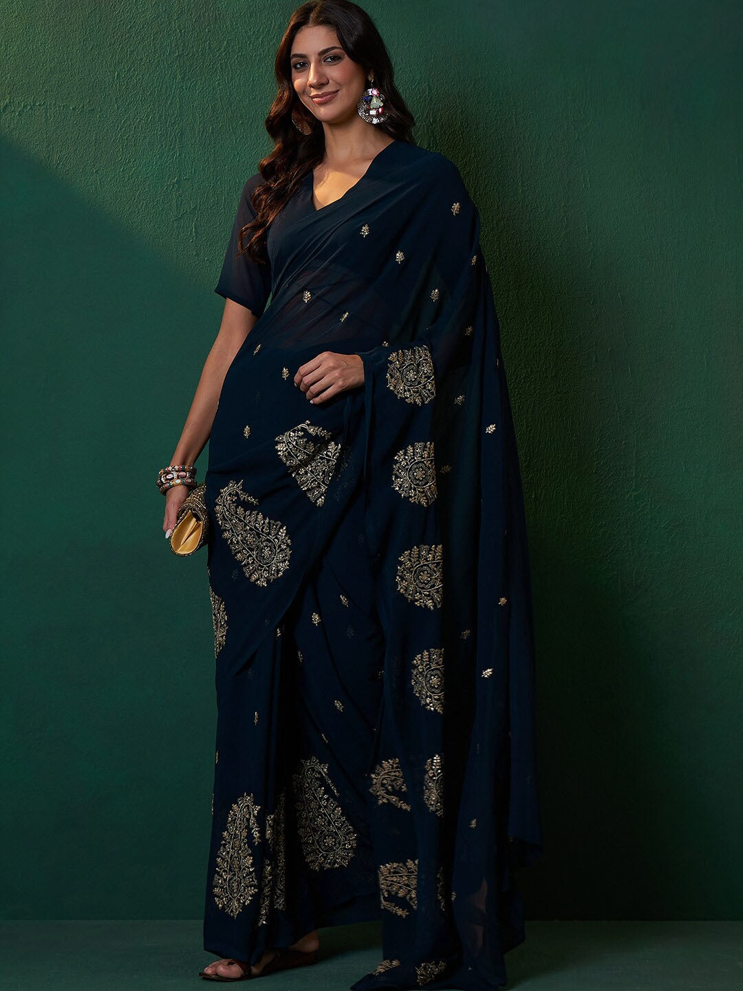 This stunning Navy Blue Paisley Embroidered Sequined Zari Saree features a rich navy-blue color and intricate paisley embroidery. The sequined zari adds a touch of elegance and glamour. Comes with an unstitched blouse piece, perfect for a customizable fit. Please note that the model's blouse is for representation only; refer to the image for the actual blouse piece.