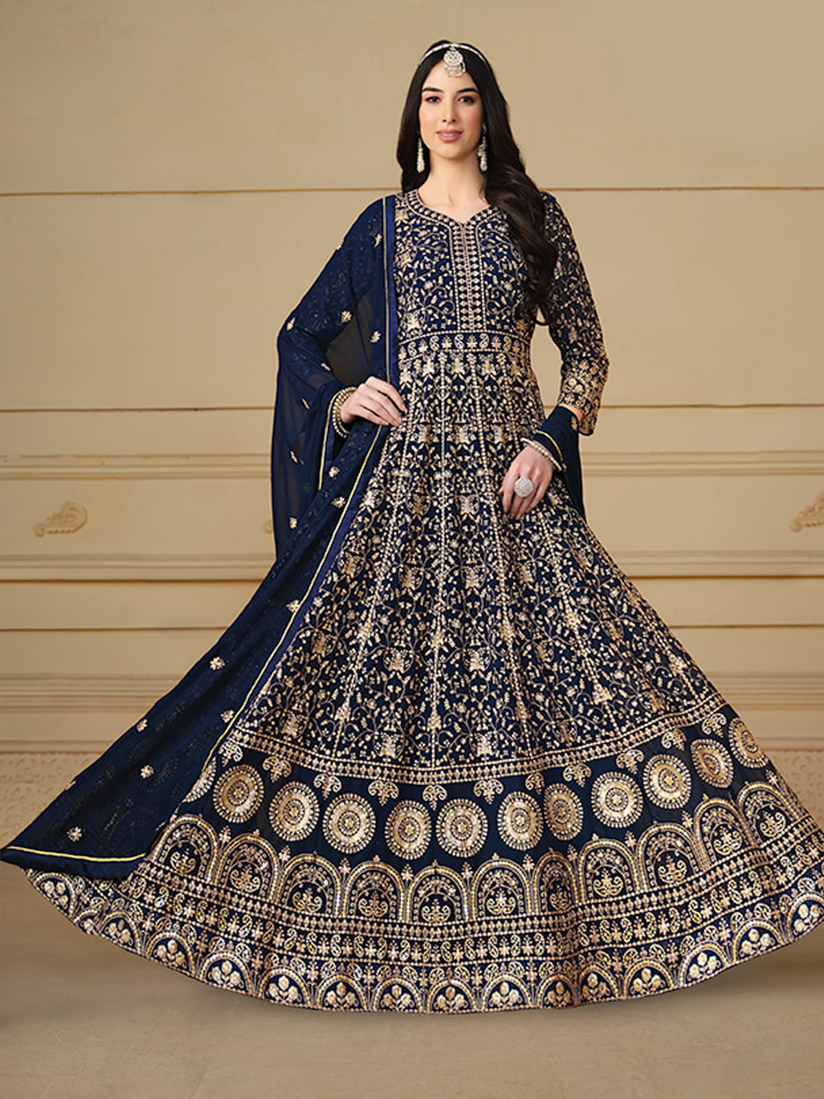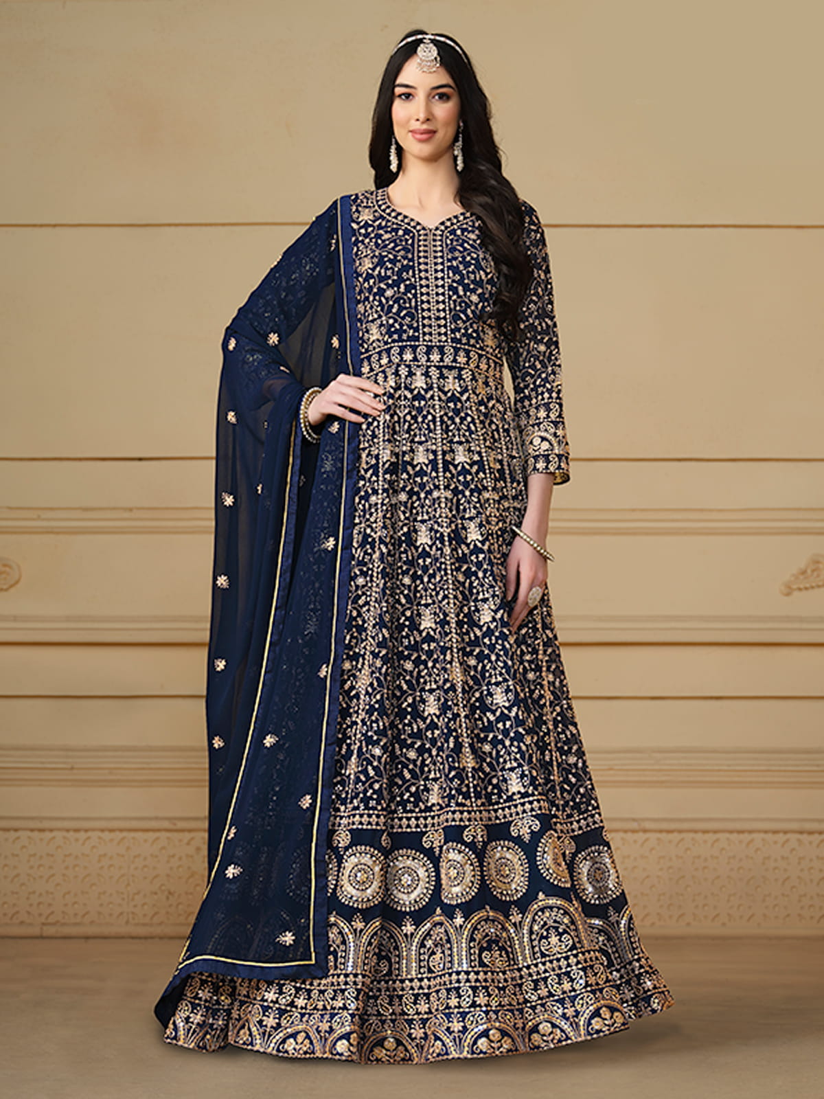 Get ready to turn heads with our Navy Blue Sequence Embroidery Georgette Anarkali Suit. This stunning Indian ethnic wear is perfect for any wedding occasion. The intricate reshamkari zari embroidery and delicate sequin work on the georgette anarkali top, paired with silk santoon pants and a beautiful embroidered georgette dupatta, will make you feel like a diva. Complete the look with golden jewelry and stilettos for a perfect Eid ensemble.