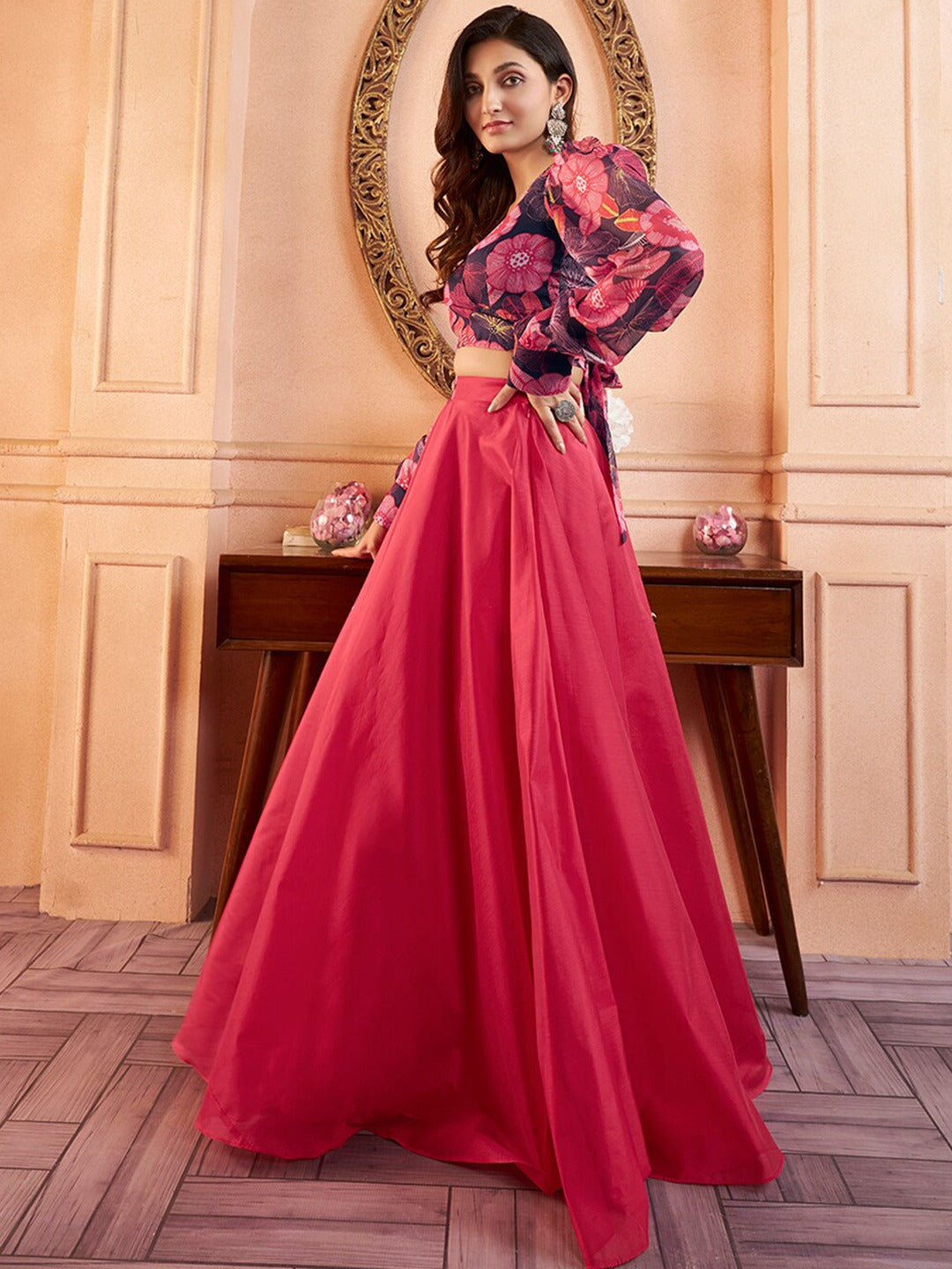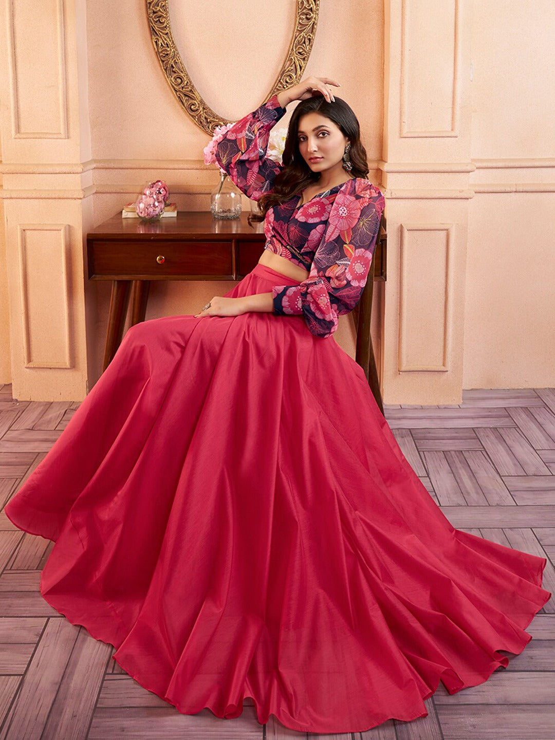 This co-ords set features a navy blue and fuchsia pink floral printed crop top with a v-neck and long sleeves, paired with a solid fuchsia pink maxi skirt with an elasticated waistband for easy wear. Perfect for a stylish and comfortable ensemble.