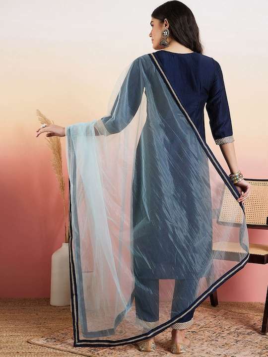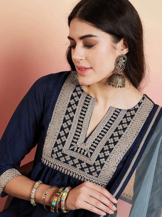 Elevate your ethnic wardrobe with our Navy Blue Yoke Design Pleated A-Line Kurta Set. The solid yoke design and A-line shape flatter any body shape, while the pleated style adds a touch of elegance. Complete with trousers and dupatta in a silk blend fabric, this set is perfect for any occasion.