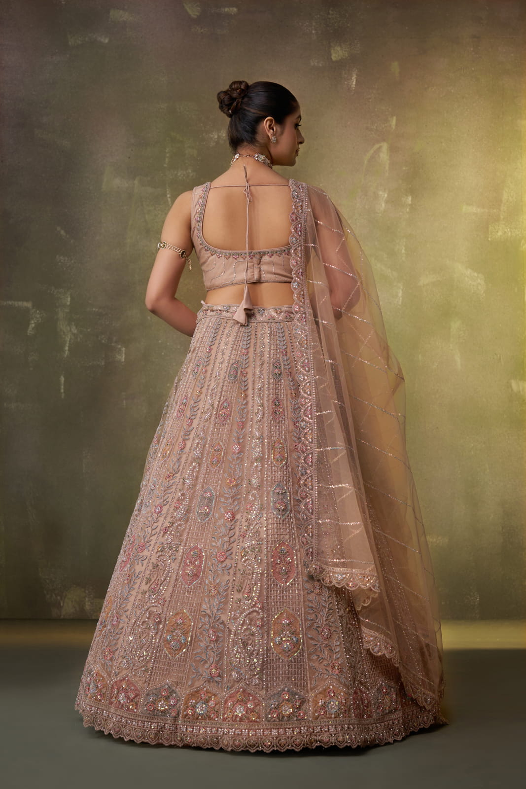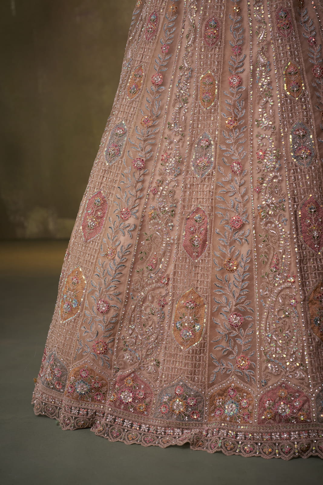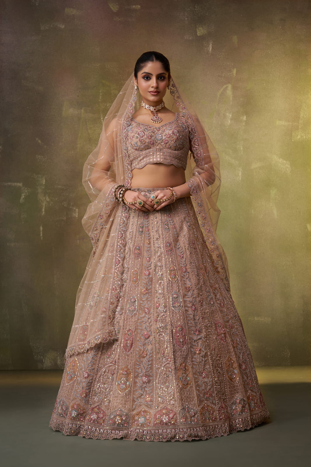 Elevate your festive wardrobe with this exquisite beige net lehenga set, meticulously crafted for the discerning bride. The semi-stitched lehenga features a generous 3.5-meter flair adorned with intricate sequins, stone work, and detailed thread embroidery, complemented by an elegant cutwork border at the hemline. The construction includes a single Shantoon inner with 18-inch Can Can and dual layers of Buckram for impeccable structure and movement. The matching beige net dupatta showcases heavy coding and embroidery with an ornate cutwork border, while the unstitched V-neck blouse in net fabric displays lavish sequins, coding, and thread embroidery work with attached Shantoon lining. This sophisticated ensemble combines traditional craftsmanship with premium materials, perfect for weddings and special occasions.