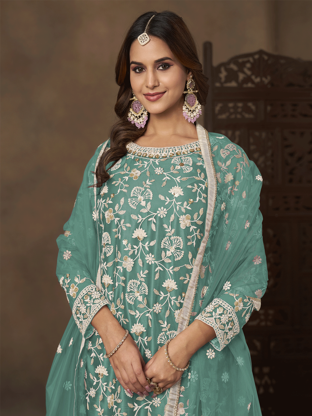 Embrace timeless sophistication with this Net Green Wedding Gharara Style Suit from Inddus. Meticulously designed for brides and festive occasions, this ensemble showcases intricate sequin and thread embroidery that dances across luxurious net fabric. The gharara silhouette offers graceful movement and traditional elegance, while the verdant green hue radiates understated luxury. Perfect for weddings, engagements, and celebrations, this piece combines expert craftsmanship with refined aesthetics to create an unforgettable bridal moment.
