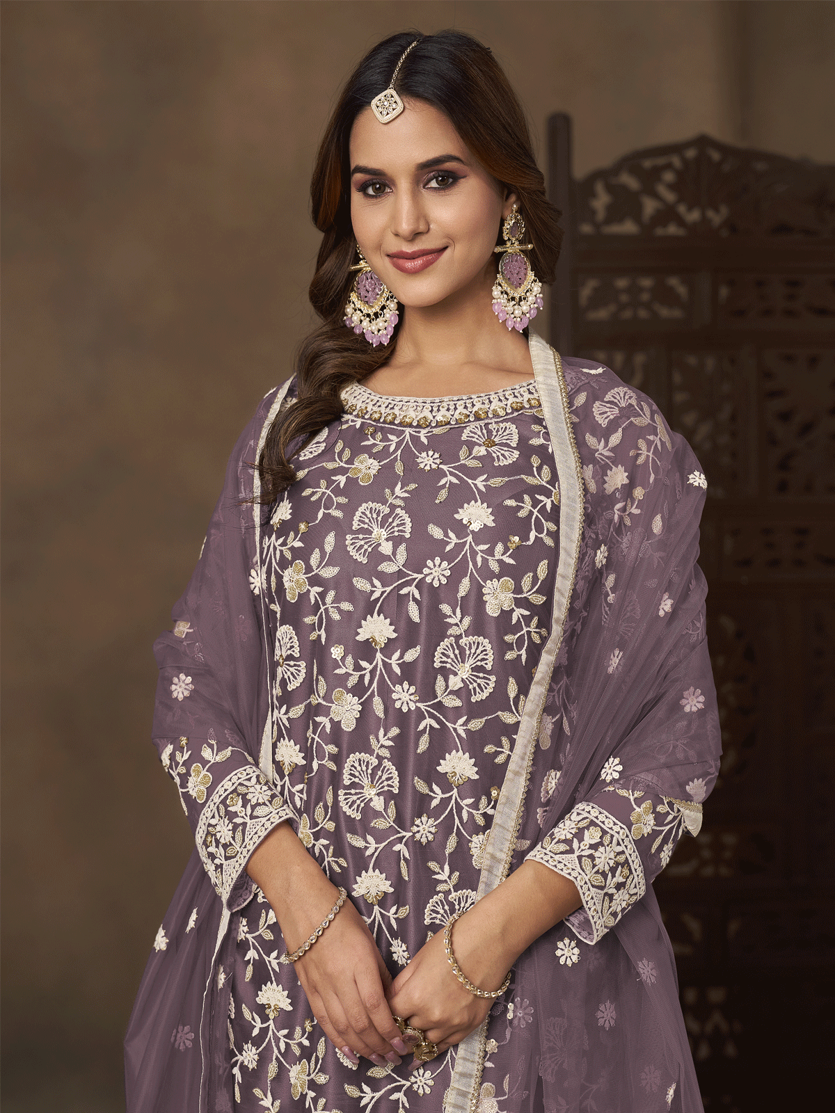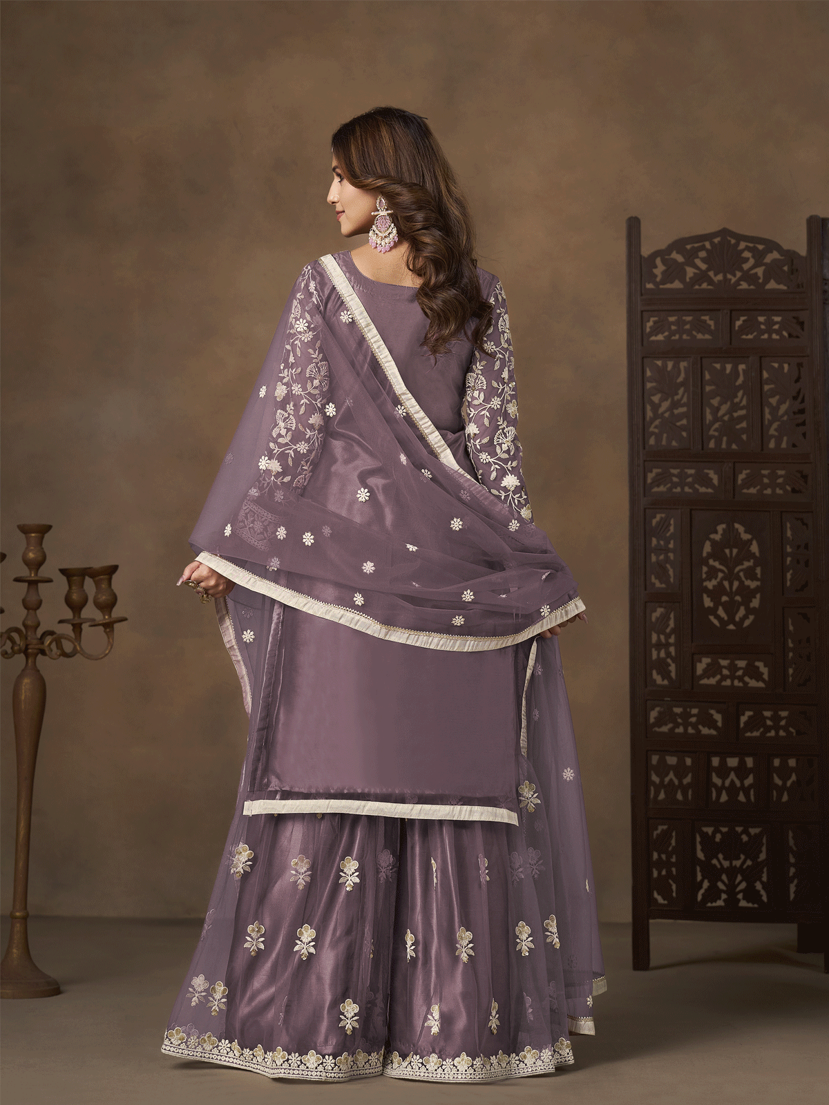 Embrace timeless sophistication with this Purple Net Wedding Gharara Style Suit from Inddus. Meticulously designed for brides and festive occasions, this ensemble showcases intricate sequin and thread embroidery that catches light beautifully against the delicate net fabric. The gharara silhouette offers traditional elegance with contemporary craftsmanship, making it an ideal choice for weddings, engagements, and special celebrations. The lightweight net construction ensures comfort throughout your event, while the ornate detailing creates a striking visual impact. Perfect for those seeking authentic Indian bridal wear that balances heritage aesthetics with refined luxury.