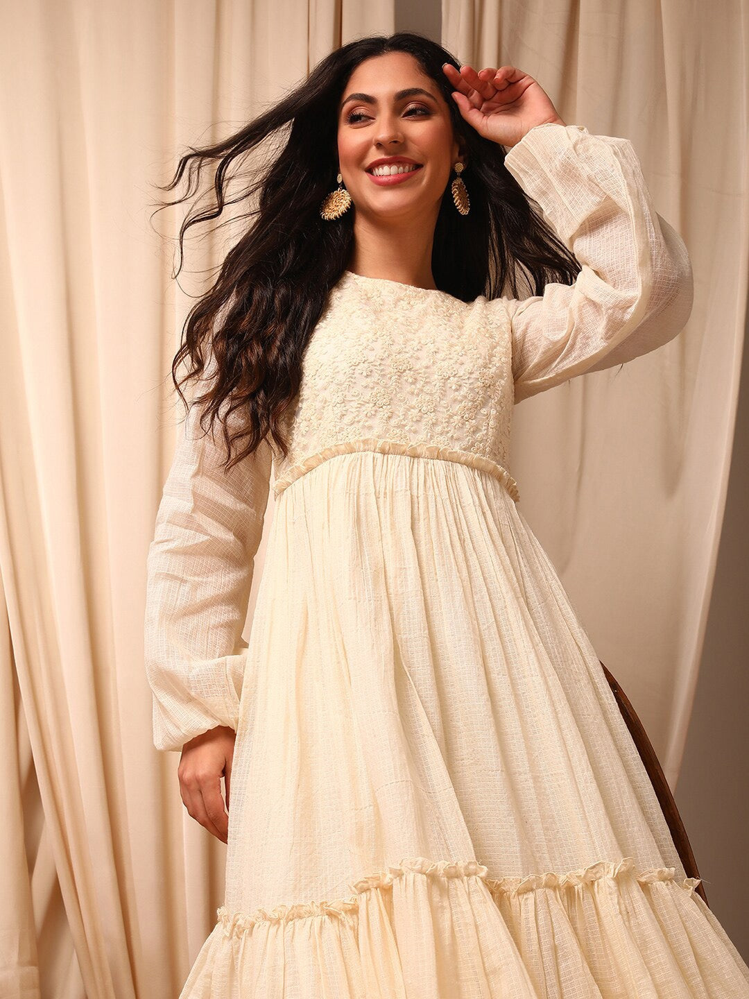 This off white ethnic dress features intricate embroidery and a flattering fit and flared shape. The round-neck, long regular sleeves and flared hem add a touch of elegance to the piece. Slip into this dress easily with the convenient slip-on closure. Perfect for any occasion, this dress combines style and comfort effortlessly.