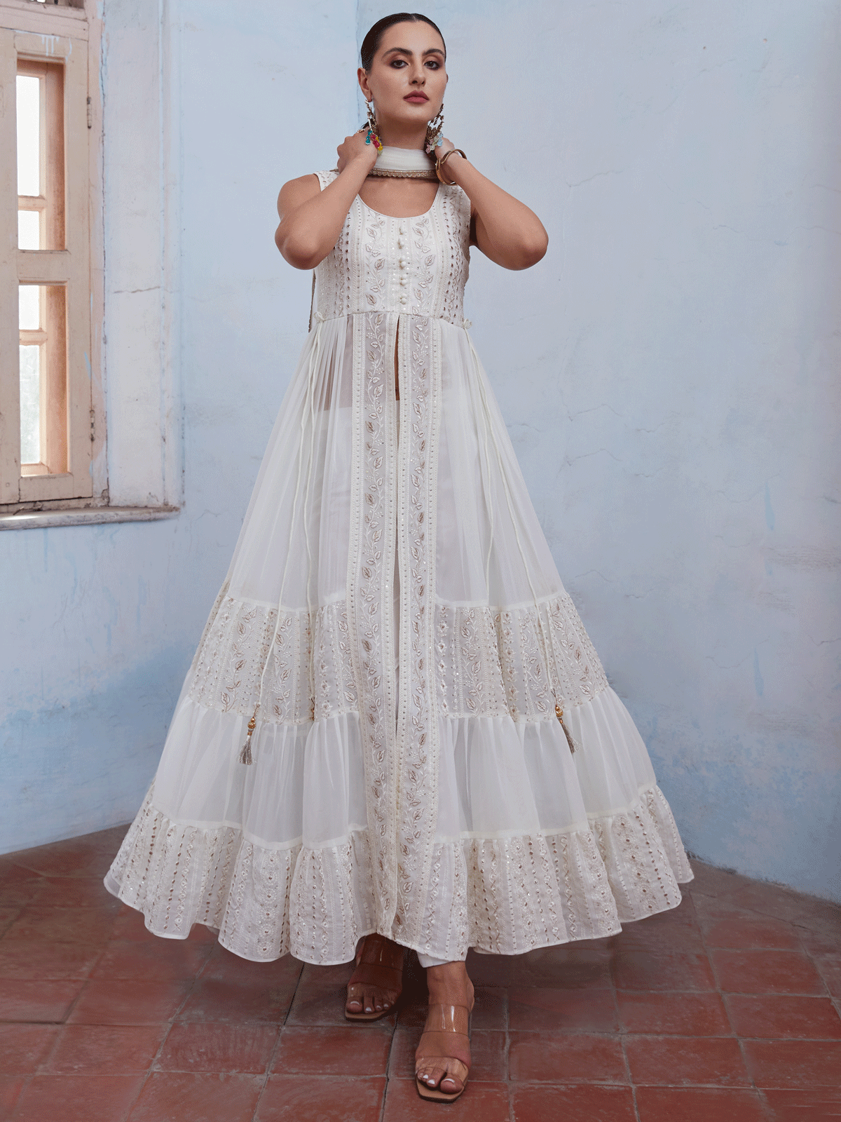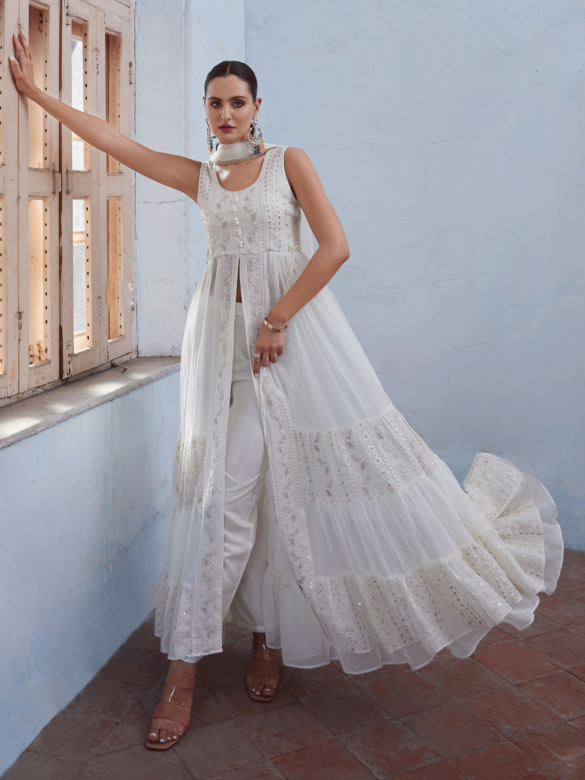 Be the star of any event with Inddus' Off White Front Slit Style Pant Style Party Wear Suit. Crafted with quality Georgette material, this suit is adorned with intricate embroidery, zari, thread, and sequins. Complete with pants and a net dupatta, it's perfect for weddings, parties, and formal events. Embrace both style and comfort with this chic and classy outfit.