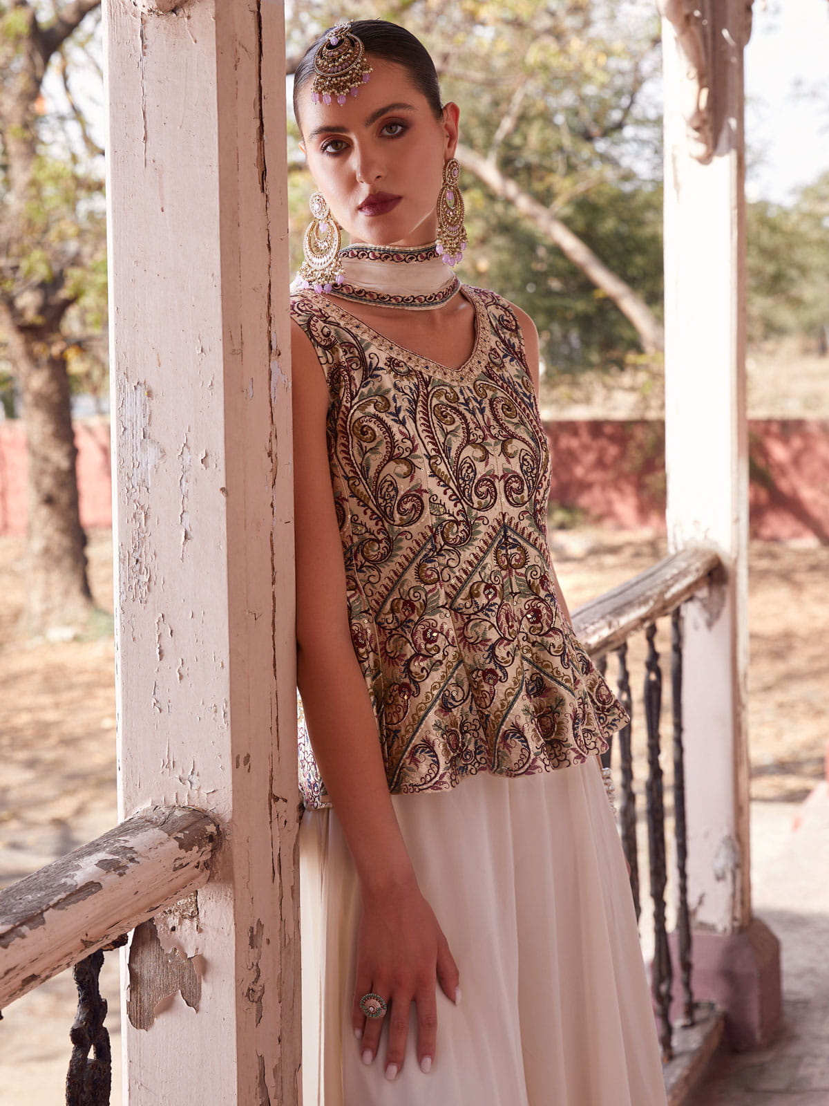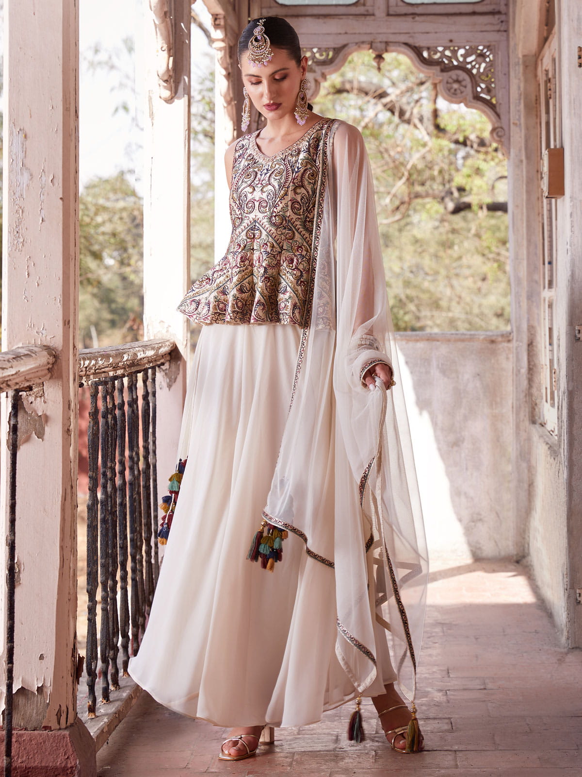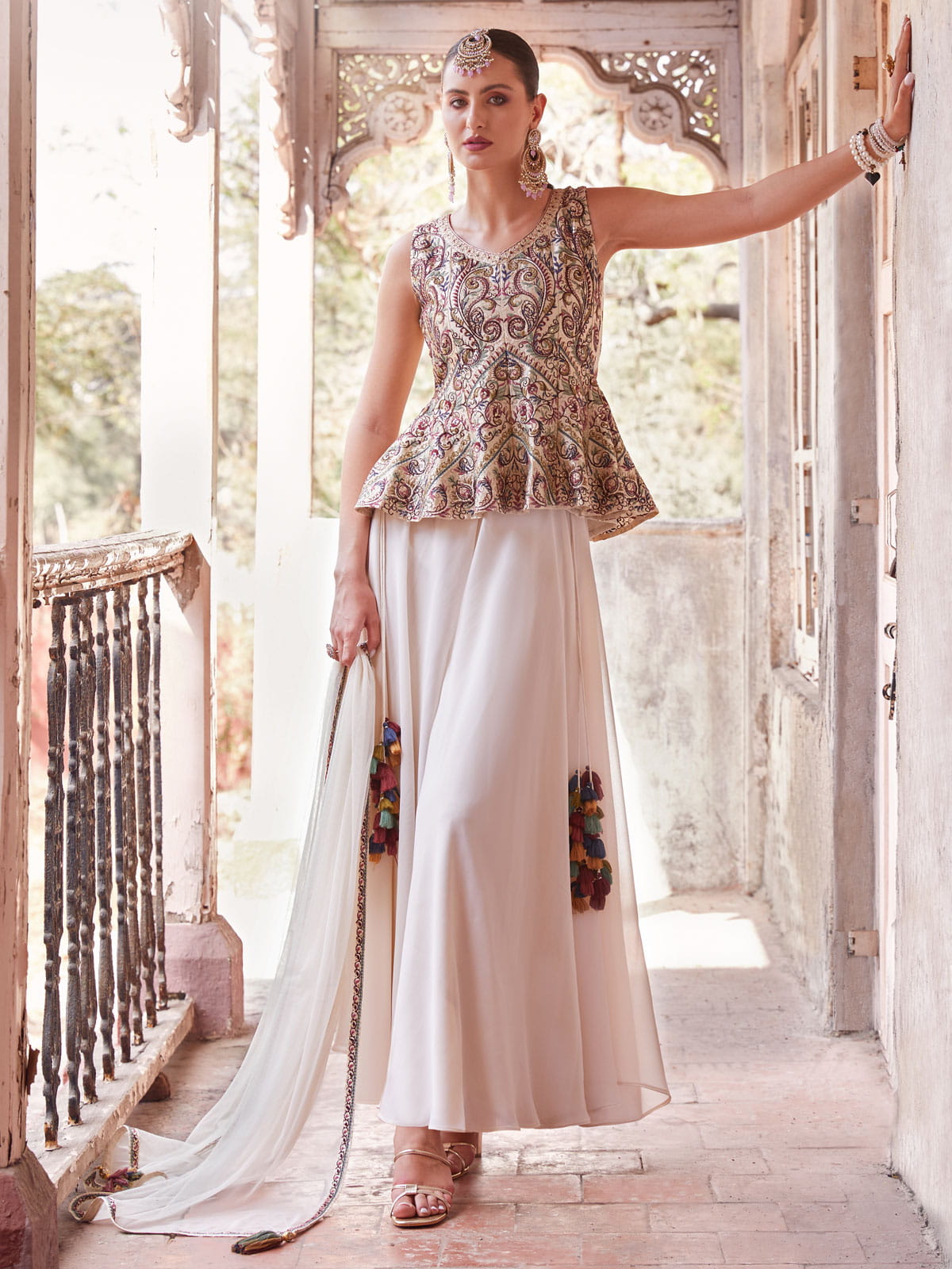 Expertly crafted for glamorous style and traditional elegance, this Off White Georgette Peplum Style Sharara Suit showcases delicate chikankari embroidery with resham thread, zari, and sequin work. The short length kurti-style georgette top is paired with a pleated georgette sharara bottom and a minimal border and tassel embellished dupatta, adding the perfect touch of sophistication. Elevate your look for the wedding season with stylish heels and studded earrings.