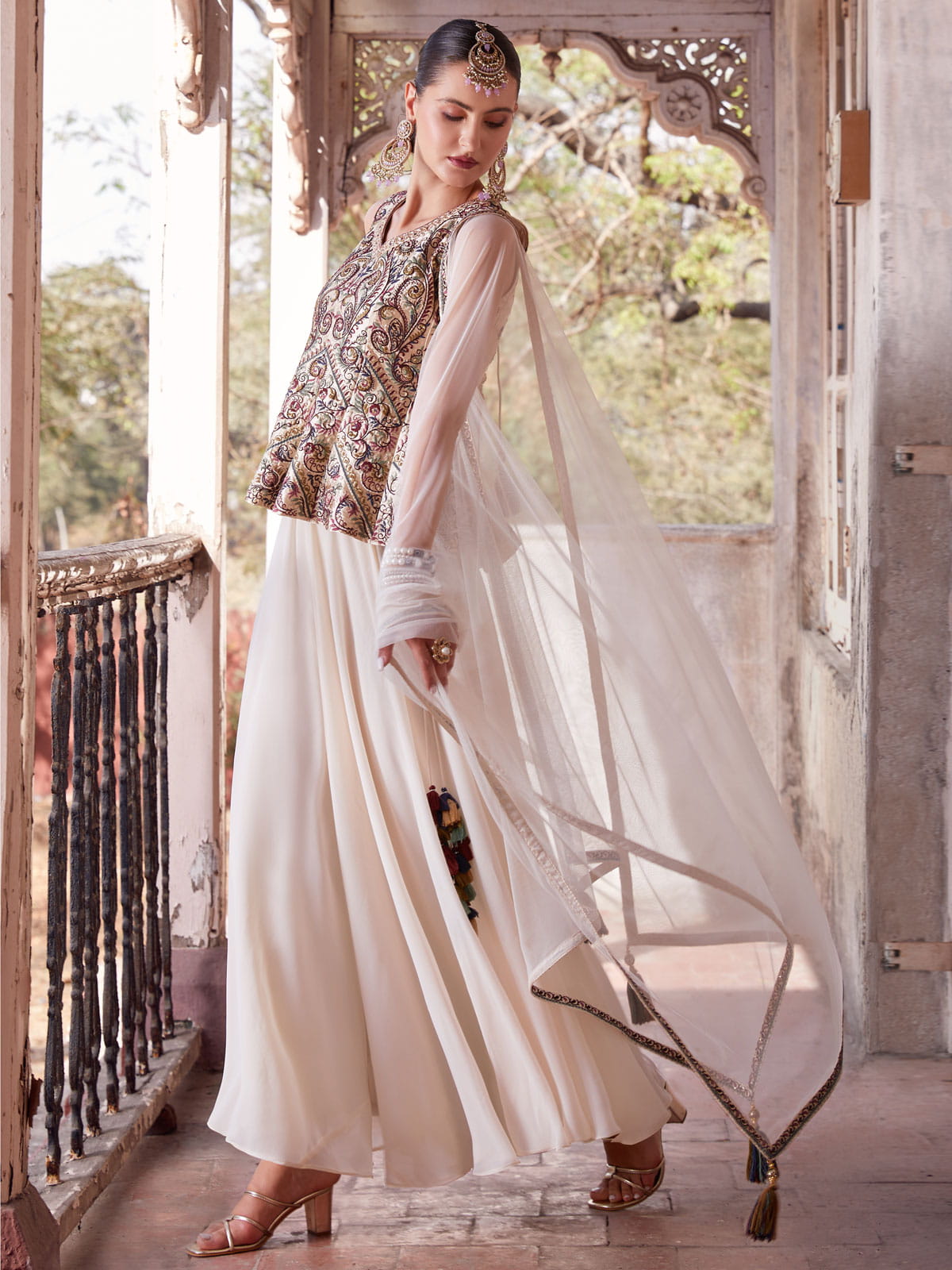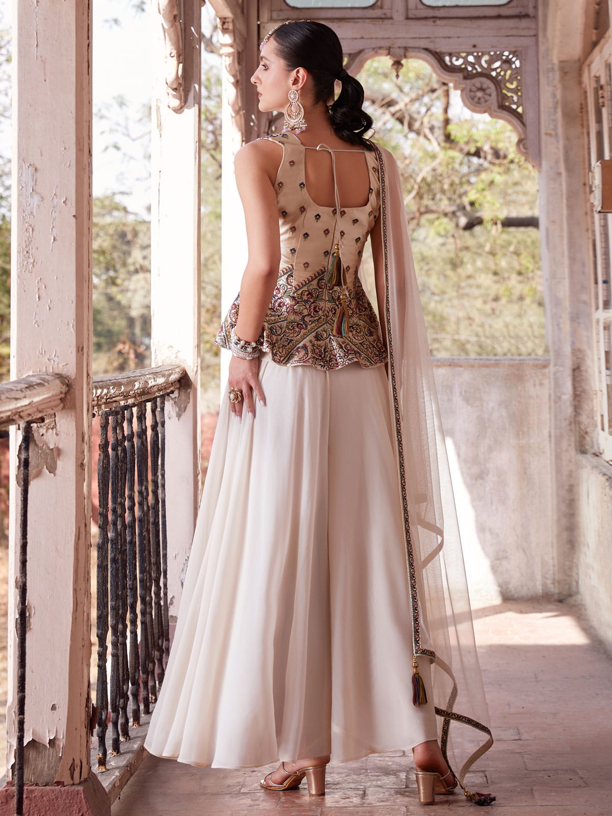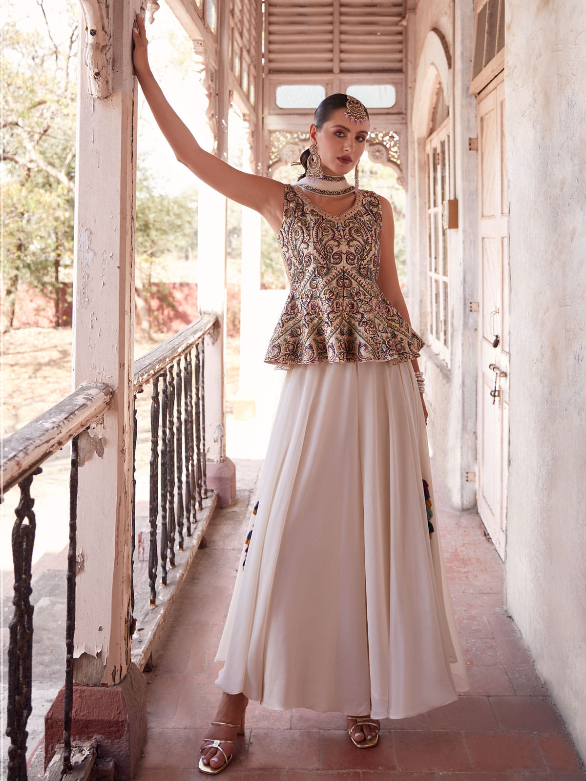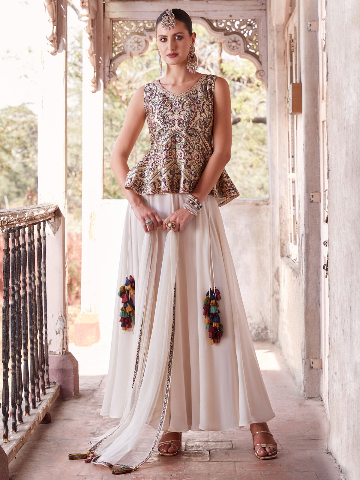 Expertly crafted for glamorous style and traditional elegance, this Off White Georgette Peplum Style Sharara Suit showcases delicate chikankari embroidery with resham thread, zari, and sequin work. The short length kurti-style georgette top is paired with a pleated georgette sharara bottom and a minimal border and tassel embellished dupatta, adding the perfect touch of sophistication. Elevate your look for the wedding season with stylish heels and studded earrings.
