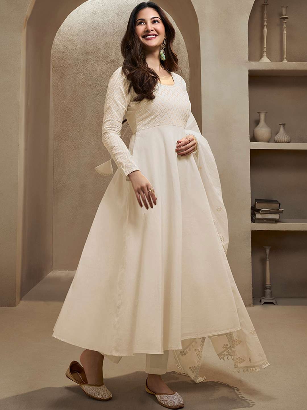 The Off white Sequinned Embroidered Empire Thread Work Anarkali Kurta with Trousers & Dupatta is a sophisticated and elegant ensemble. The Kurta features embroidered stripes and a flattering Anarkali shape with empire style. The Trousers are solid with a partially elasticated waistband for comfort. The set is made of a high-quality, machine-woven cotton blend fabric.