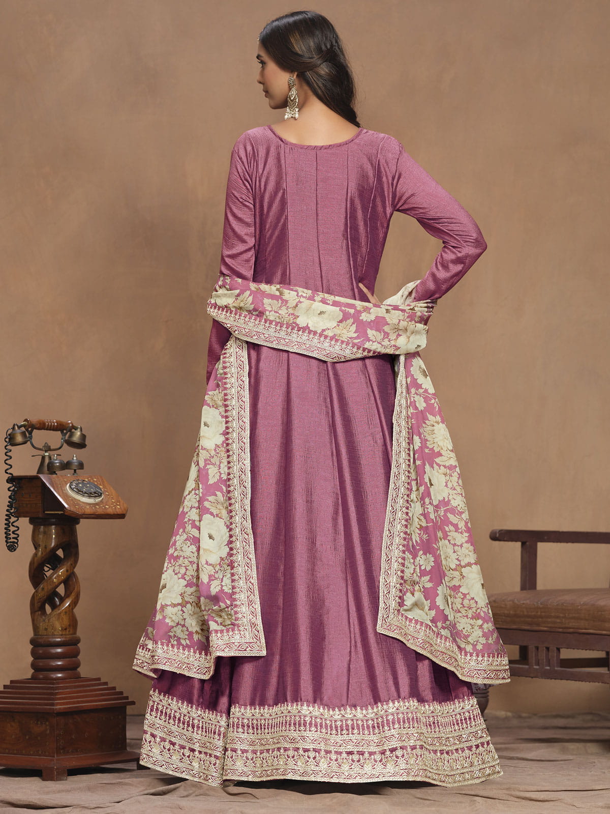 Elevate your bridal look with our Onion Pink Art Silk Embroidered Wedding Anarkali Gown With Dupatta. The intricate thread and zari embroidery, adorned with sequins, guarantees to spread cheers. The matching shantoon pant and printed organza dupatta complete the ensemble. Size of the unstitched kameez is 44 inches. Accessorize to your liking.